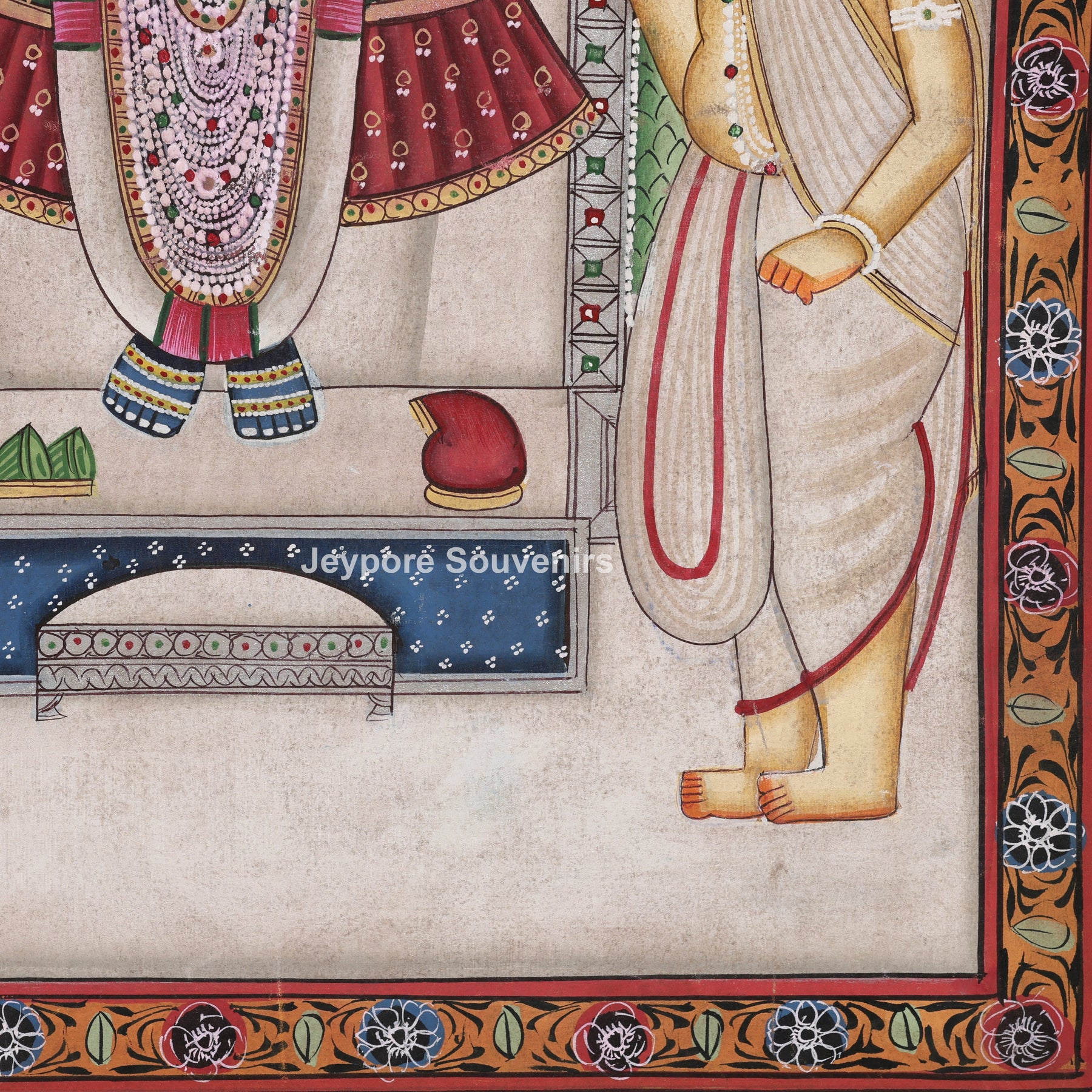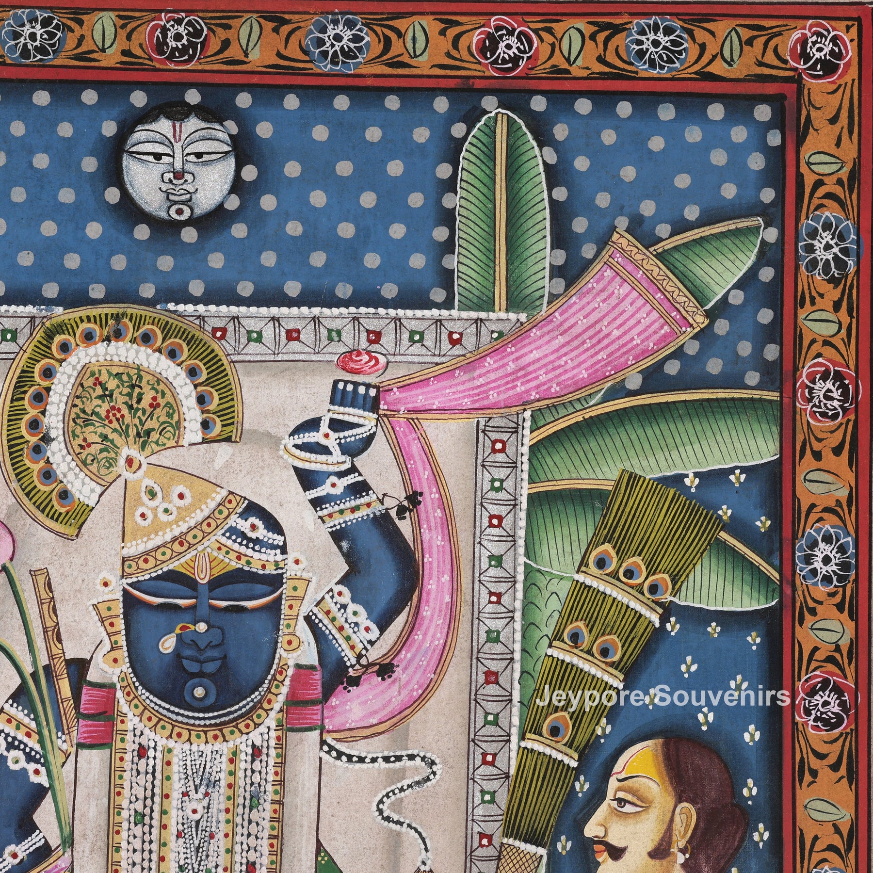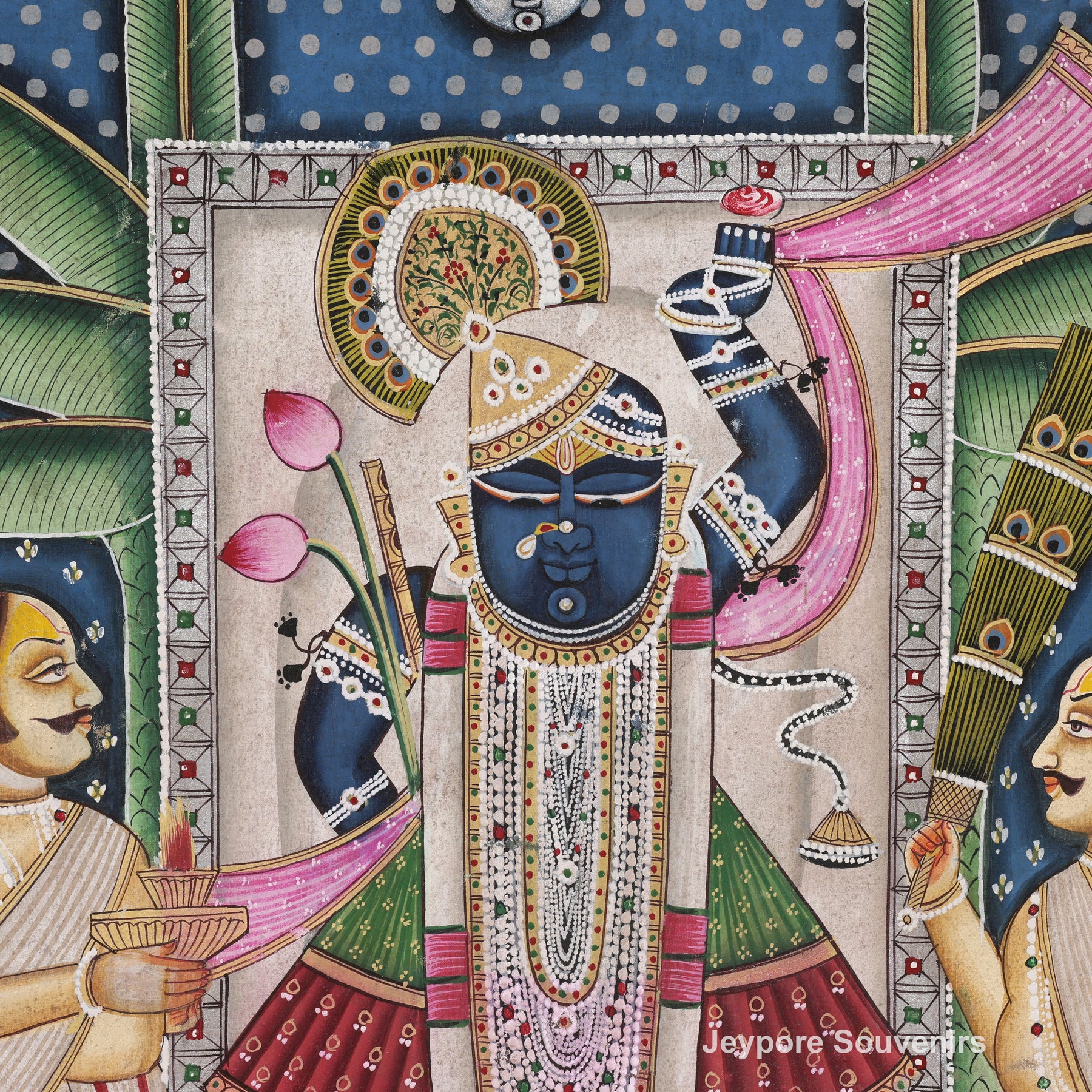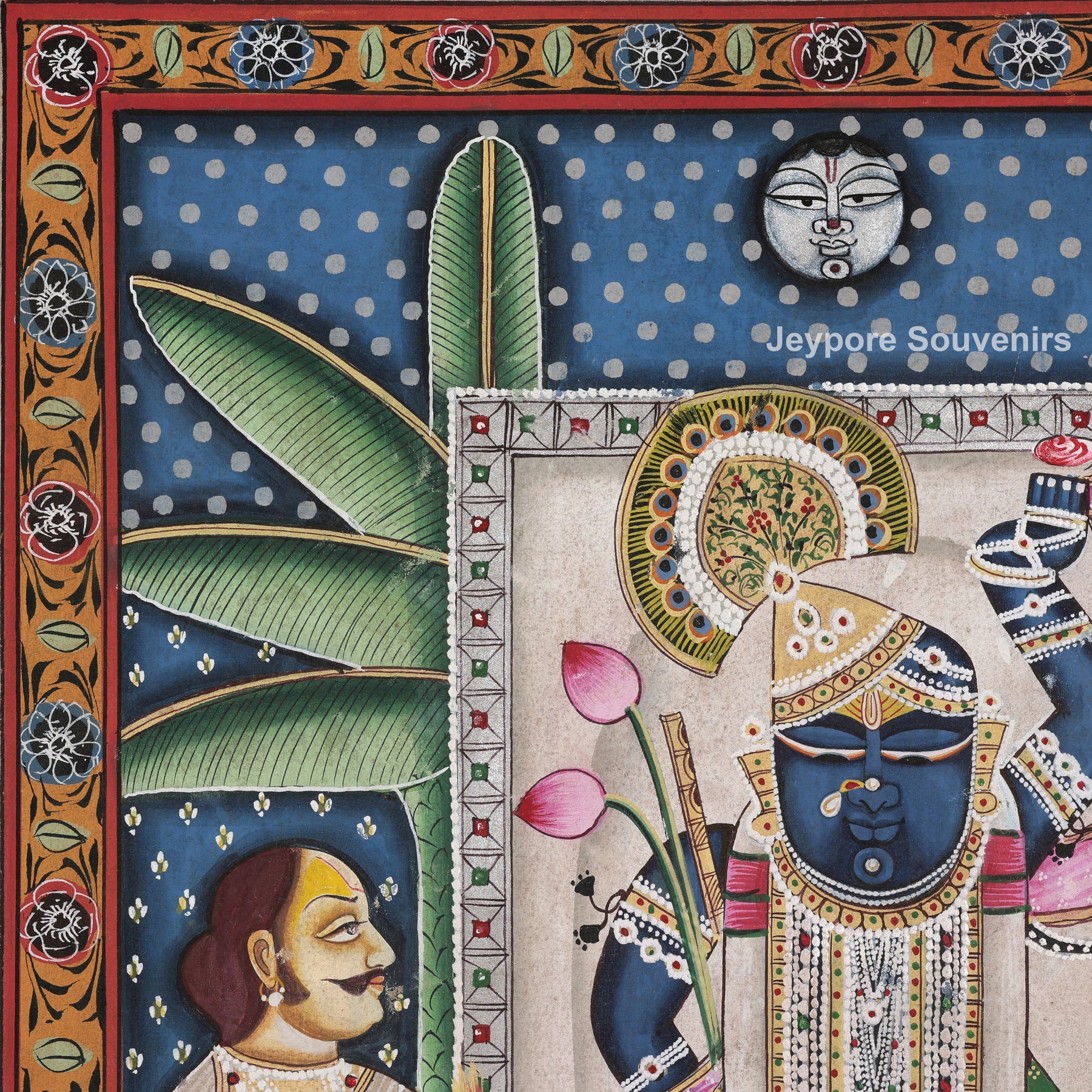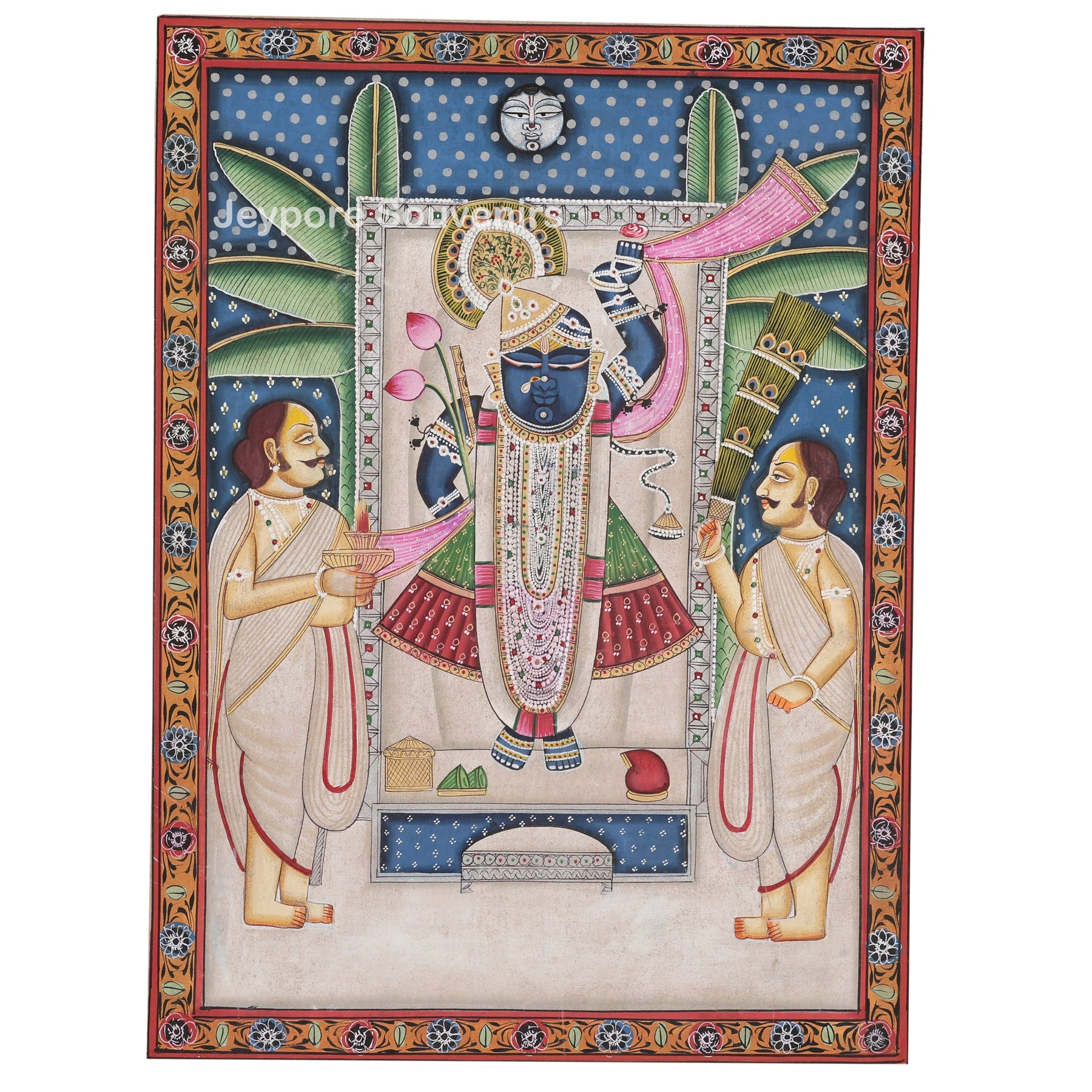 The painting is created using mineral and natural pigments/fabric colors. This traditional technique ensures the rich, vibrant hues, such as the distinct indigo-blue of Shrinathji, have lasting colorfastness and a classic, authentic finish.