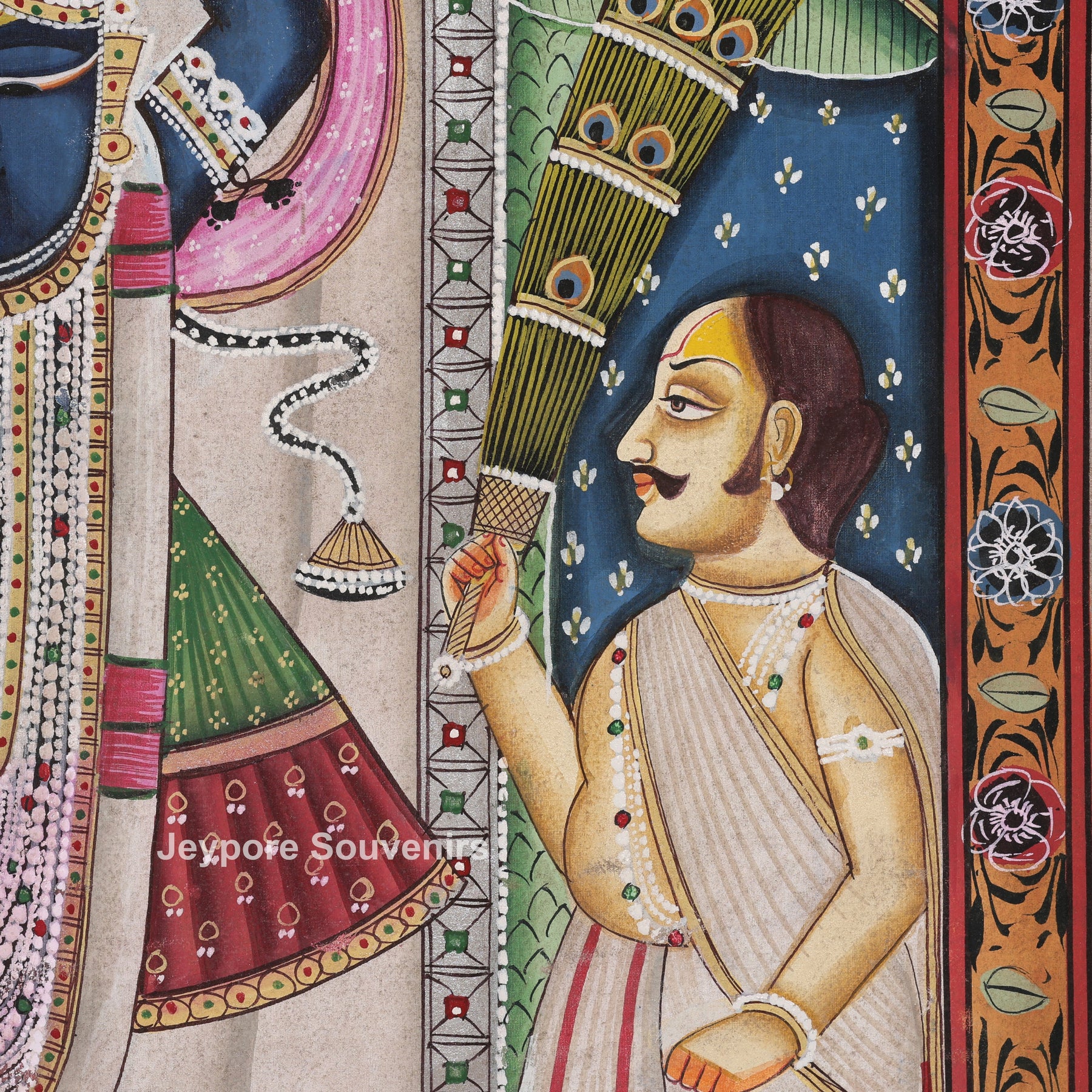 These figures are traditionally known as Sevaks (priests or attendants). They are integral to the Pichwai tradition, symbolizing the ritualistic worship (seva) offered to Lord Shrinathji, often seen holding items like a lotus, morchal (peacock fan), or ritual offerings.