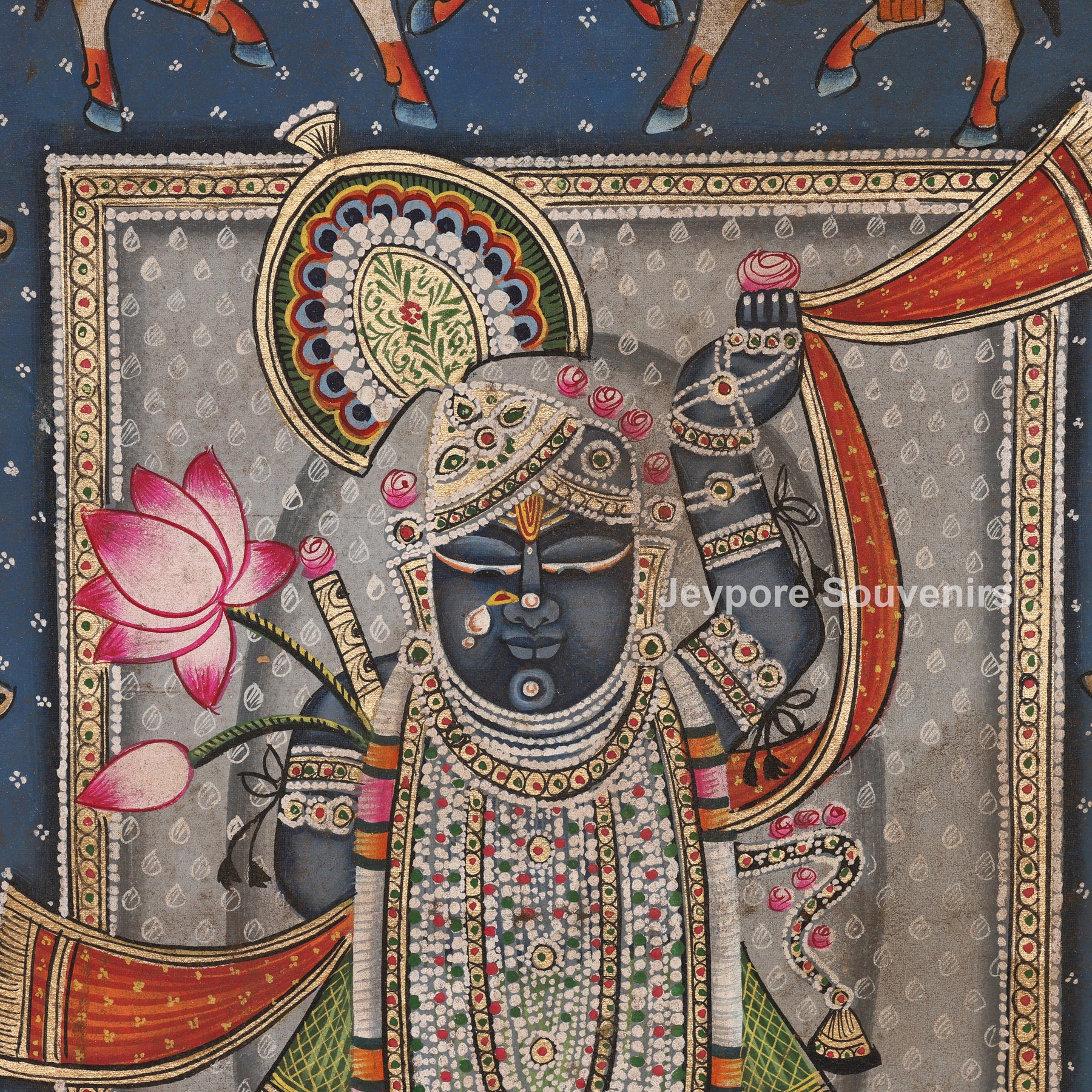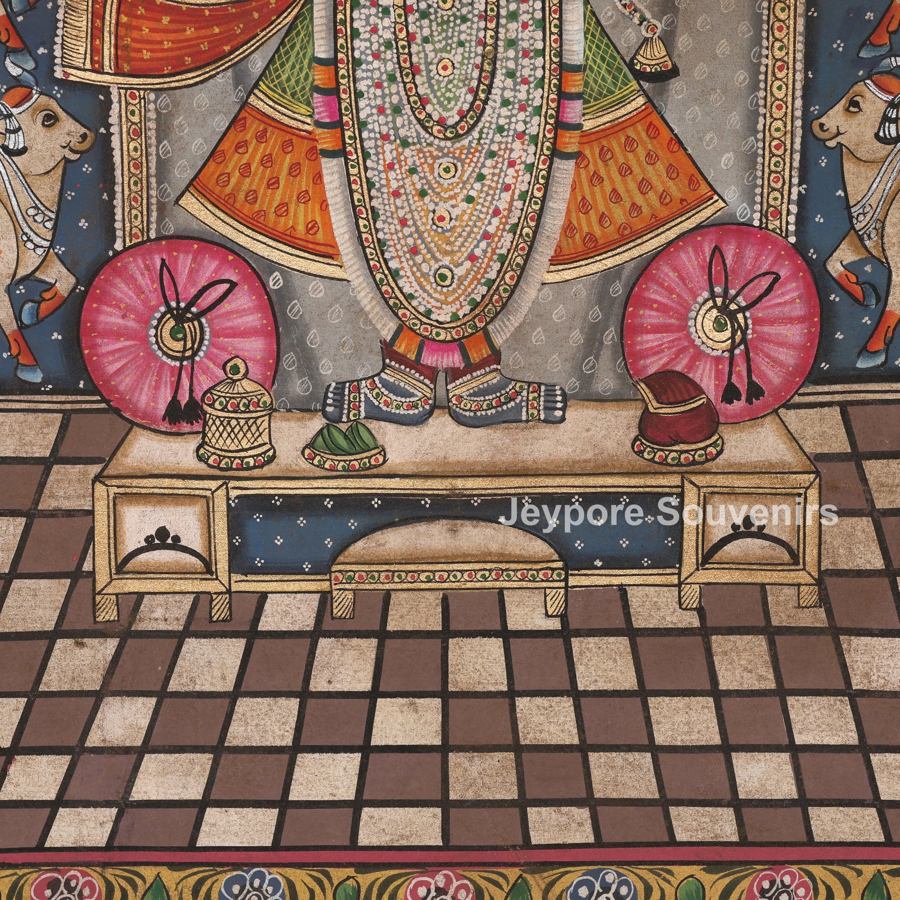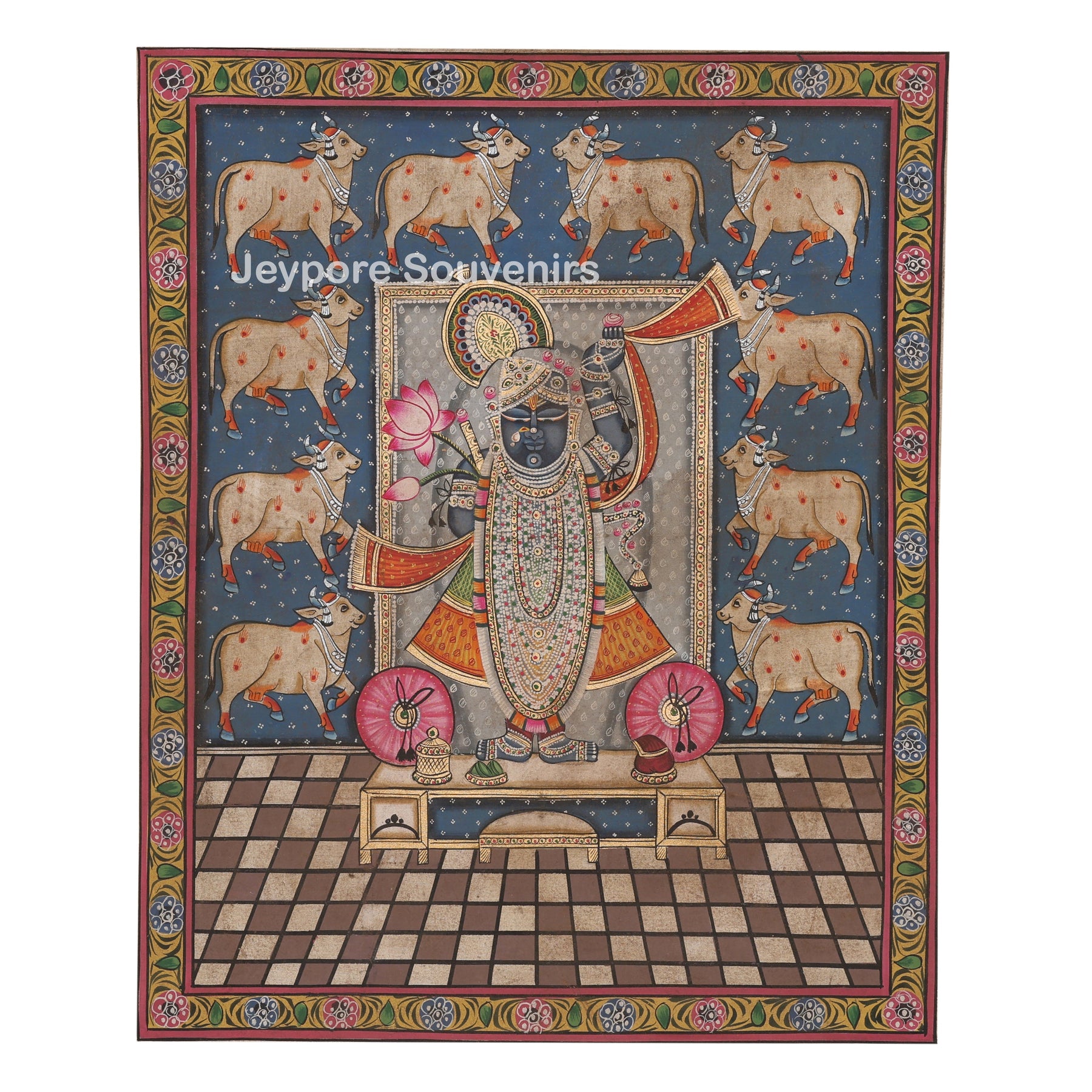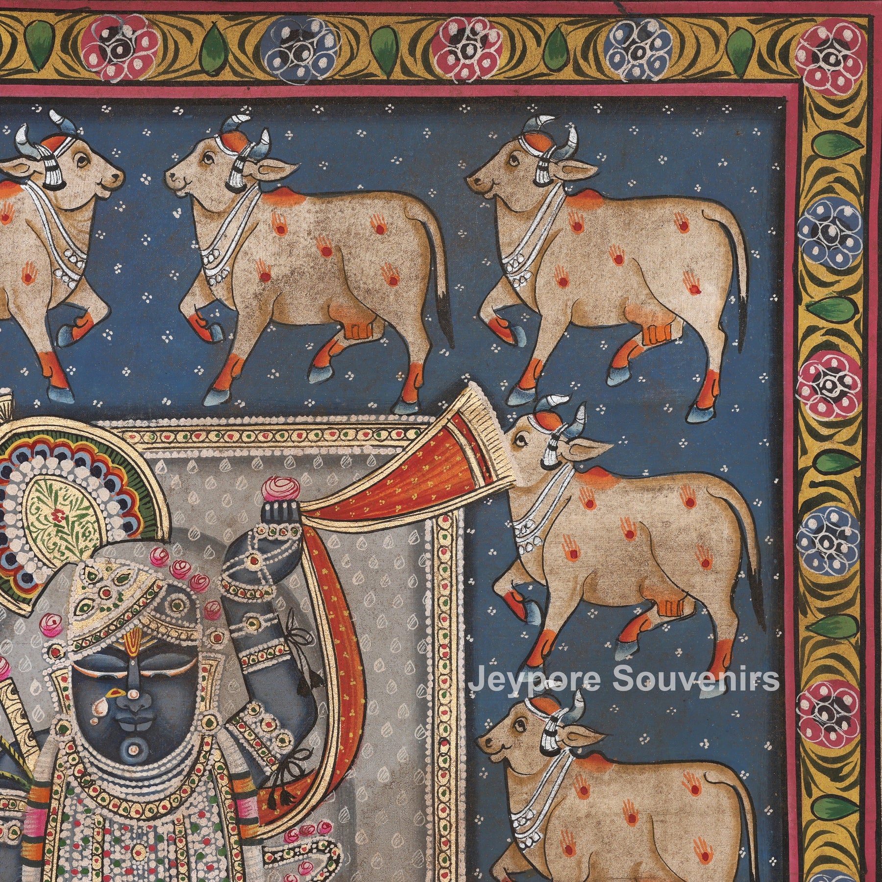 Immerse yourself in the divine beauty of traditional Indian art with this Pichwai Style Shrinathji Painting on Cotton Cloth. Inspired by the 400-year-old Nathdwara art form from Rajasthan, this exquisite hand-painted artwork beautifully depicts Lord Shrinathji an incarnation of Lord Krishna surrounded by sacred cows, symbolizing devotion, prosperity, and grace.