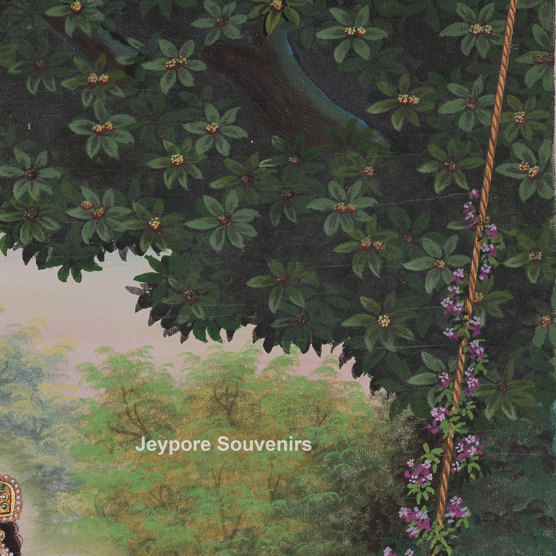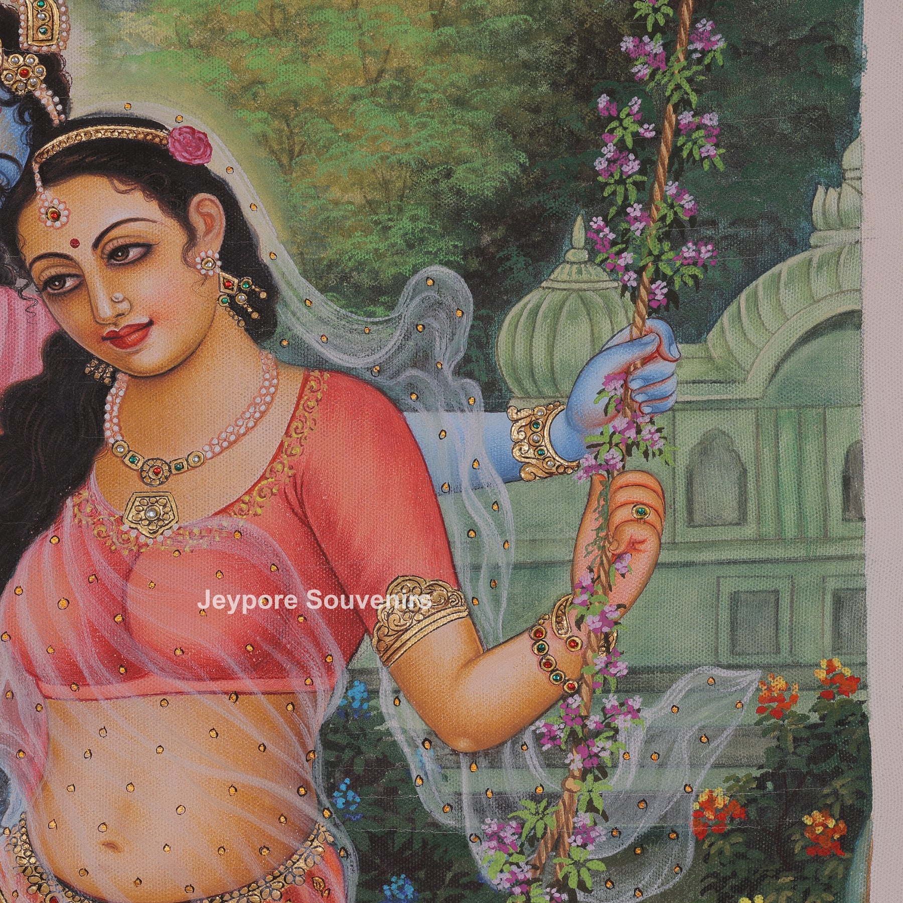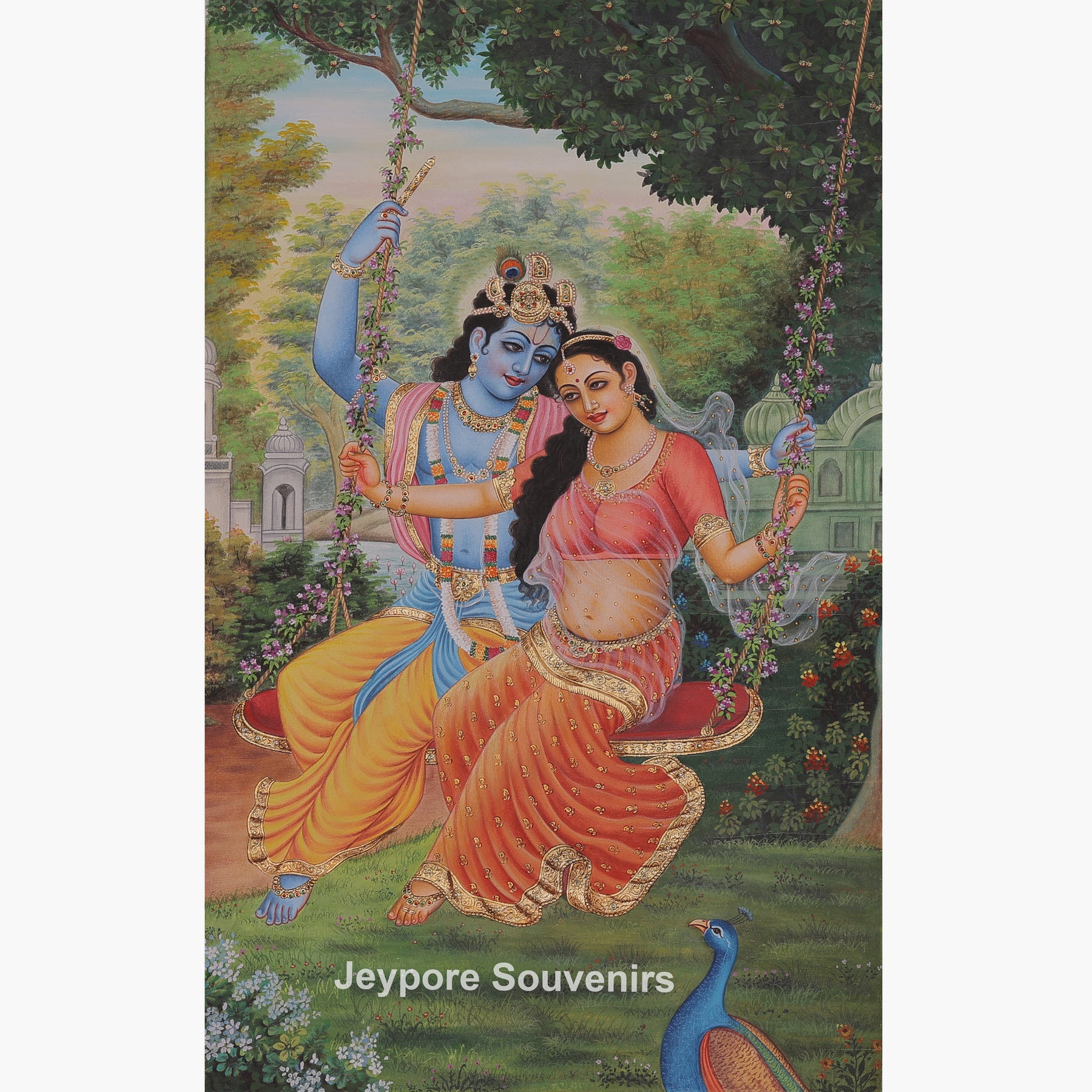 Krishna and radha on a garden swing canvas hand-painted artwork painting shows Krishna and Radha sitting together on a swing in a peaceful garden. Krishna is gently holding the swing while Radha sits close to him, showing love and calmness. Both are dressed in beautiful traditional clothes with detailed jewelry and soft expressions. Green trees, flowers, and old-style buildings can be seen in the background, creating a natural and serene setting. A peacock sits on the grass below, adding charm to the scene. Overall, the painting shows a moment of love, harmony, and quiet joy in nature.