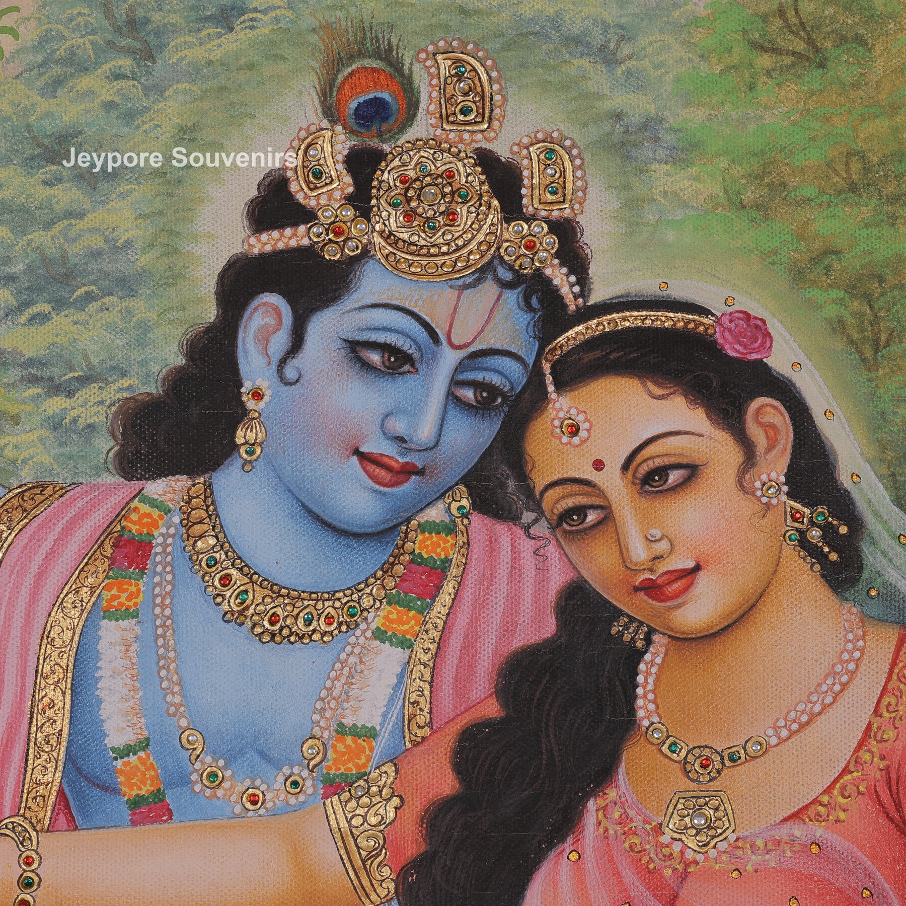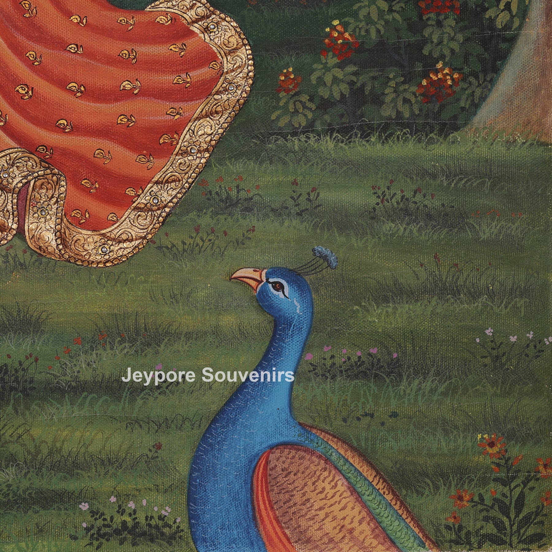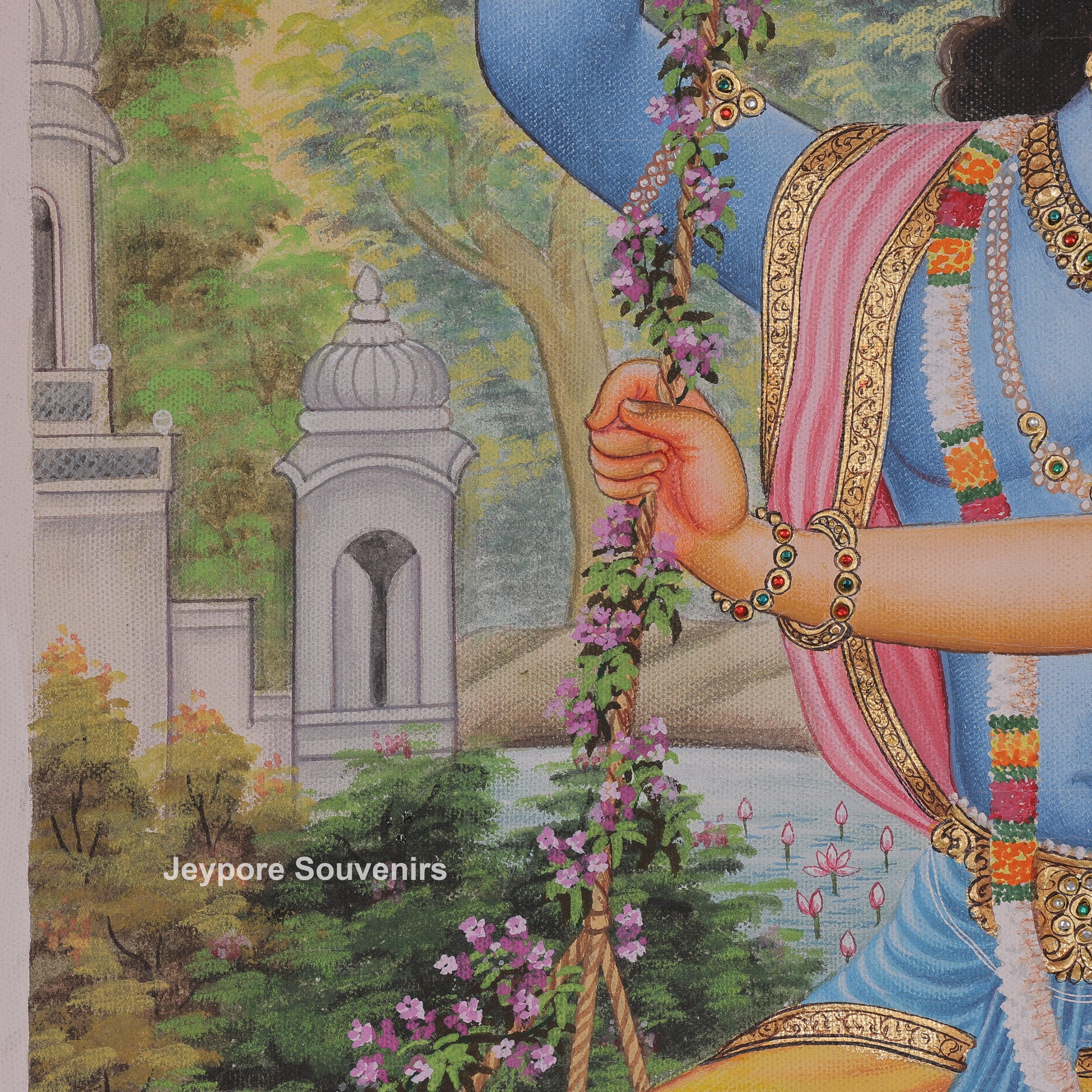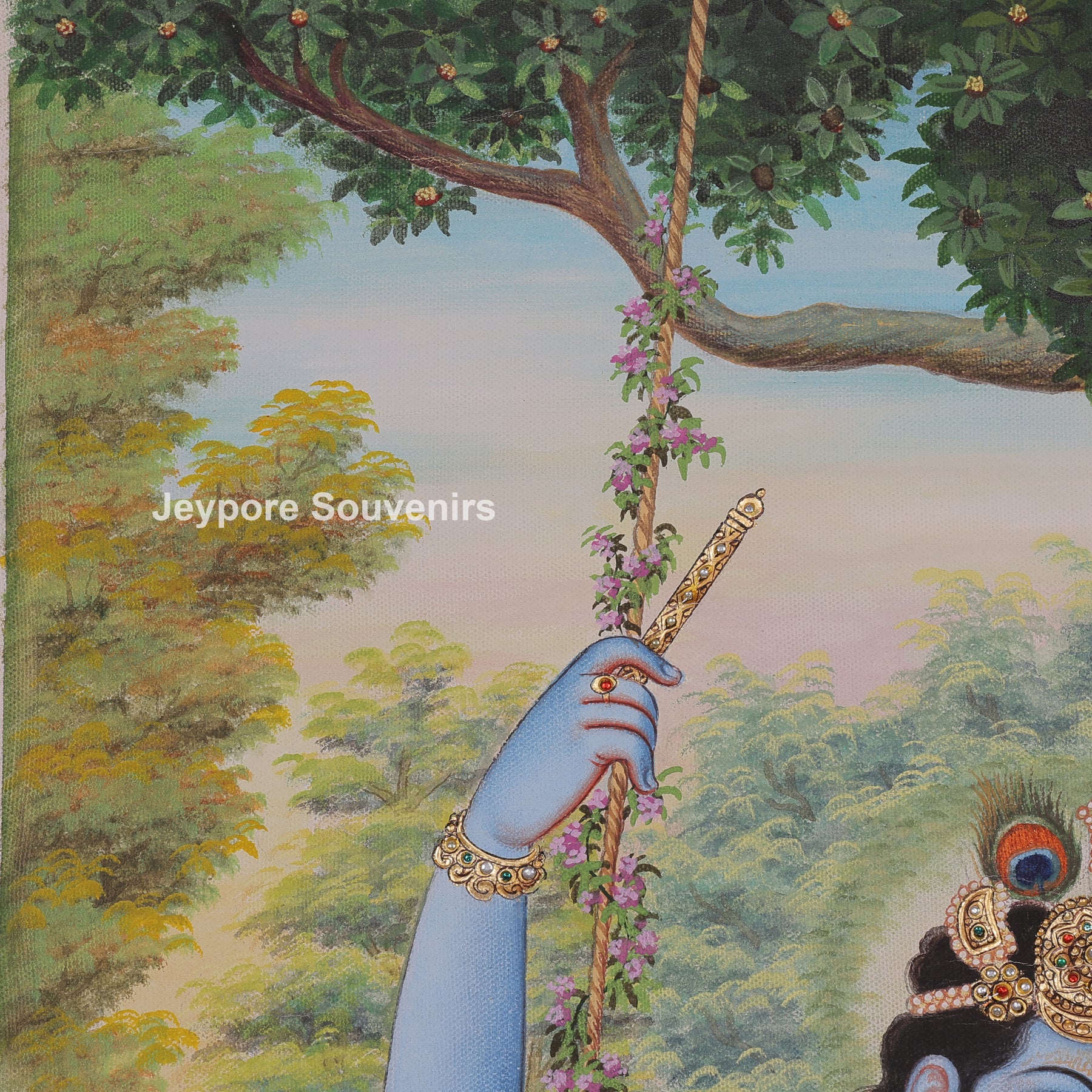 Krishna and radha on a garden swing canvas hand-painted artwork painting shows Krishna and Radha sitting together on a swing in a peaceful garden. Krishna is gently holding the swing while Radha sits close to him, showing love and calmness. Both are dressed in beautiful traditional clothes with detailed jewelry and soft expressions. Green trees, flowers, and old-style buildings can be seen in the background, creating a natural and serene setting. A peacock sits on the grass below, adding charm to the scene. Overall, the painting shows a moment of love, harmony, and quiet joy in nature.
