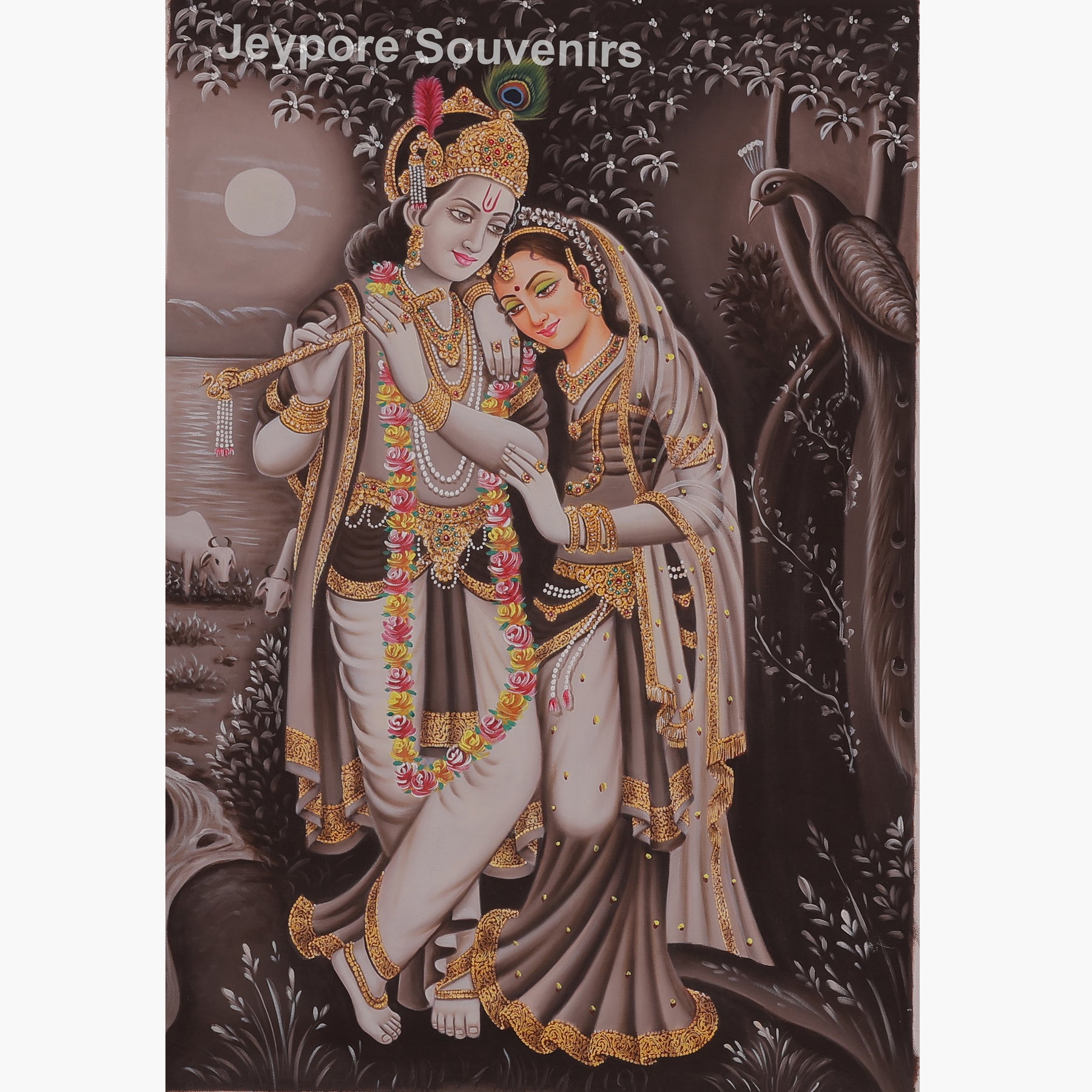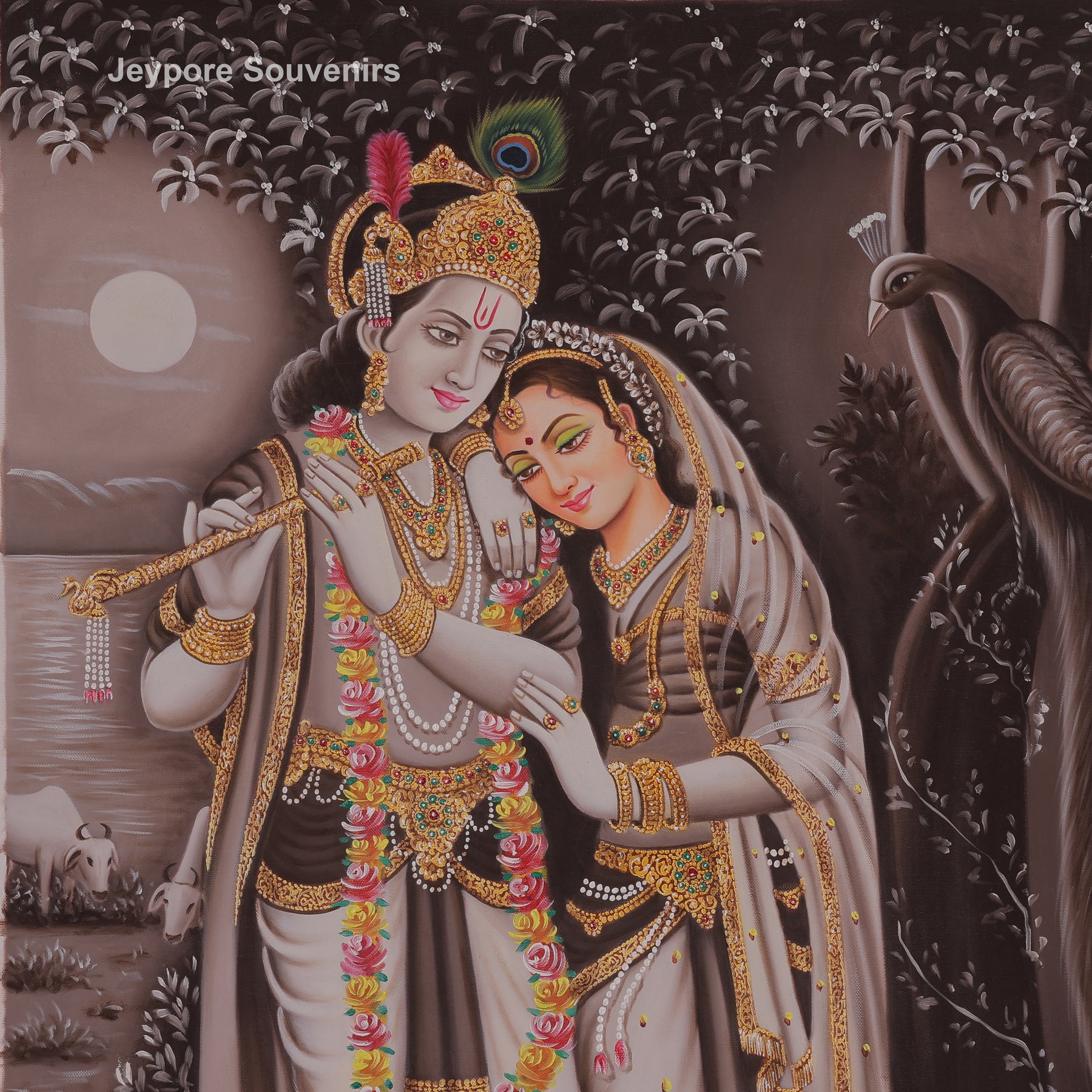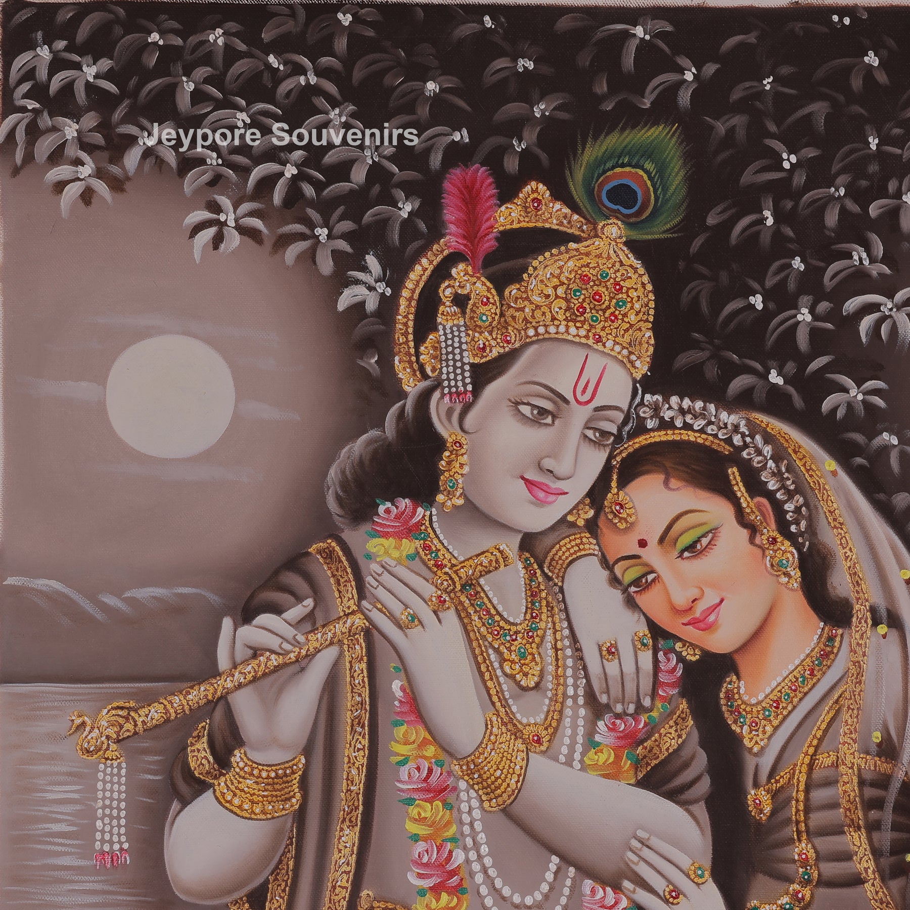 This painting Lord Krishna and Radha standing close together in a calm, moonlit forest. Krishna is holding a flute, and Radha is gently resting beside him. They are wearing beautiful traditional clothes and jewelry. Their expressions are peaceful and full of love. The background has trees, a river, animals, and a soft moonlight, creating a serene and divine atmosphere. The scene represents love, harmony, and devotion.