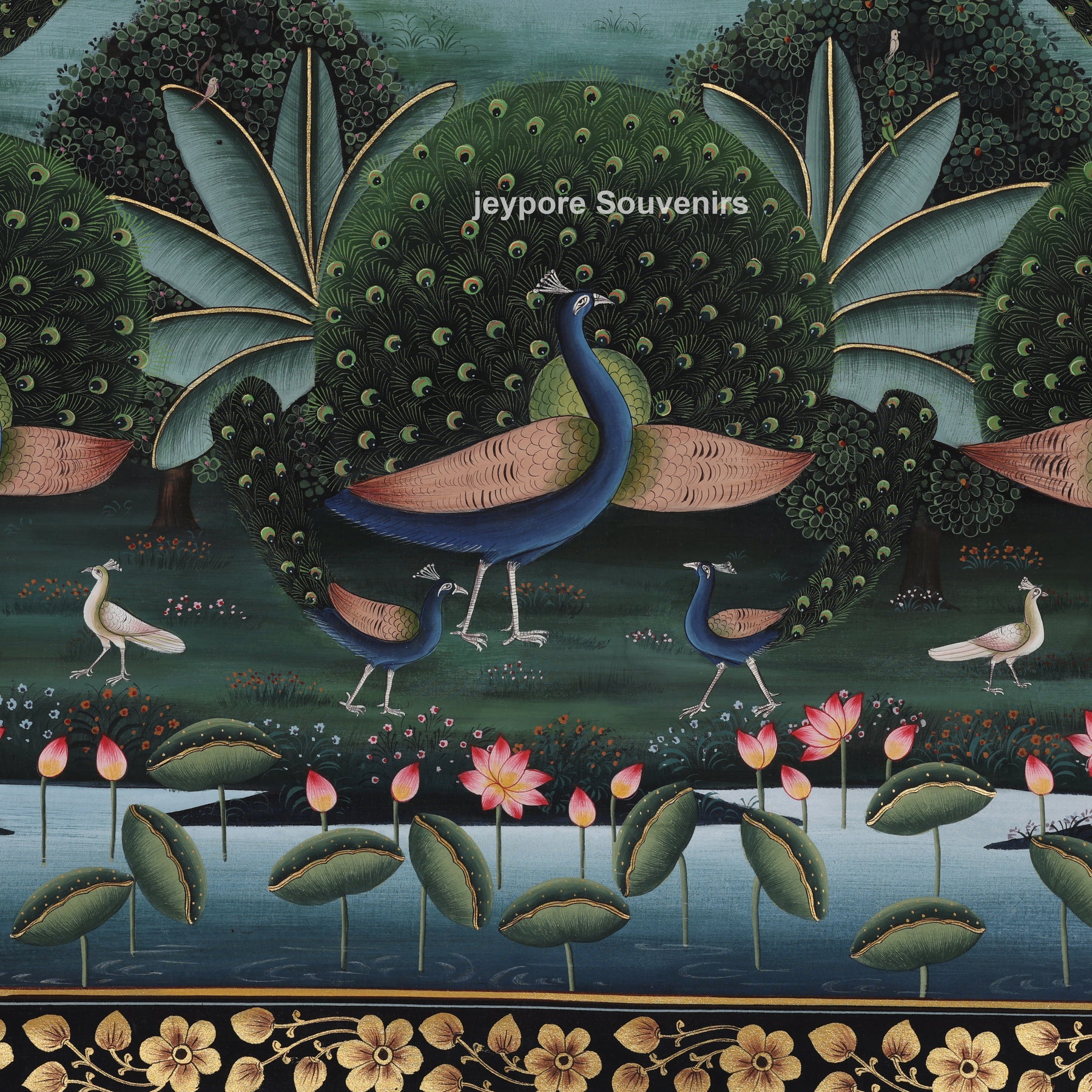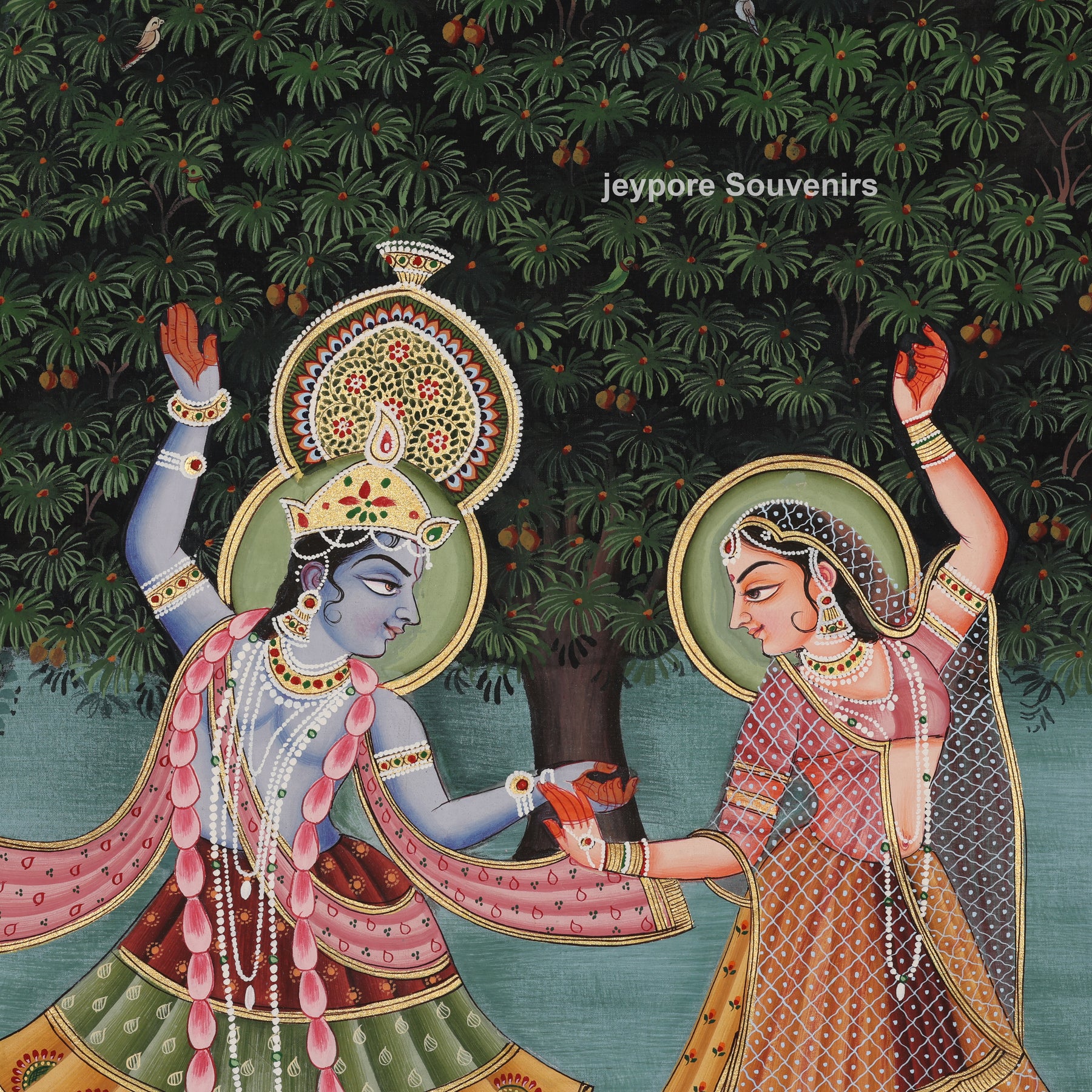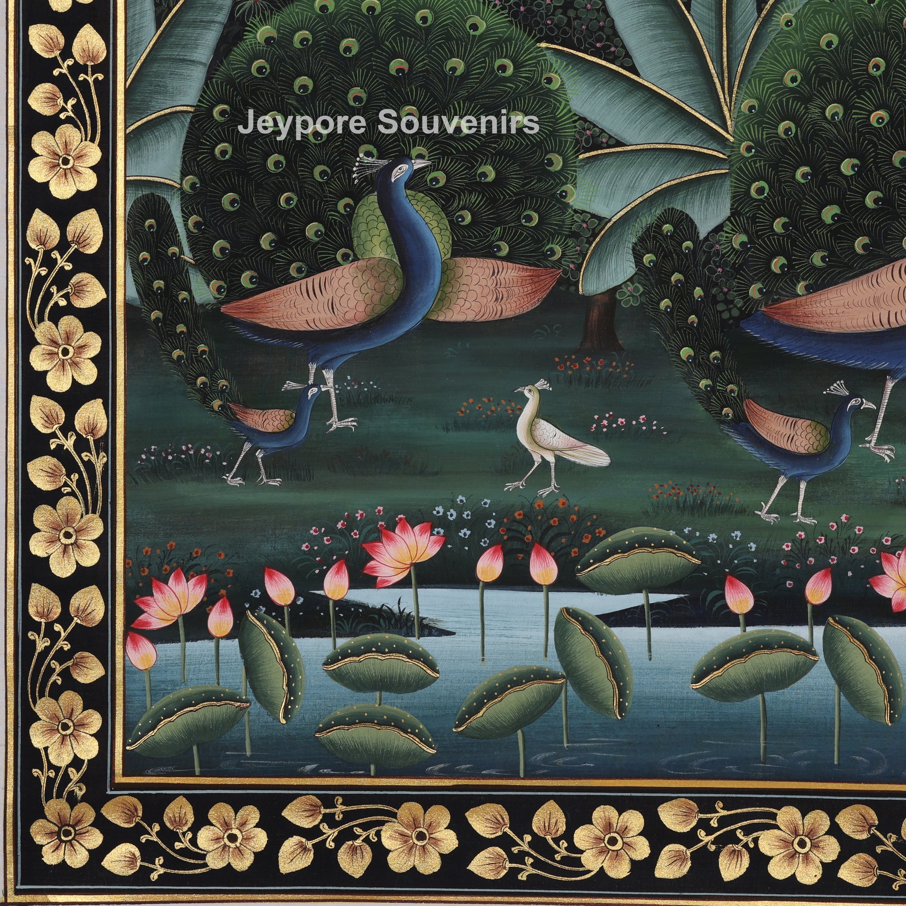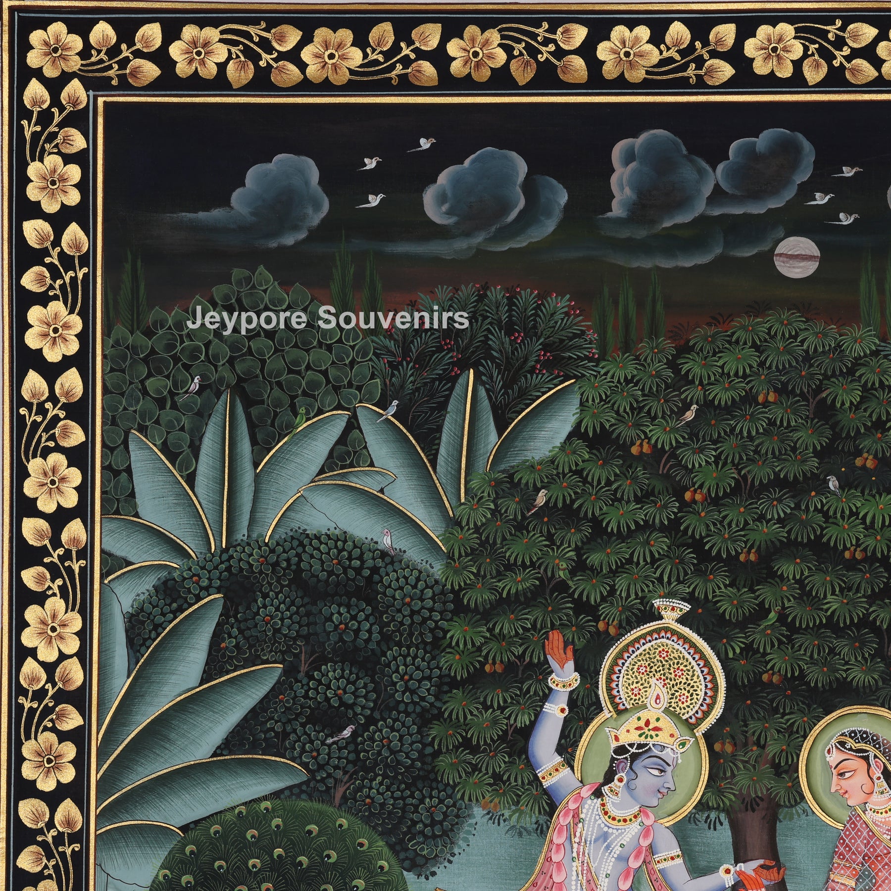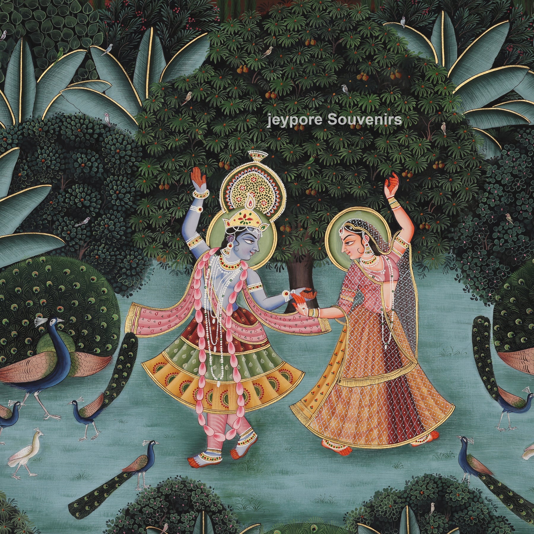 This painting depicts a vibrant garden landscape brimming with activity and balance. Figures in motion are positioned in the center, encircled by peacocks, vegetation, and water features. Meticulous brush techniques are employed to produce sleek outlines, intricate details, and lush surface textures. The painter has stacked trees, foliage, and organic shapes to provide the artwork with a feeling of depth and movement. A deep backdrop and ornate frame enable the hues to emerge, reflecting the creator’s perseverance, precision, and classic hand-painting pichwai.