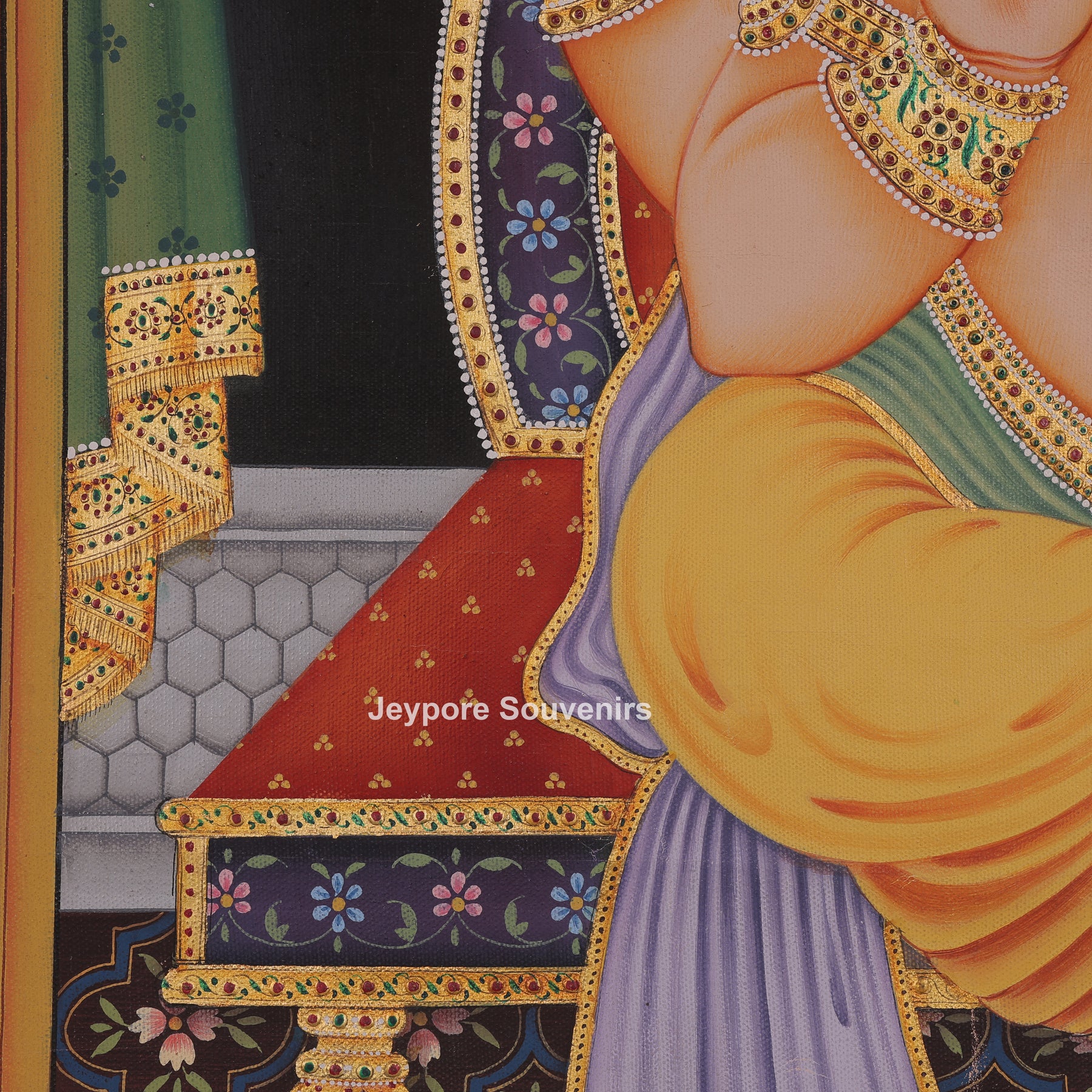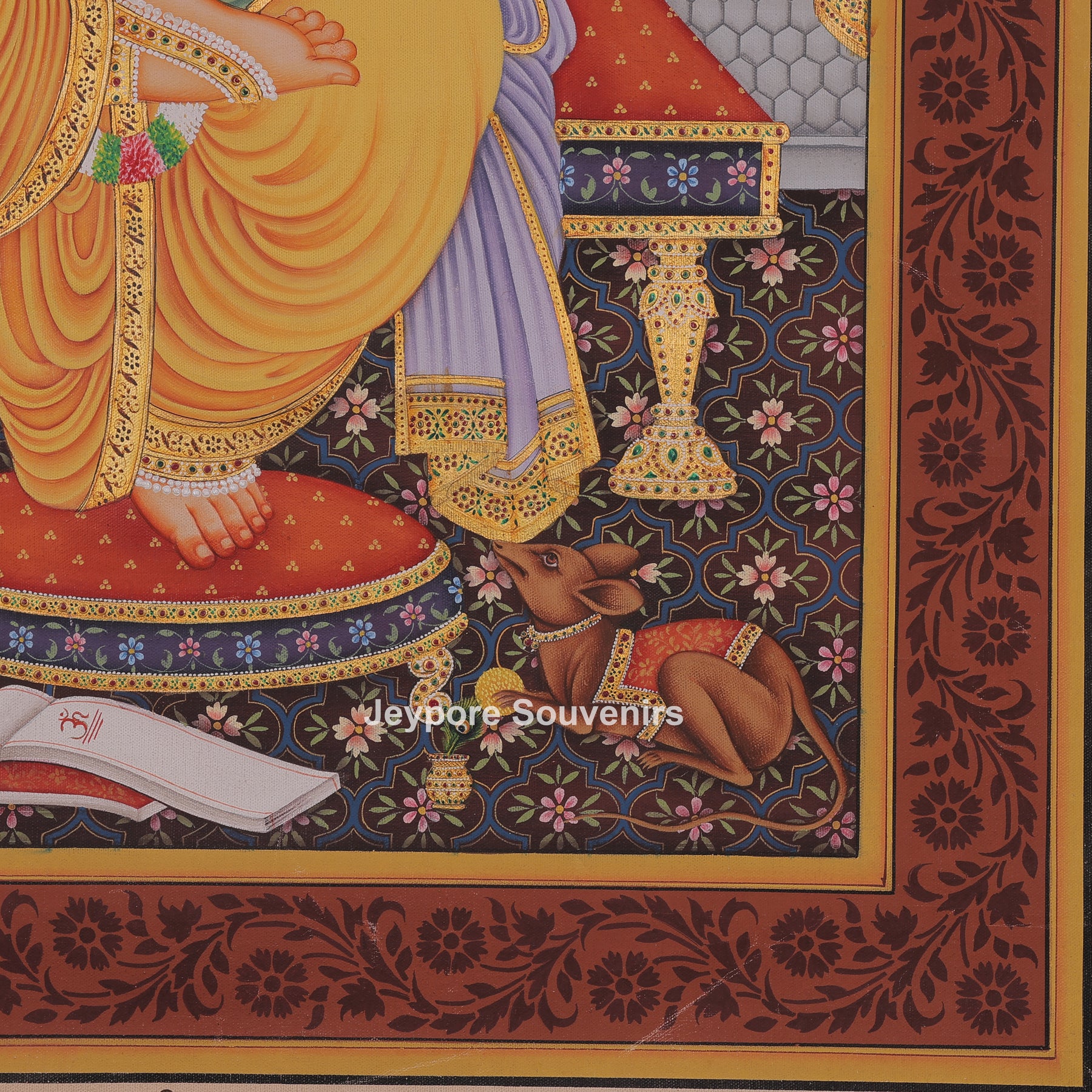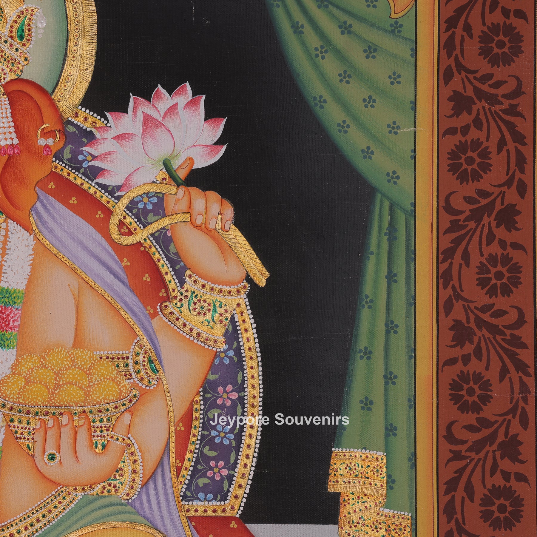 This painting shows Lord Ganesha seated on a decorated throne in a calm and peaceful setting. He is holding a lotus flower and a bowl of sweets, while one hand is raised in a blessing gesture. Ganesha is wearing a detailed crown, jewelry, and traditional clothes painted with fine patterns and bright colors. A small mouse is shown near his feet, along with offerings placed in front of him. Decorative curtains, a patterned floor, and a royal umbrella above his head add beauty to the scene. The image represents wisdom, protection, and good fortune.