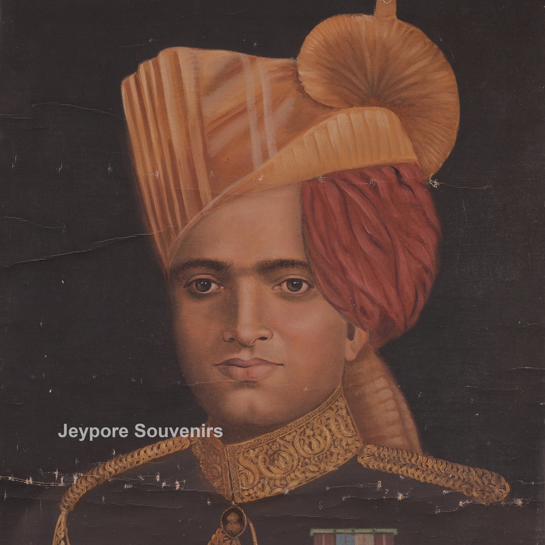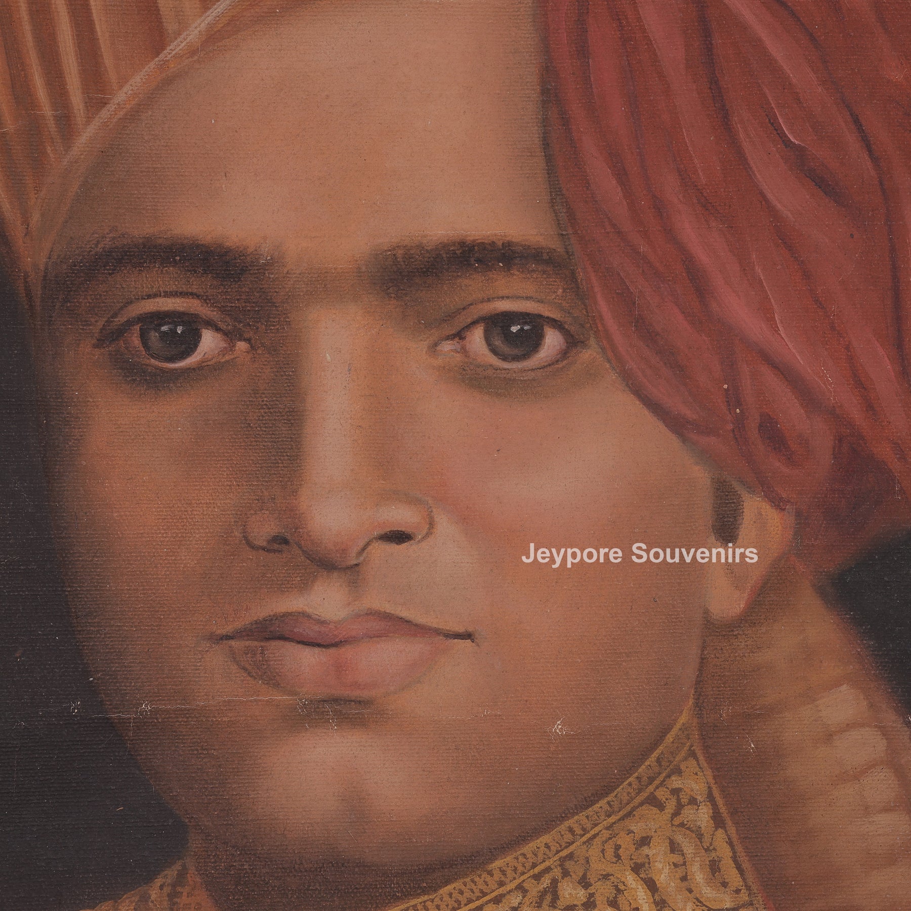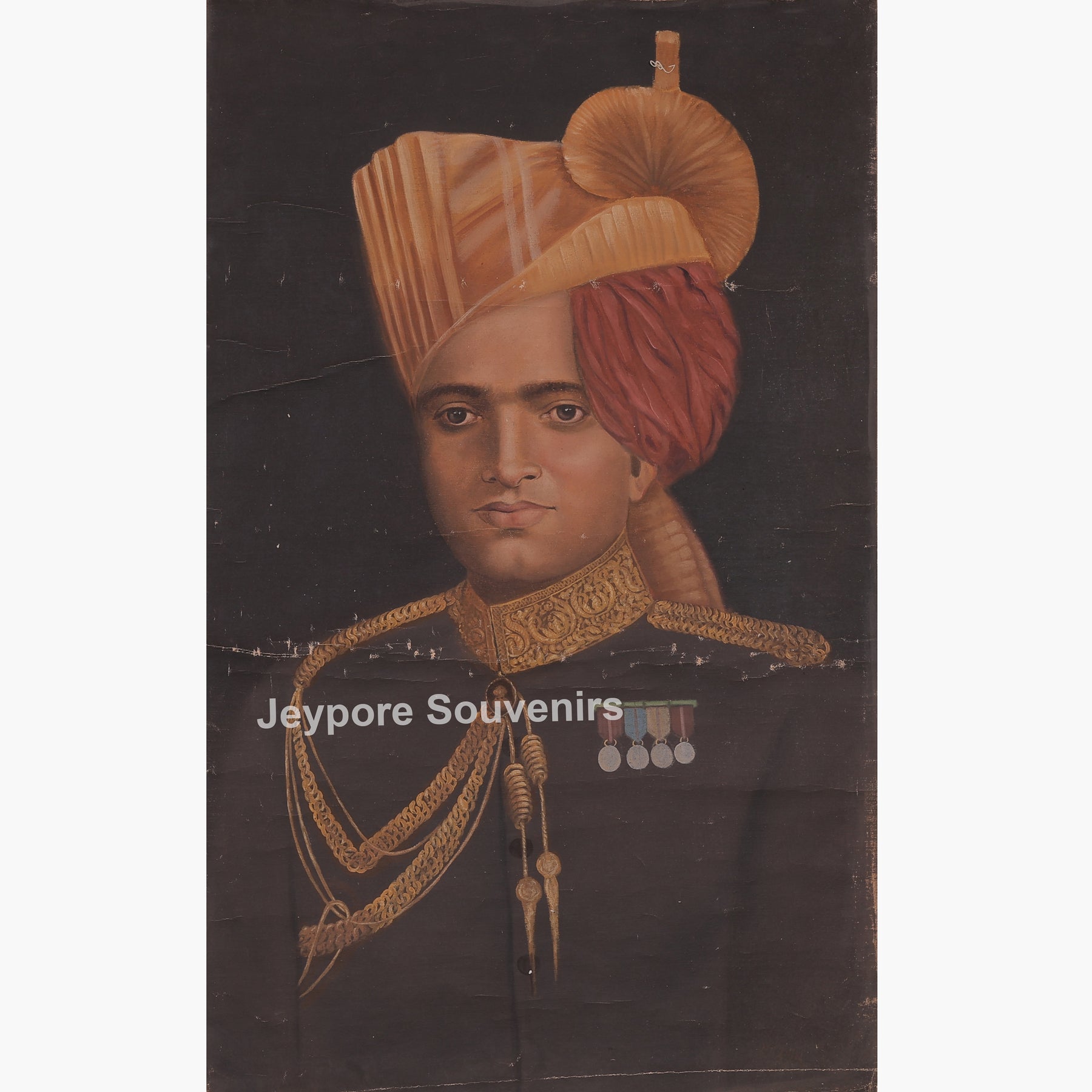 This canvas painting portrait of a man standing calmly and facing forward. He is wearing traditional royal clothing, including a detailed turban and a formal outfit decorated with medals and gold chains. His expression is peaceful and dignified, showing confidence and grace. The dark background helps bring focus to his face and attire. The fine details in the clothing and accessories show careful hand painting. The picture represents pride, tradition, and royal elegance.