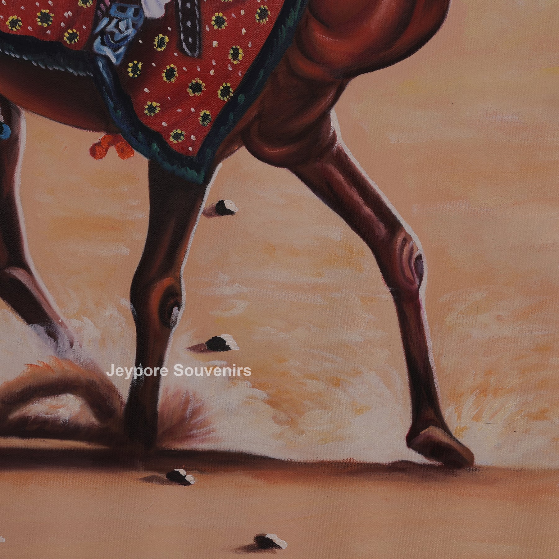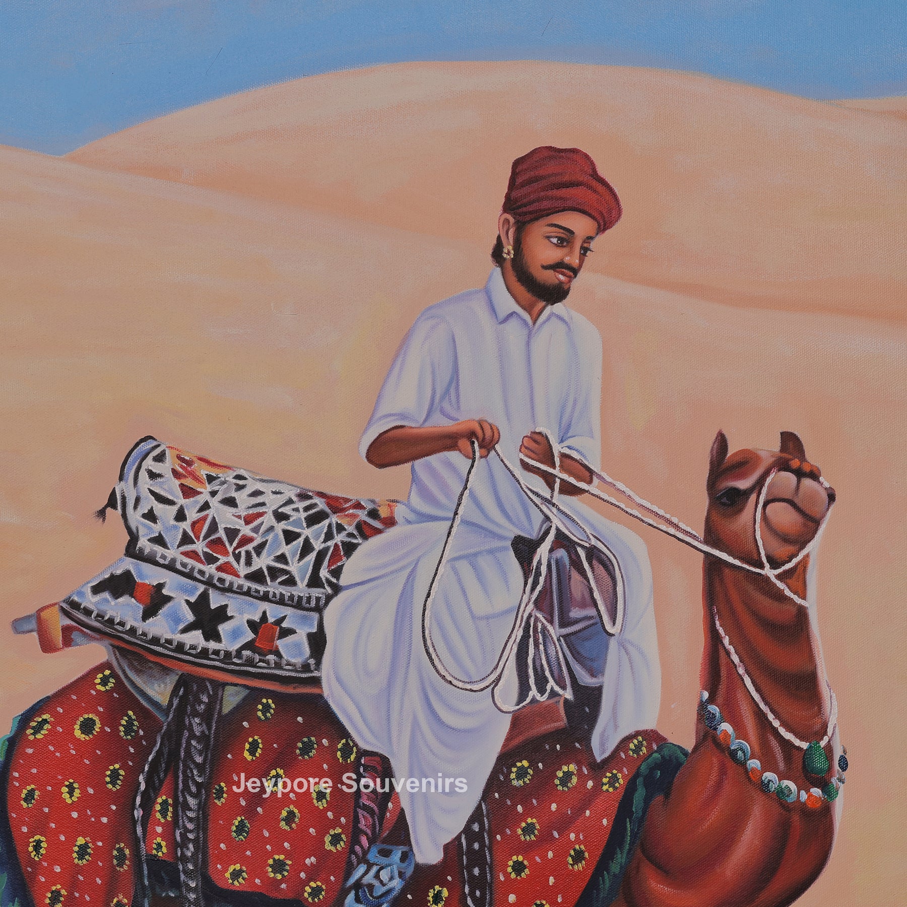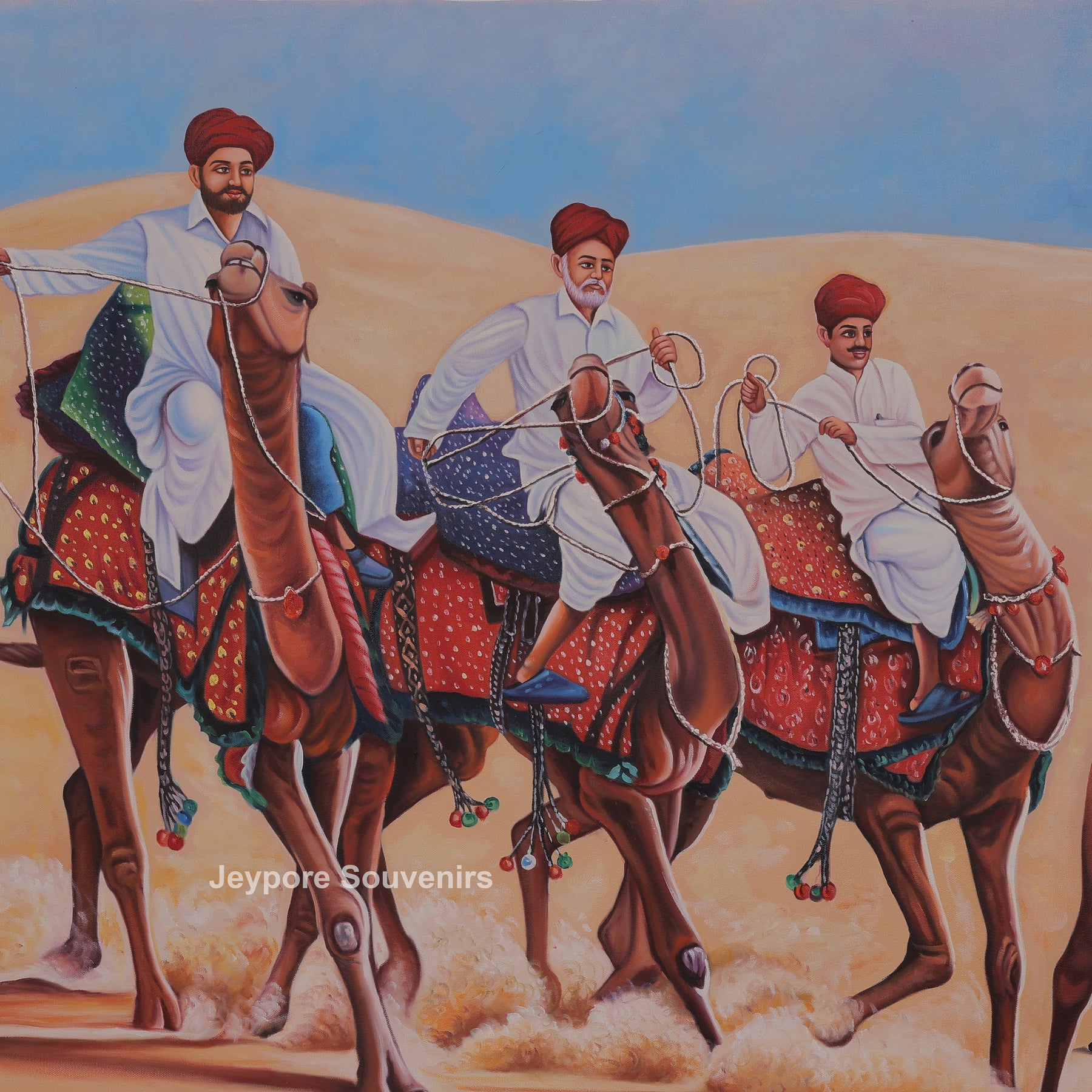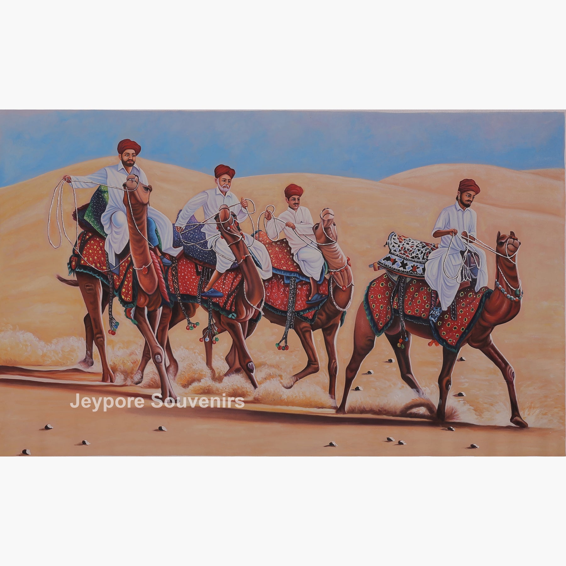 This canvas painting a rajasthani-style desert scene featuring men's riding camels across vast golden sand dunes. The painting reflects the traditional lifestyle and travel culture of the desert region, showing calm confidence and unity among the riders. Fine detailing in the camels’ posture, traditional turbans, flowing garments, and decorative saddles adds depth and authenticity to the scene. Warm earthy tones blend smoothly with the open sky, creating a sense of movement and timelessness. The painting brings the spirit of rural desert life into your space, making it a striking visual element for living rooms, offices, or cultural interiors. Carefully created on canvas, this piece highlights skilled handwork and cultural expression, making it a meaningful decorative choice for those who appreciate traditional Indian themes and heritage-inspired visuals.