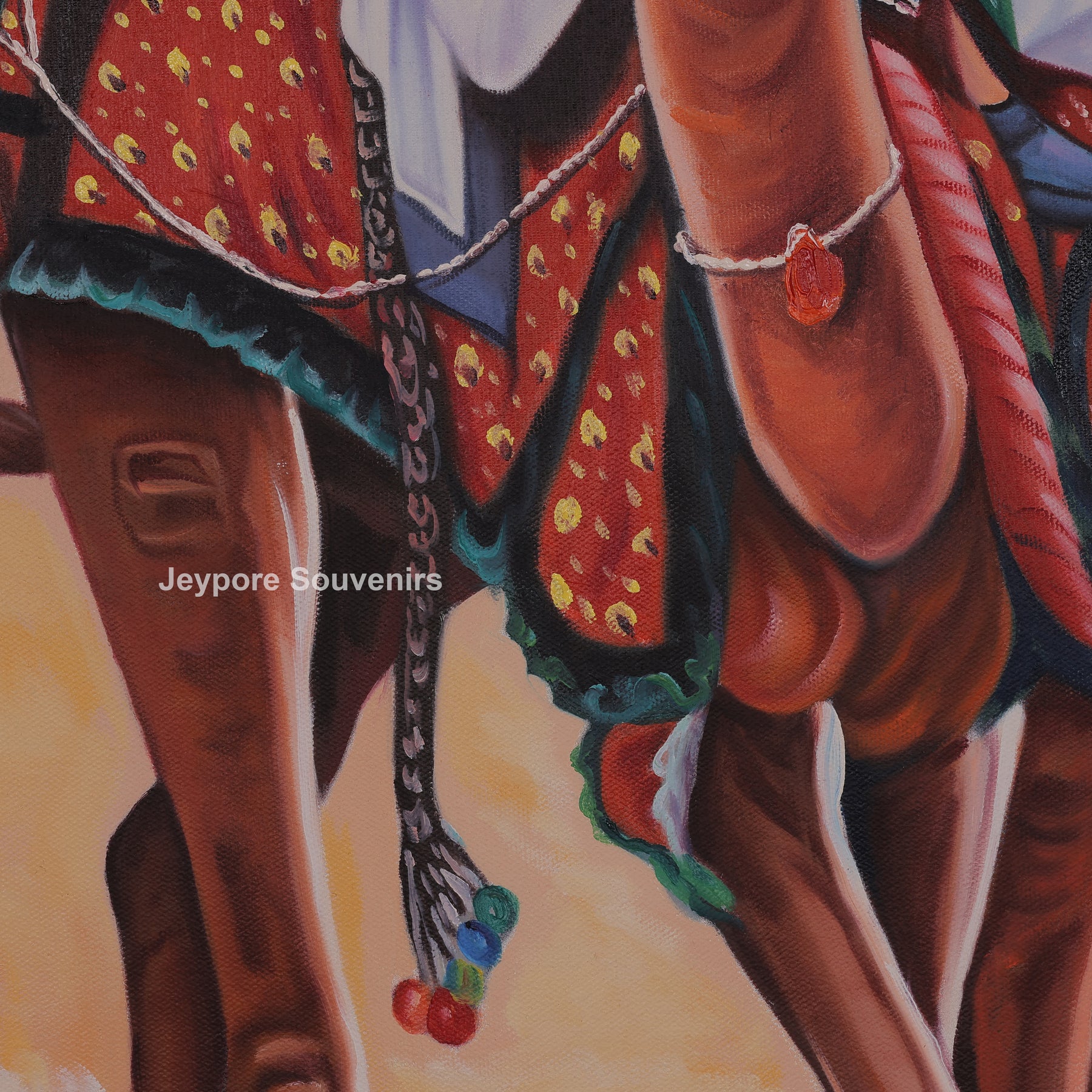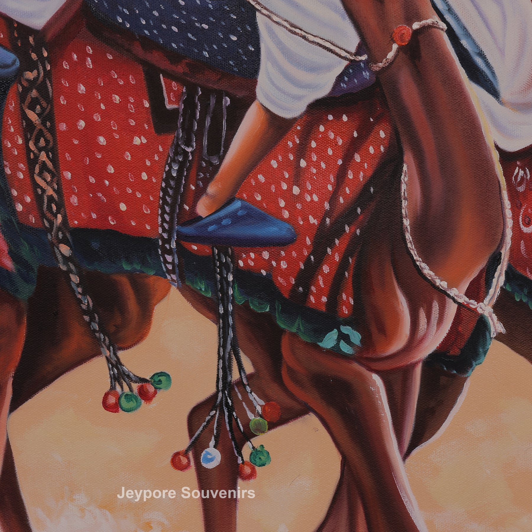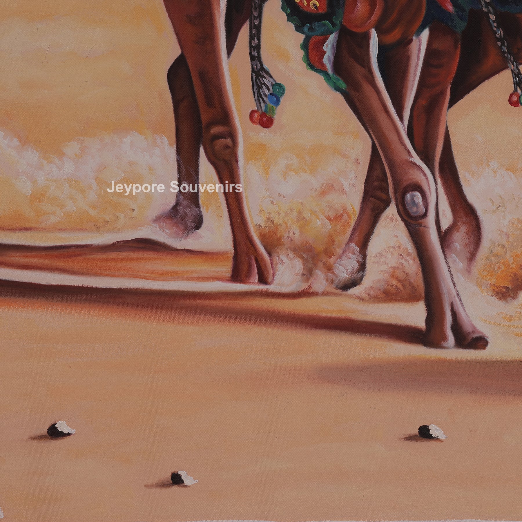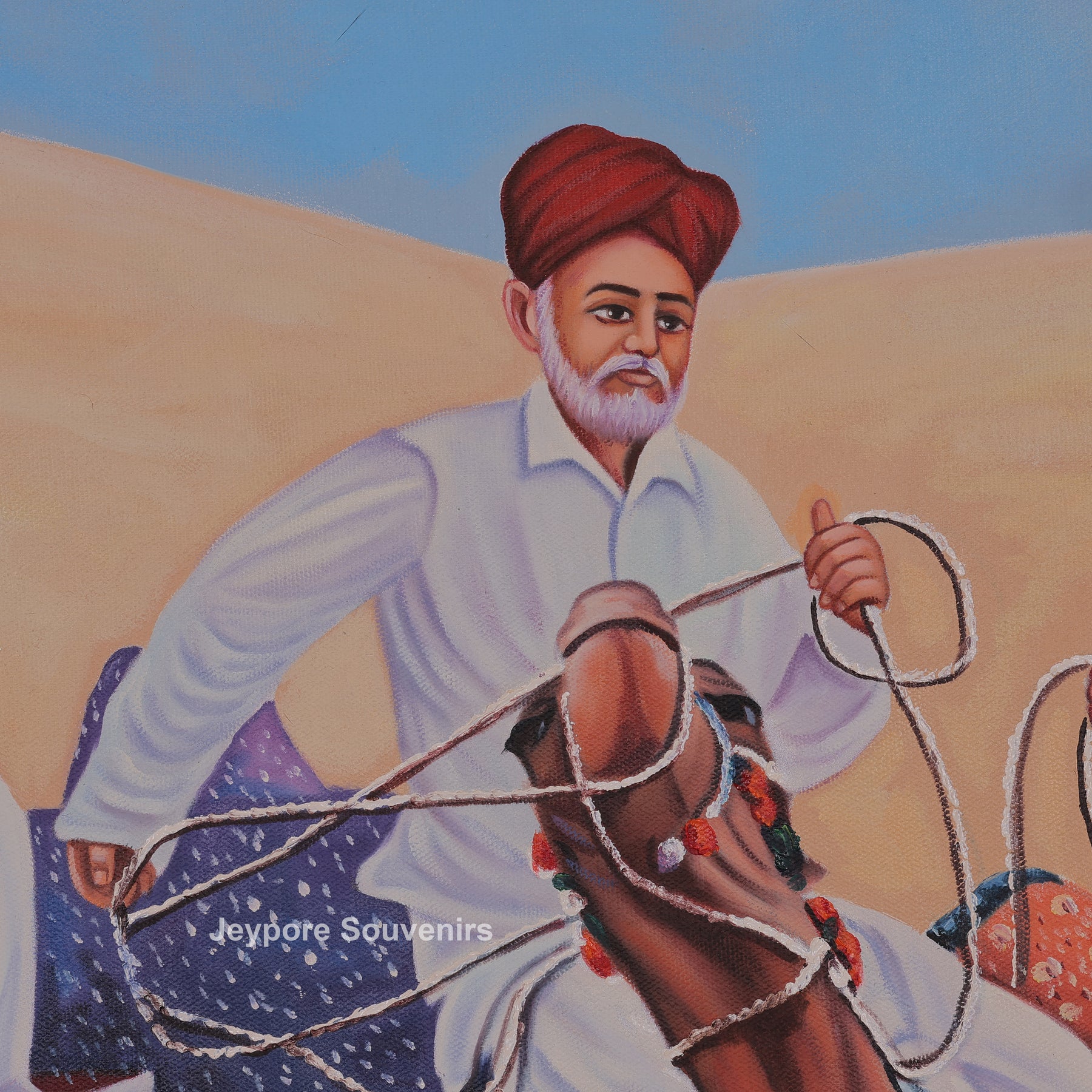 This canvas painting a rajasthani-style desert scene featuring men's riding camels across vast golden sand dunes. The painting reflects the traditional lifestyle and travel culture of the desert region, showing calm confidence and unity among the riders. Fine detailing in the camels’ posture, traditional turbans, flowing garments, and decorative saddles adds depth and authenticity to the scene. Warm earthy tones blend smoothly with the open sky, creating a sense of movement and timelessness. The painting brings the spirit of rural desert life into your space, making it a striking visual element for living rooms, offices, or cultural interiors. Carefully created on canvas, this piece highlights skilled handwork and cultural expression, making it a meaningful decorative choice for those who appreciate traditional Indian themes and heritage-inspired visuals.
