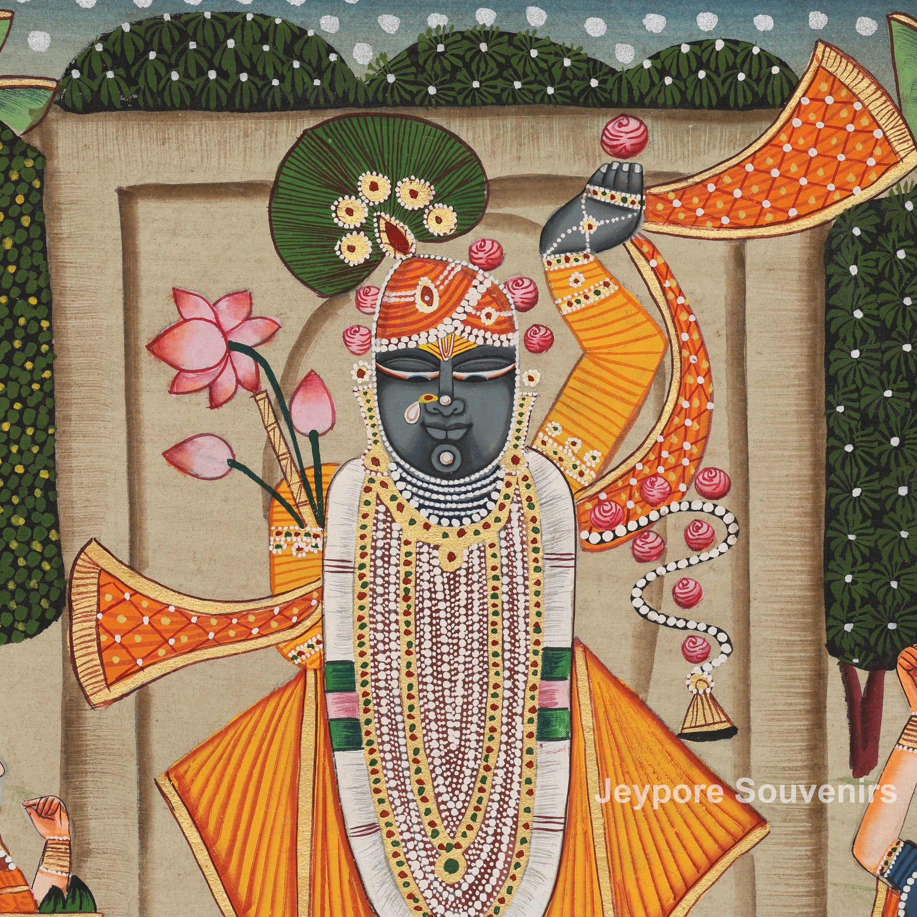 Celebrate the divine beauty of traditional Indian art with this Pichwai Style Shrinathji Painting on Cotton Cloth, masterfully hand-painted by skilled artisans of Jeypore Souvenirs. This exquisite artwork showcases Lord Shrinathji, the revered form of Lord Krishna, adorned in royal attire, holding a lotus and flute. The scene beautifully includes two graceful female devotees and peacocks, symbolizing devotion, nature, and divine love.