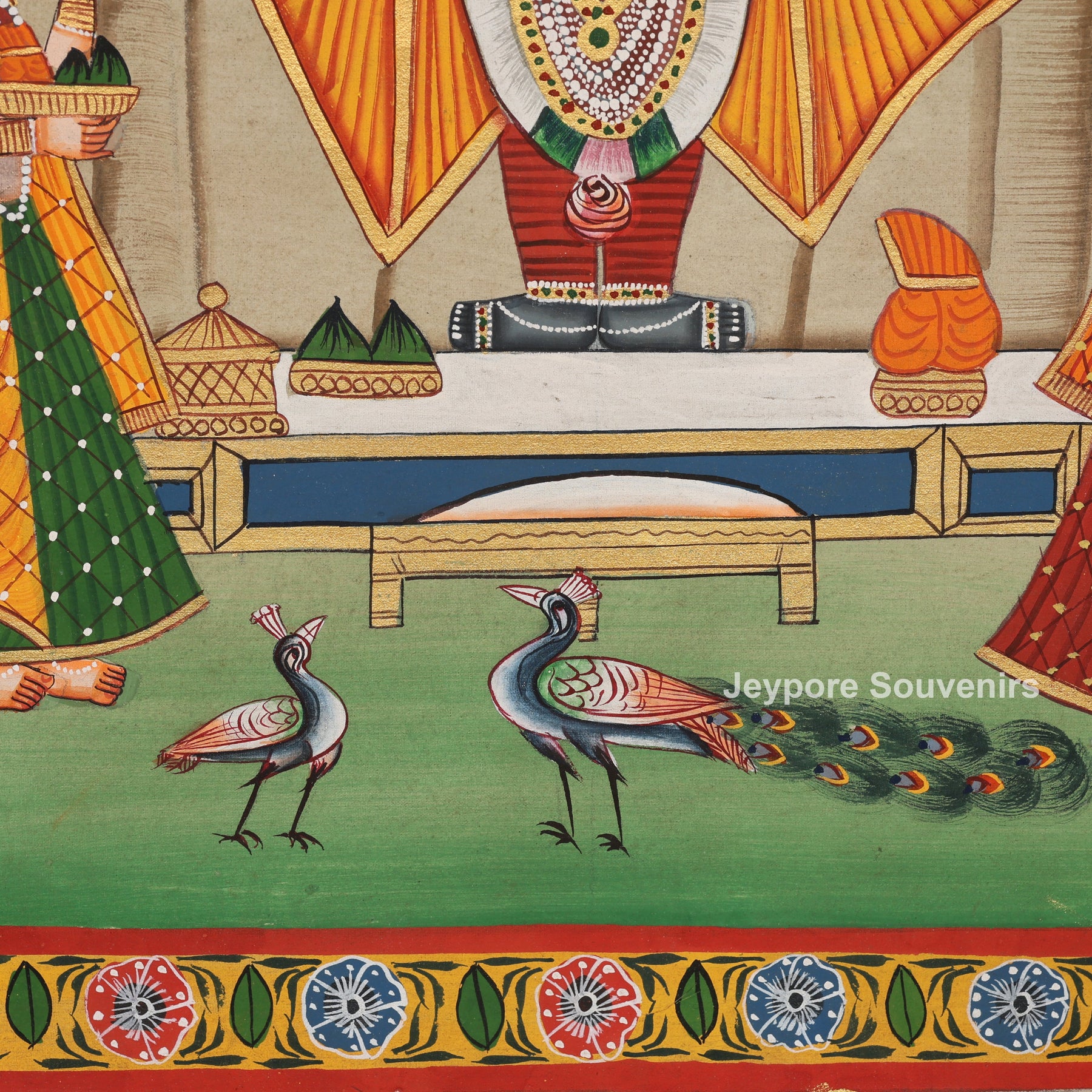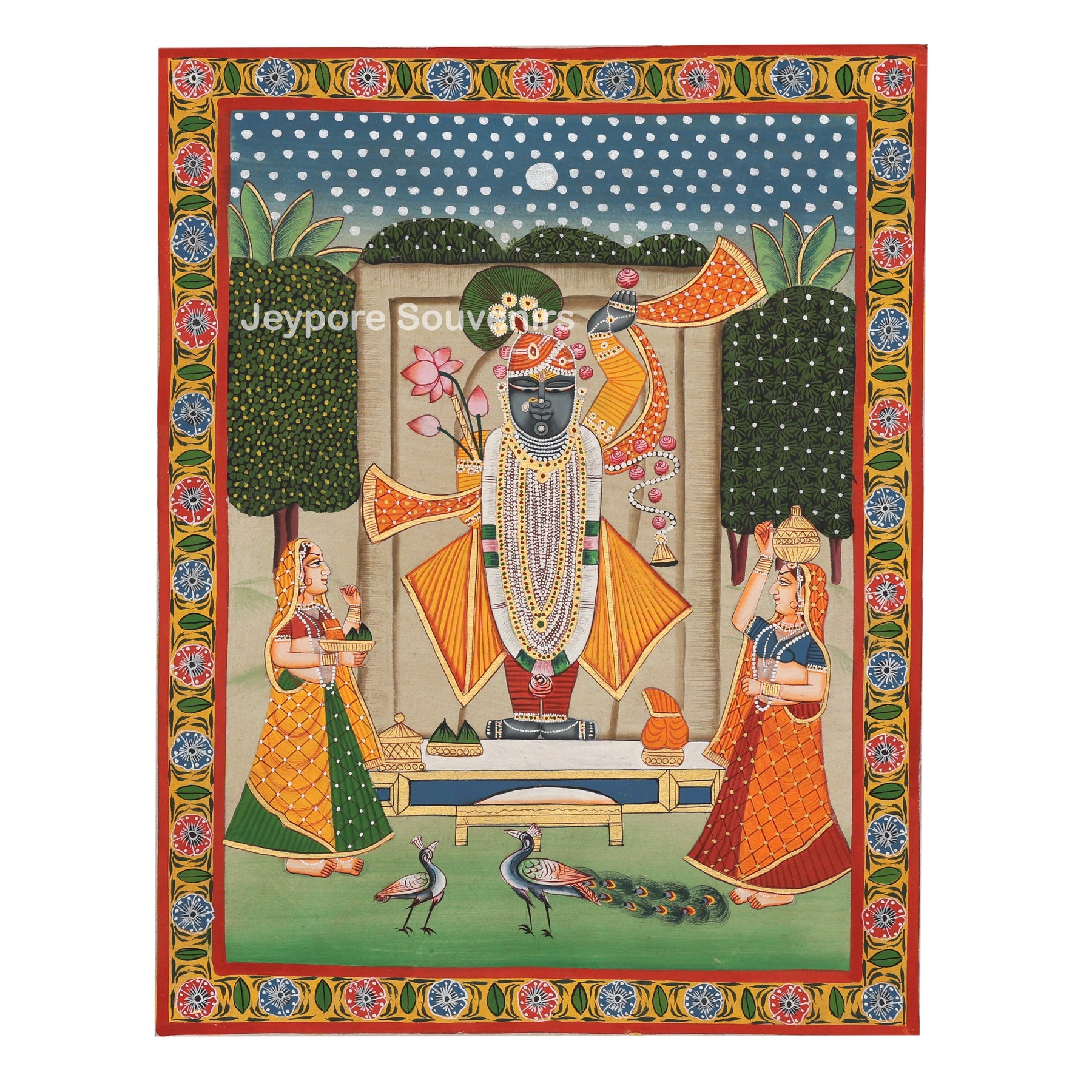 This painting stands out for its depiction of Lord Shrinathji with two graceful ladies and peacocks, symbolizing devotion and nature’s harmony. Each detail is hand-painted using natural pigments, reflecting traditional Nathdwara artistry and divine elegance.