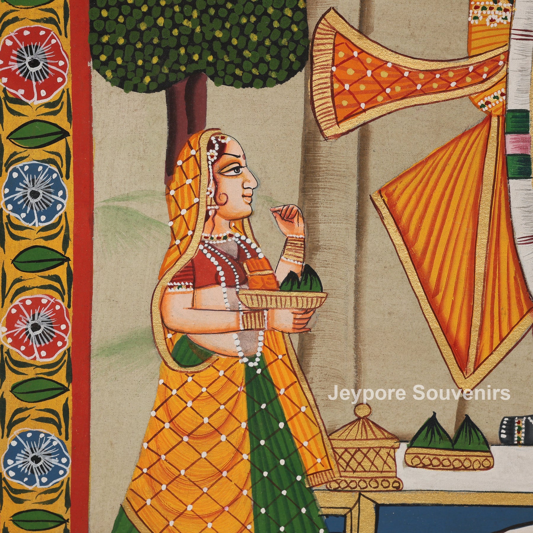 The painting is created on premium hand-woven cotton cloth, providing a durable base that enhances the texture and depth of the colors used in traditional Pichwai painting.