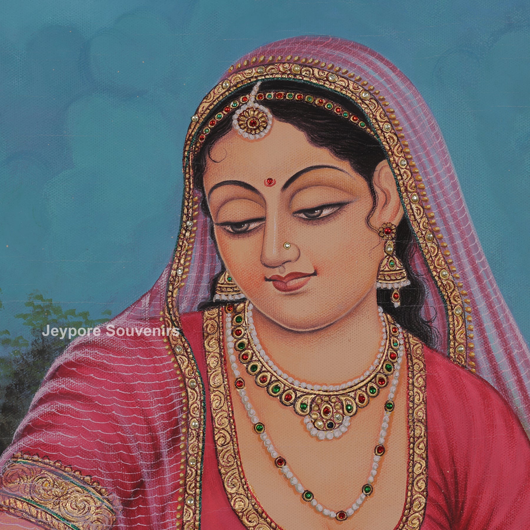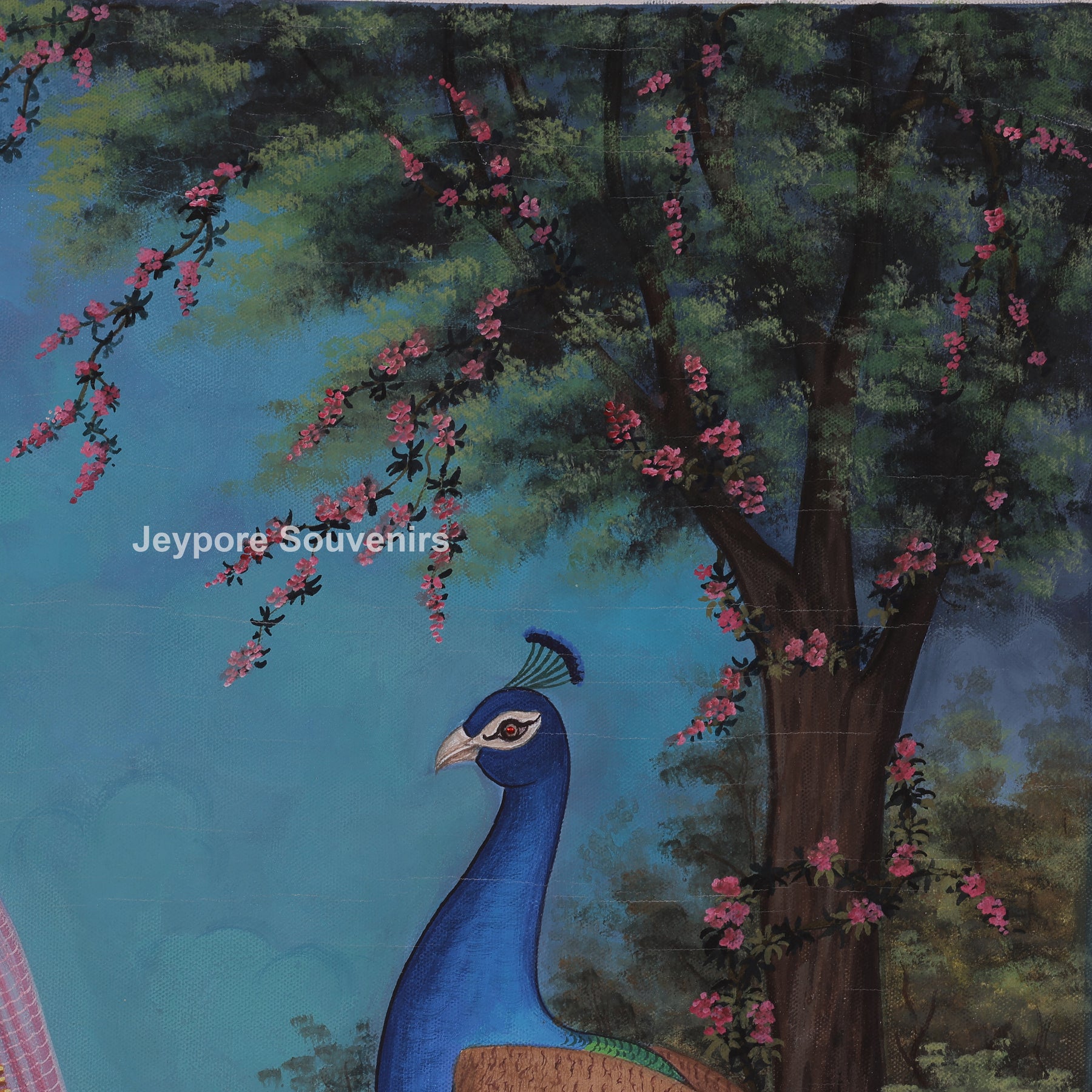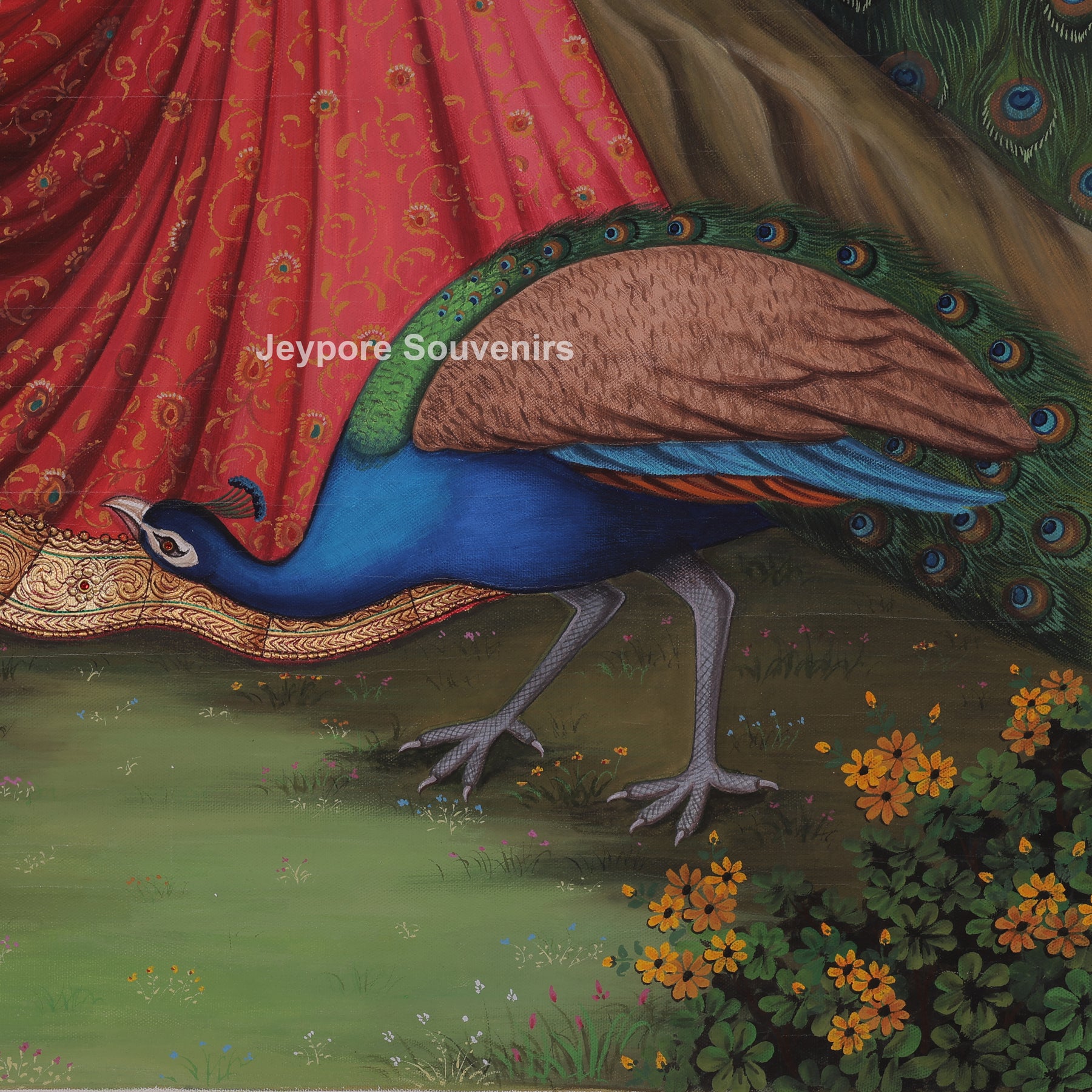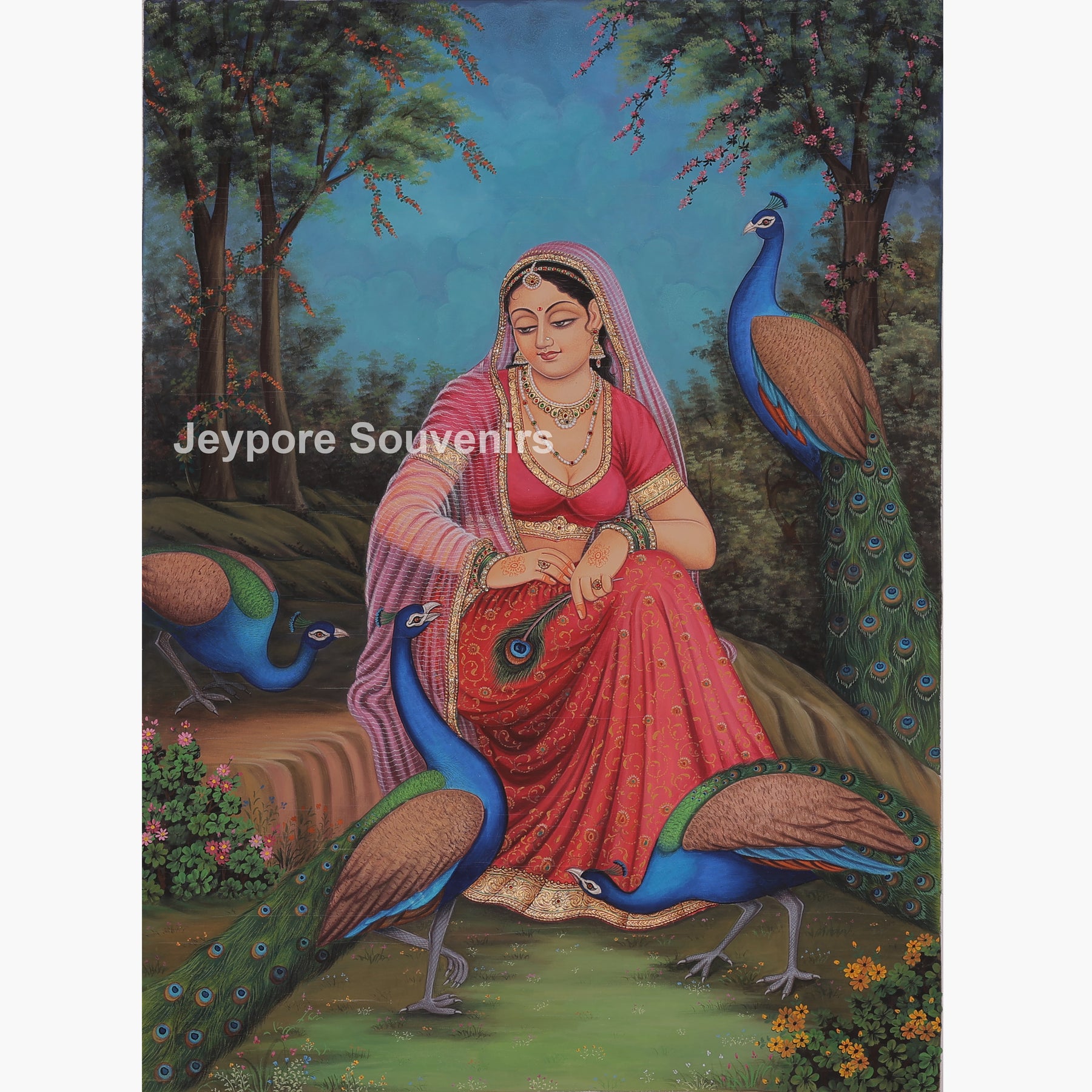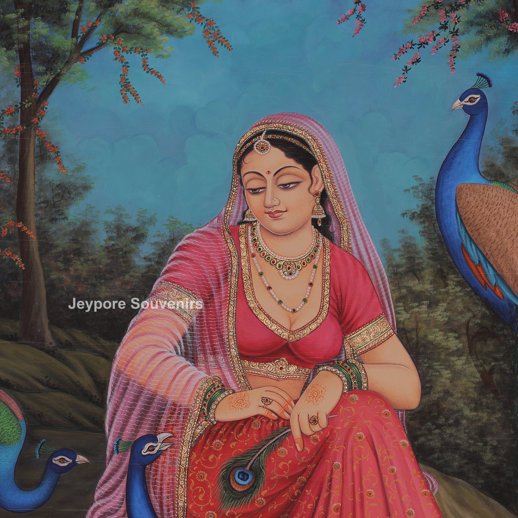This canvas painting present a radha sitting calmly in a beautiful garden surrounded by peacocks. Radha is wearing a red traditional dress and simple jewelry, and radha looks peaceful and thoughtful. The peacocks stand and walk around her, adding color and beauty to the scene. Tall trees, green grass, and small flowers fill the background. The scene feels quiet, natural, and gentle, showing harmony between the woman and nature.