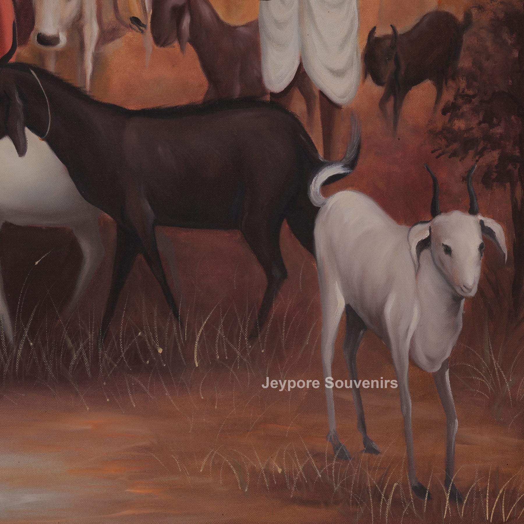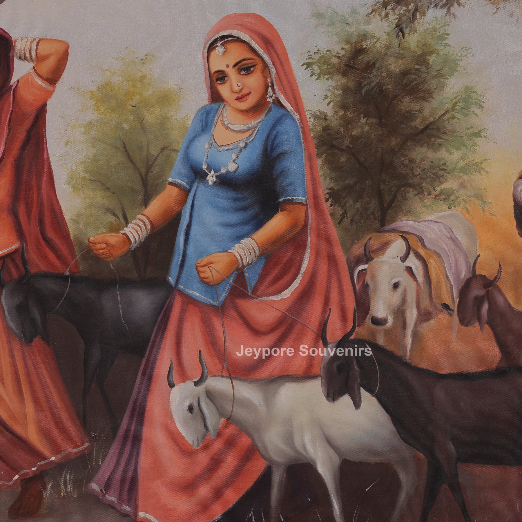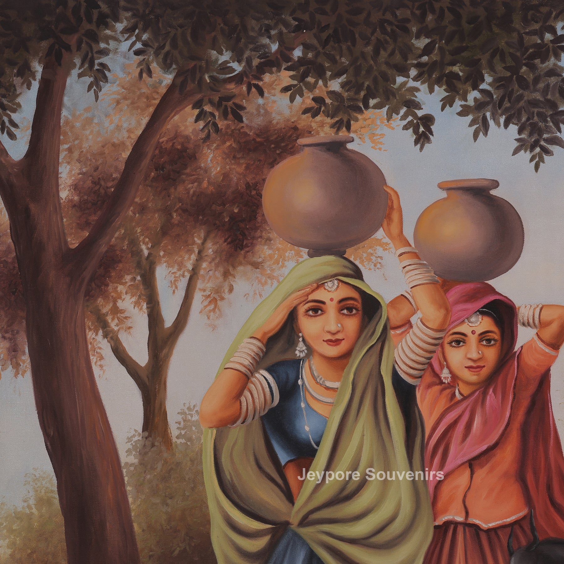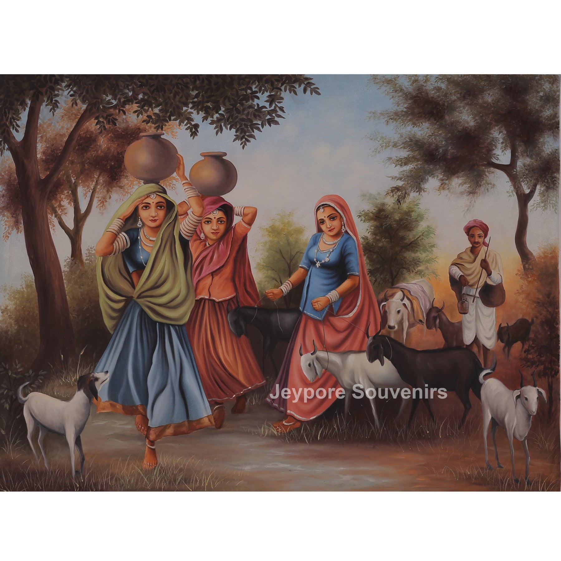 This canvas painting a traditional rajasthani village scene centered around womens engaged in their daily routine. Dressed in vibrant regional attire, the womens are shown carrying water pots and walking together with calm expressions, reflecting grace, strength, and togetherness. Goats and cattle move alongside them, adding life and authenticity to the rural setting. The background features open land, trees, and soft skies, creating a balanced and peaceful composition. The painting is carefully created using hand-painted techniques on high-quality canvas, ensuring lasting color depth and fine detailing. Earthy tones blended with bright garments bring contrast and warmth to the scene. This piece reflects cultural heritage, village life, and traditional values, making it a meaningful addition to living spaces, art collections, or interior décor inspired by rural India.