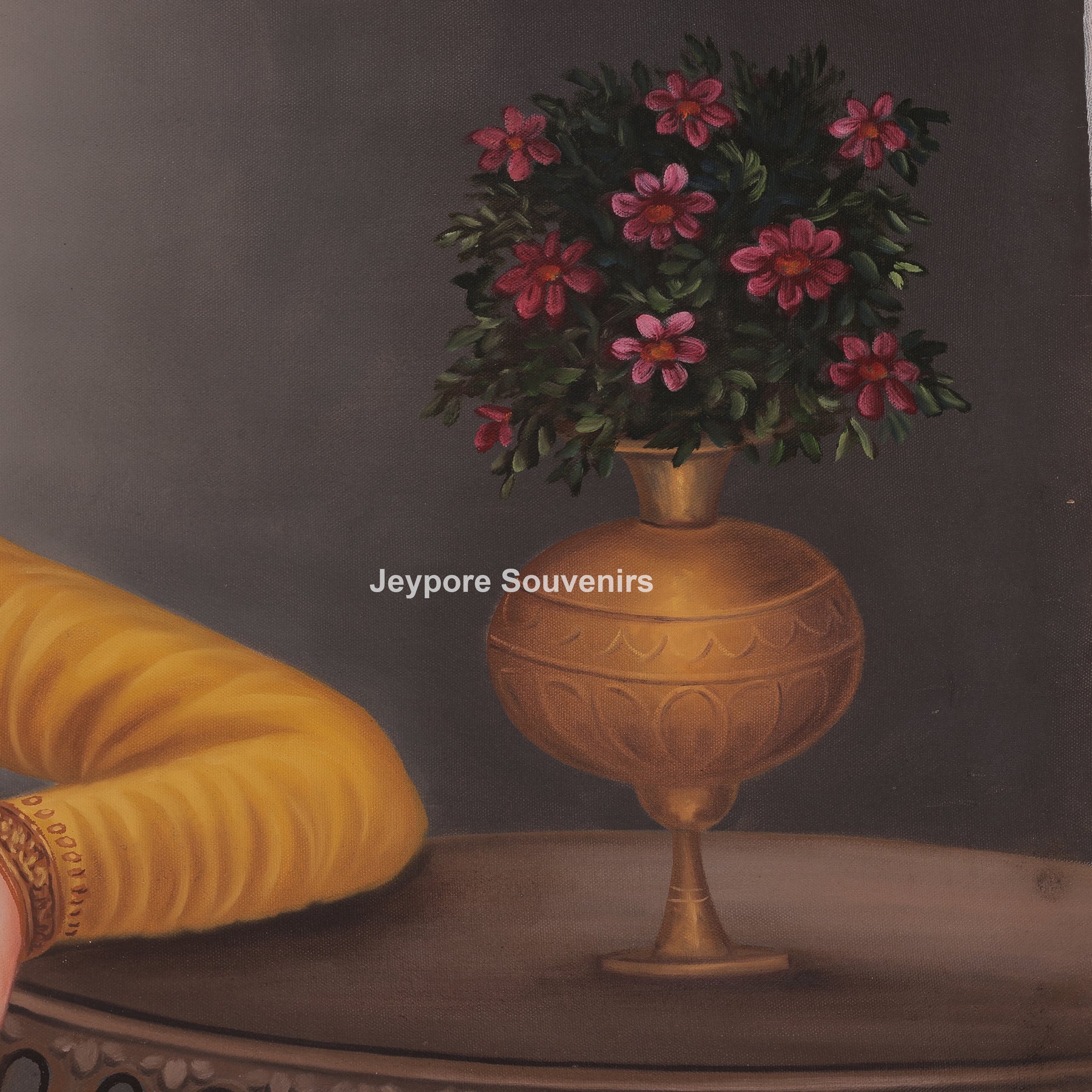 Well-dressed man sitting calmly on a chair inside a room. He is wearing traditional royal clothing, including a turban, layered necklaces, and detailed garments in warm colors. One hand rests on his lap while the other leans on a small round table beside him. A flower pot placed on the table adds a gentle decorative touch. The man’s relaxed posture and thoughtful expression give the scene a peaceful and dignified feel. The simple background keeps focus on the figure, highlighting the fine hand-painted details and classic portrait style.