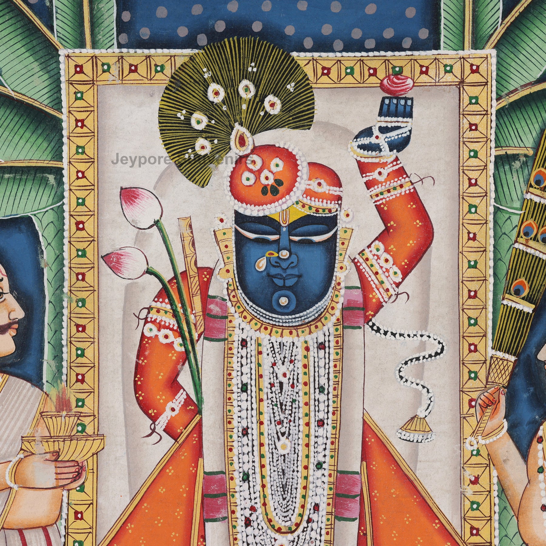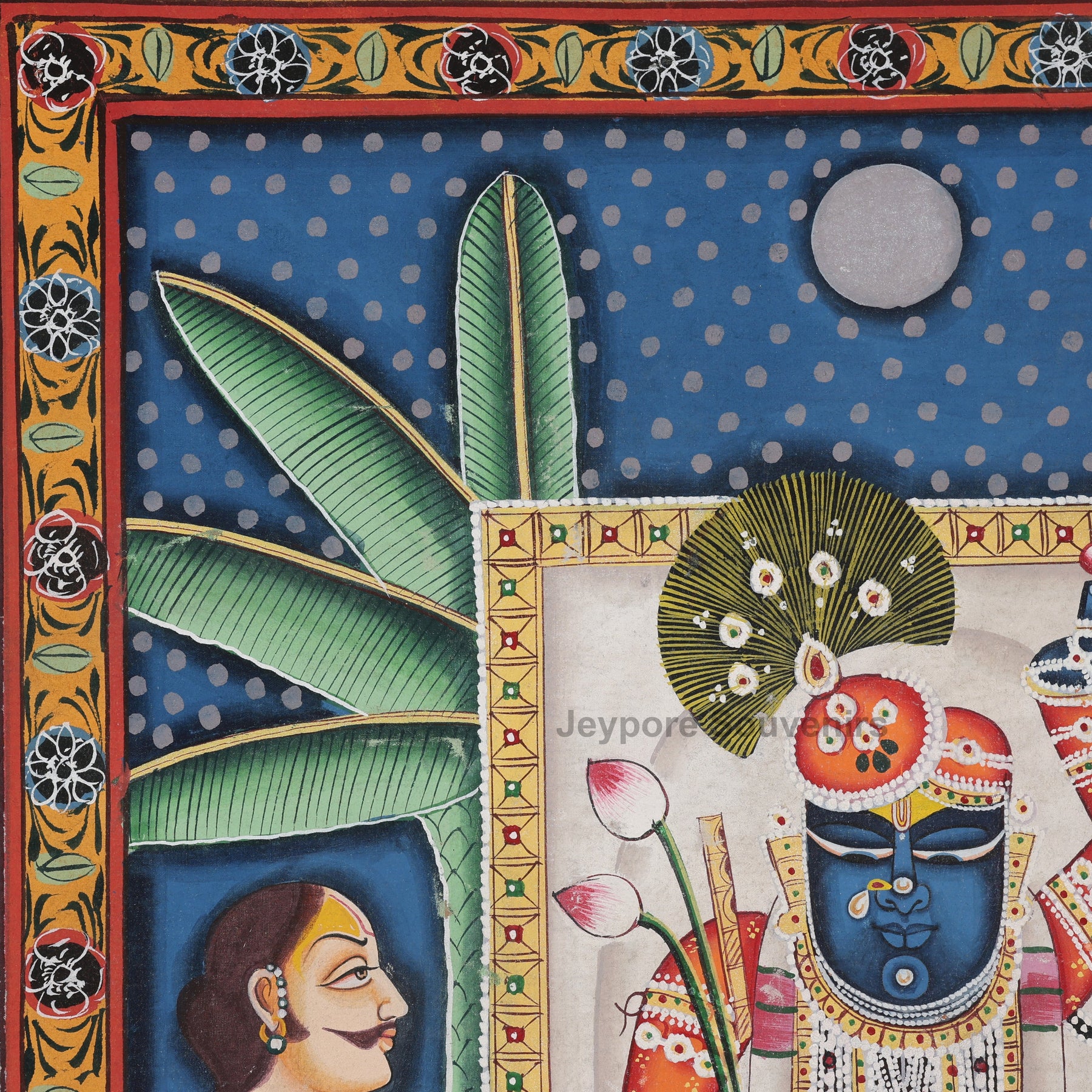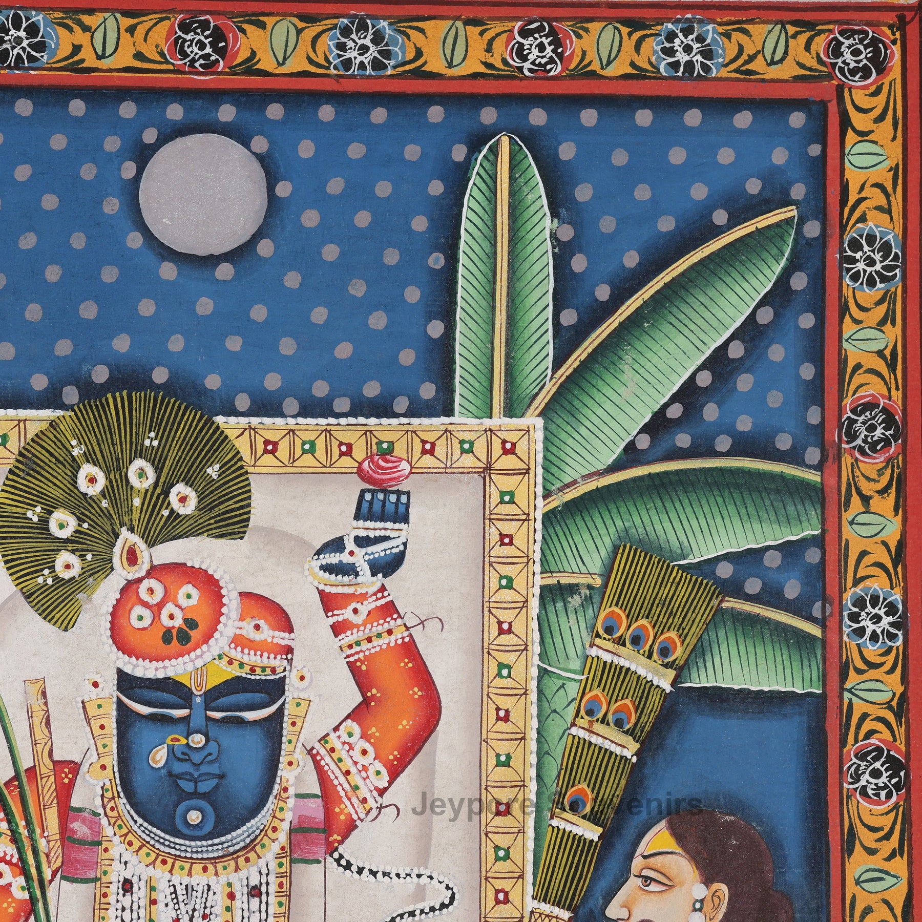 Yes, every detail—from Shrinathji’s intricate ornaments to the banana leaf background—is hand-painted by traditional artisans from Rajasthan using time-honored Pichwai techniques and natural pigments.