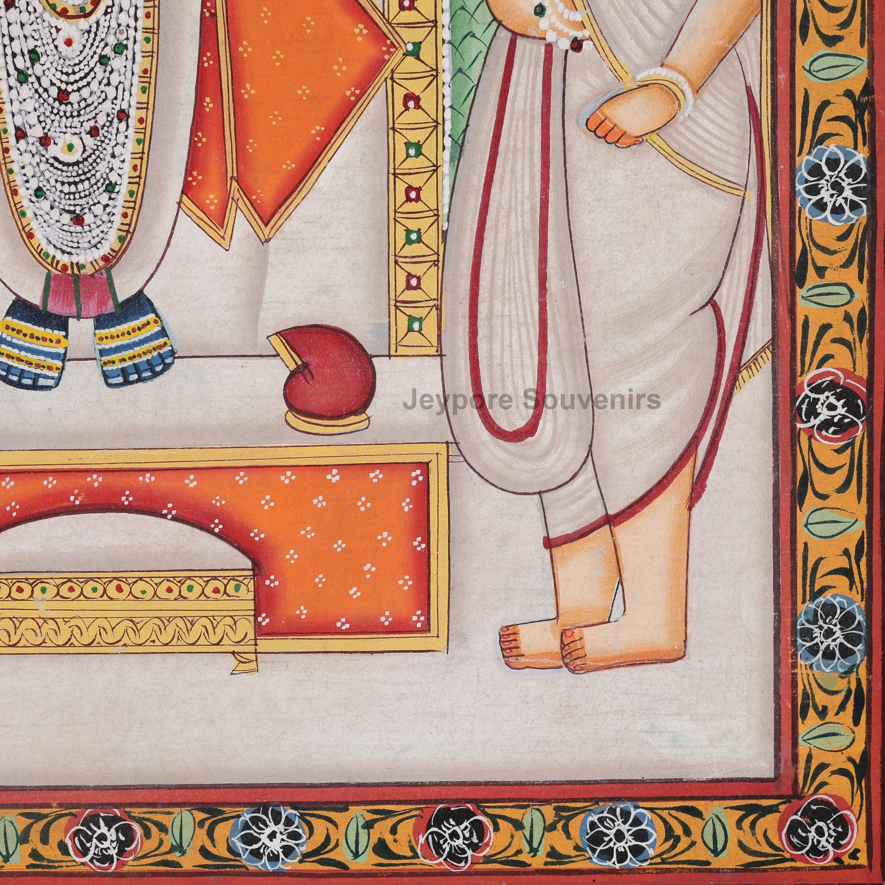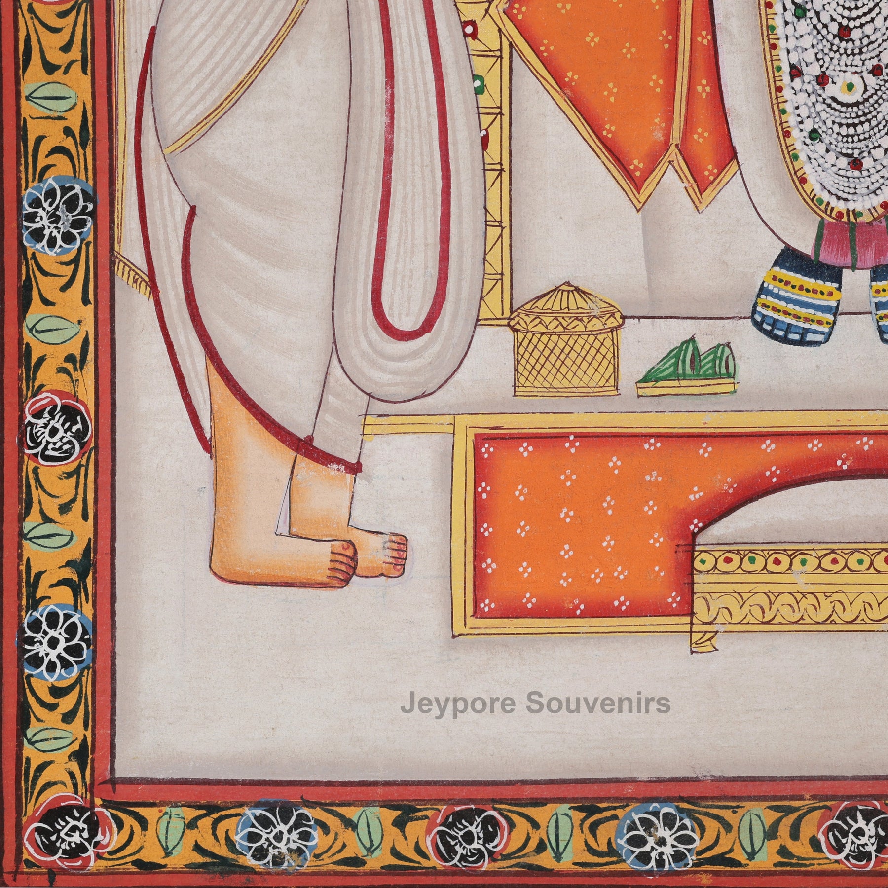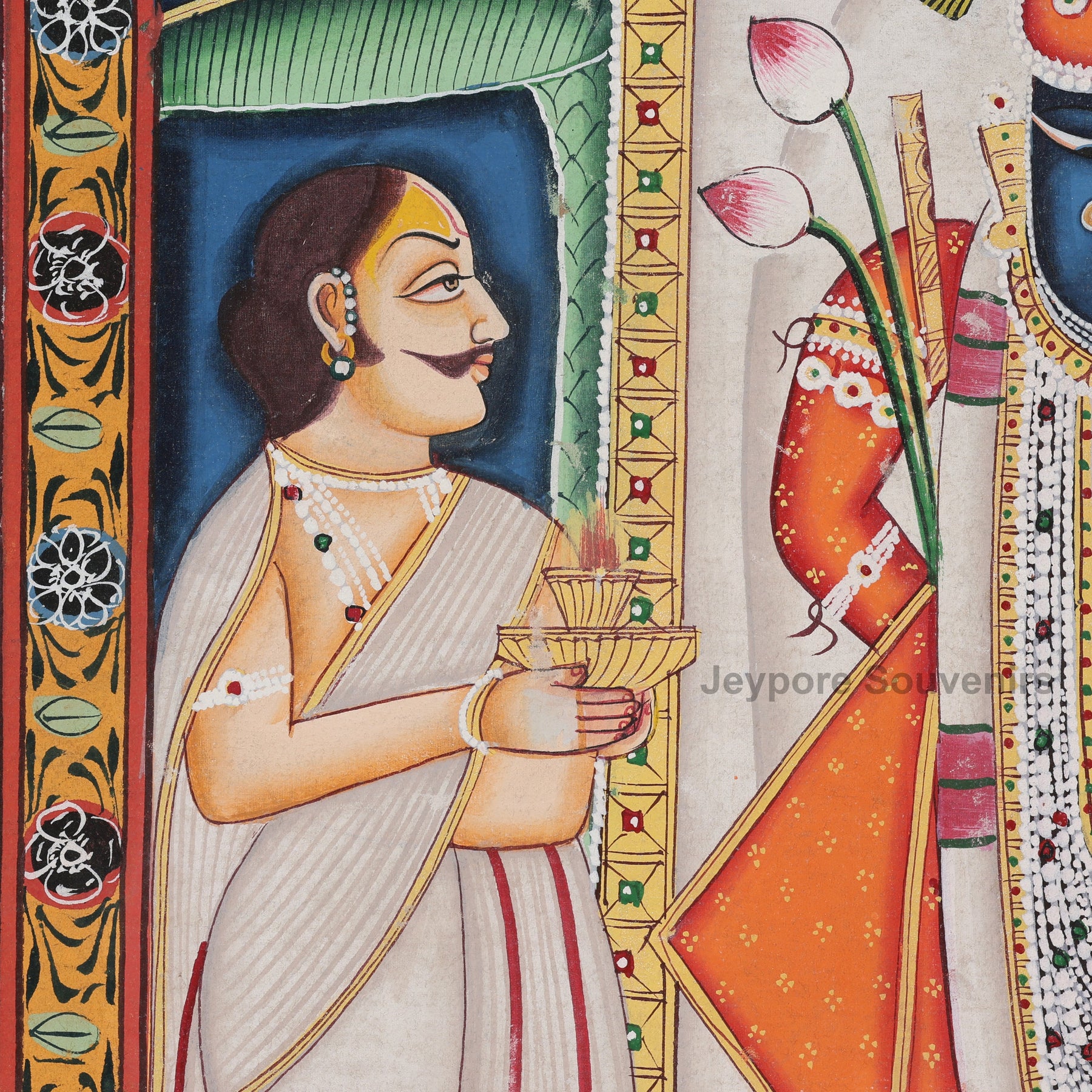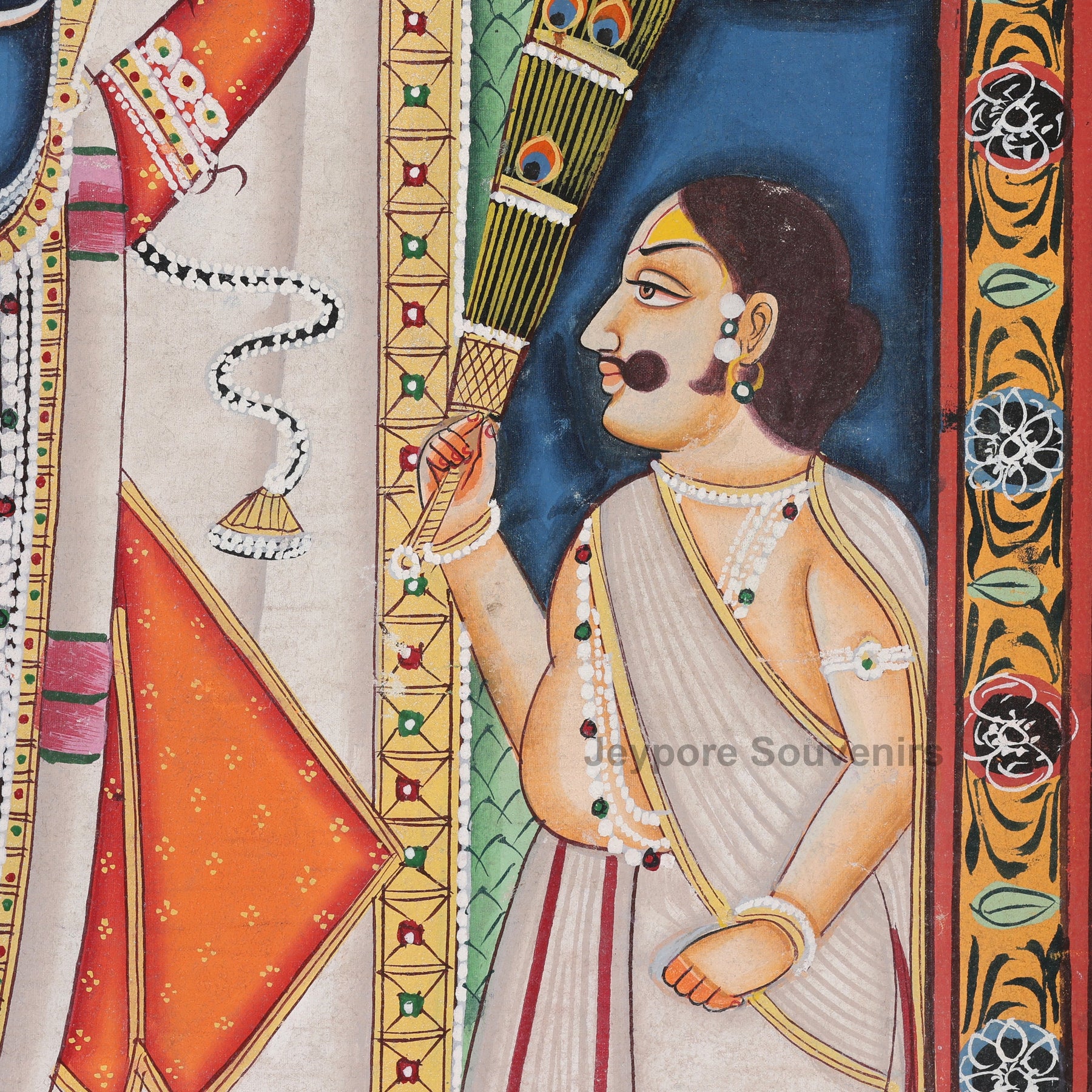 Experience the timeless beauty of Indian devotional art with this Pichwai Style Shrinathji Painting, intricately hand-painted on pure cotton cloth by skilled Jeypore Souvenirs. This masterpiece portrays Lord Shrinathji an incarnation of Lord Krishna being worshipped by two priests, representing deep devotion and eternal service (seva).