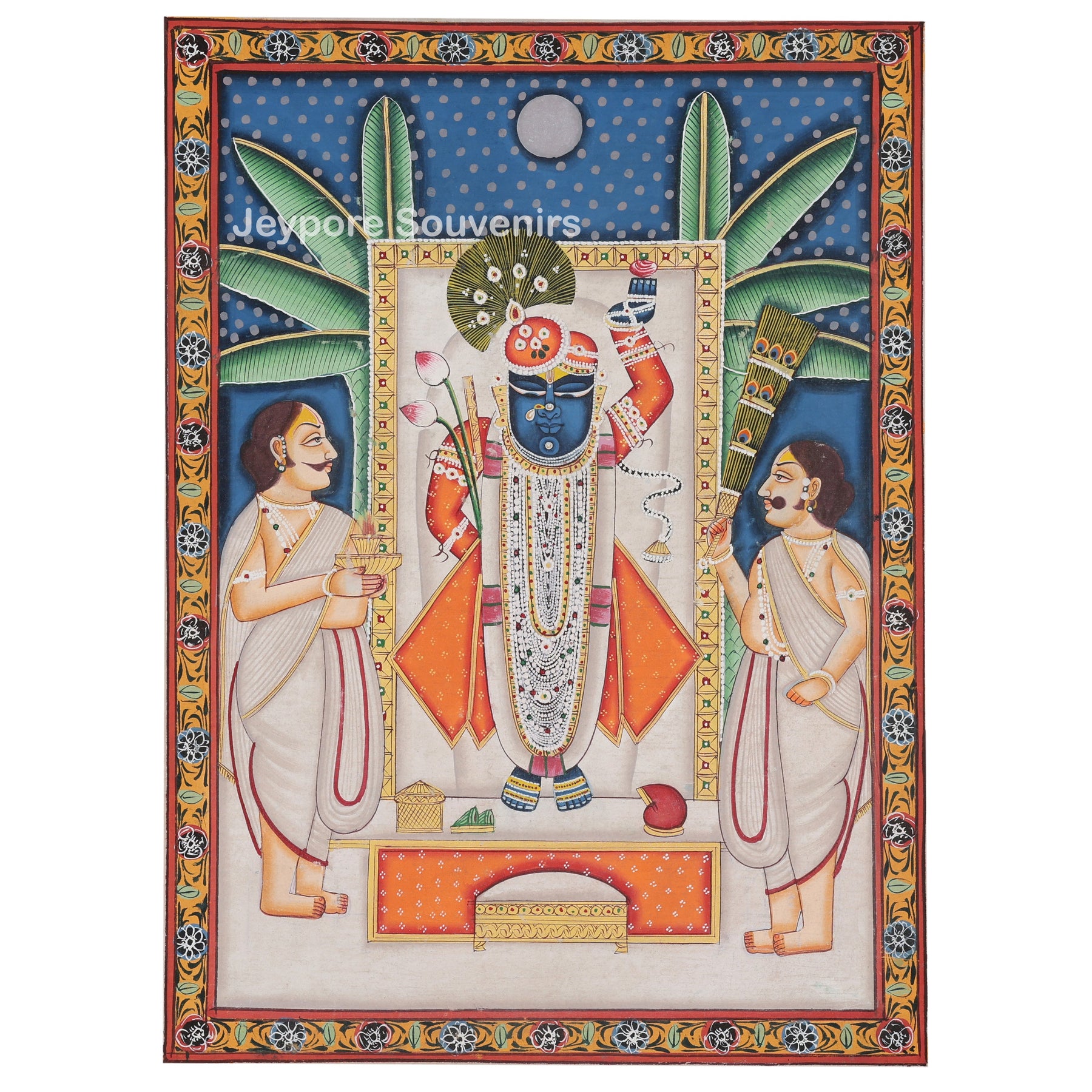 The painting features rich, vibrant hues royal blue, saffron orange, and pristine white that highlight the divine aura of Shrinathji under the moonlit sky and banana leaves backdrop, symbolizing purity, prosperity, and divine protection. This artwork is perfect for temple walls, pooja rooms, or as elegant home décor infusing your space with serenity, color, and divine blessings.
