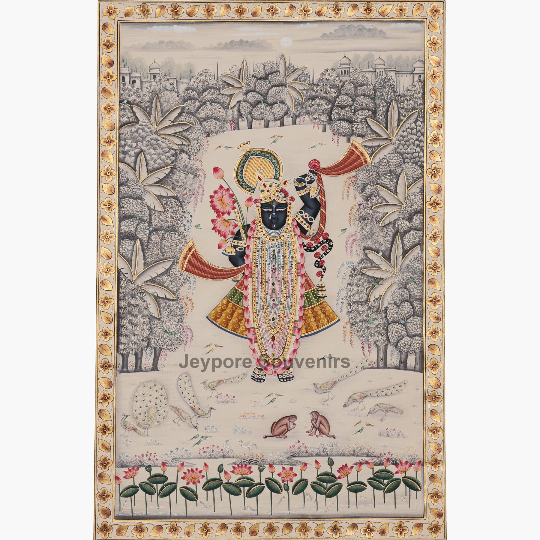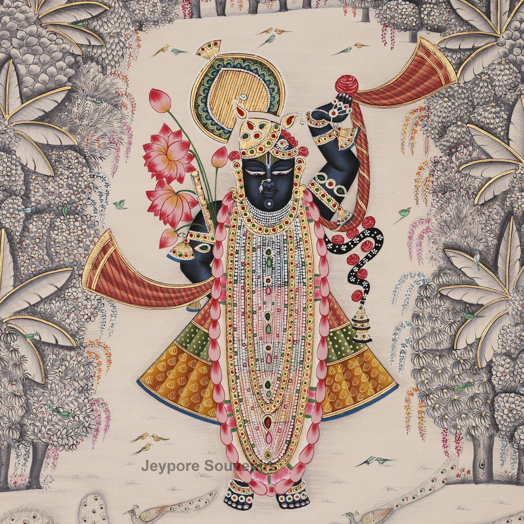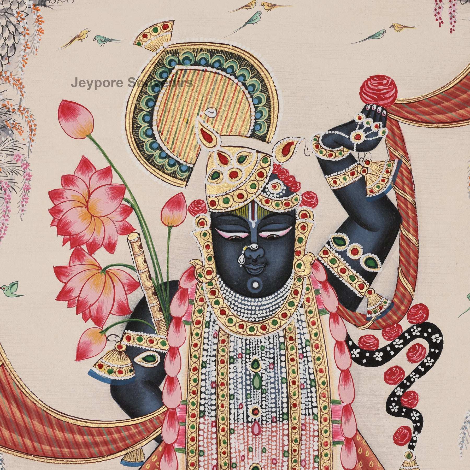 This exquisite Shrinath Ji Pichwai Painting on Silk is a masterful blend of traditional devotion and intricate craftsmanship, created to bring divine grace into any space. Hand-painted with meticulous detailing, the artwork features Shrinath Ji in his iconic pose, adorned with vibrant jewels, lotus flowers, and rich traditional attire that captures the true essence of Nathdwara artistry. Painted on premium silk fabric, this masterpiece offers a luxurious texture, and long-lasting vibrance, making it an exceptional choice for home décor, gifting, or personal spiritual connection.