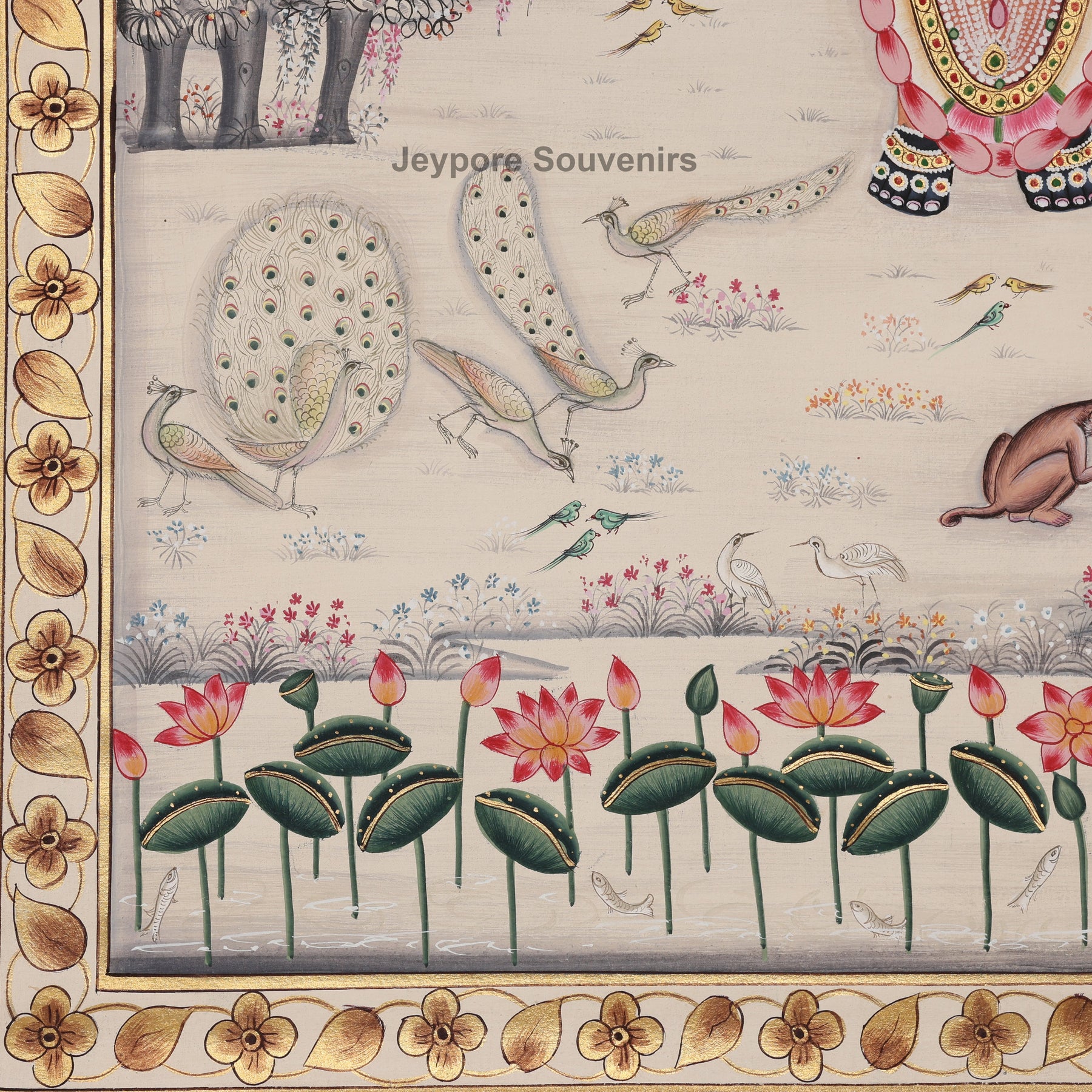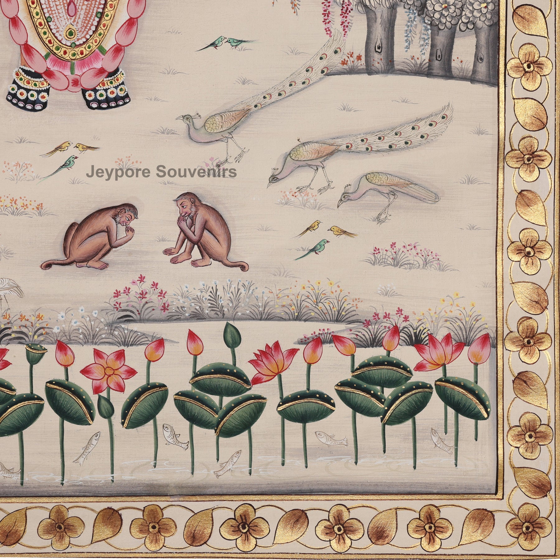 The border is elegantly designed with floral patterns that frame the central deity, enhancing the overall richness of the piece. Whether placed in a living room, meditation space, office, or temple area, this painting not only elevates the ambience but also brings an aura of peace, devotion, and traditional charm.