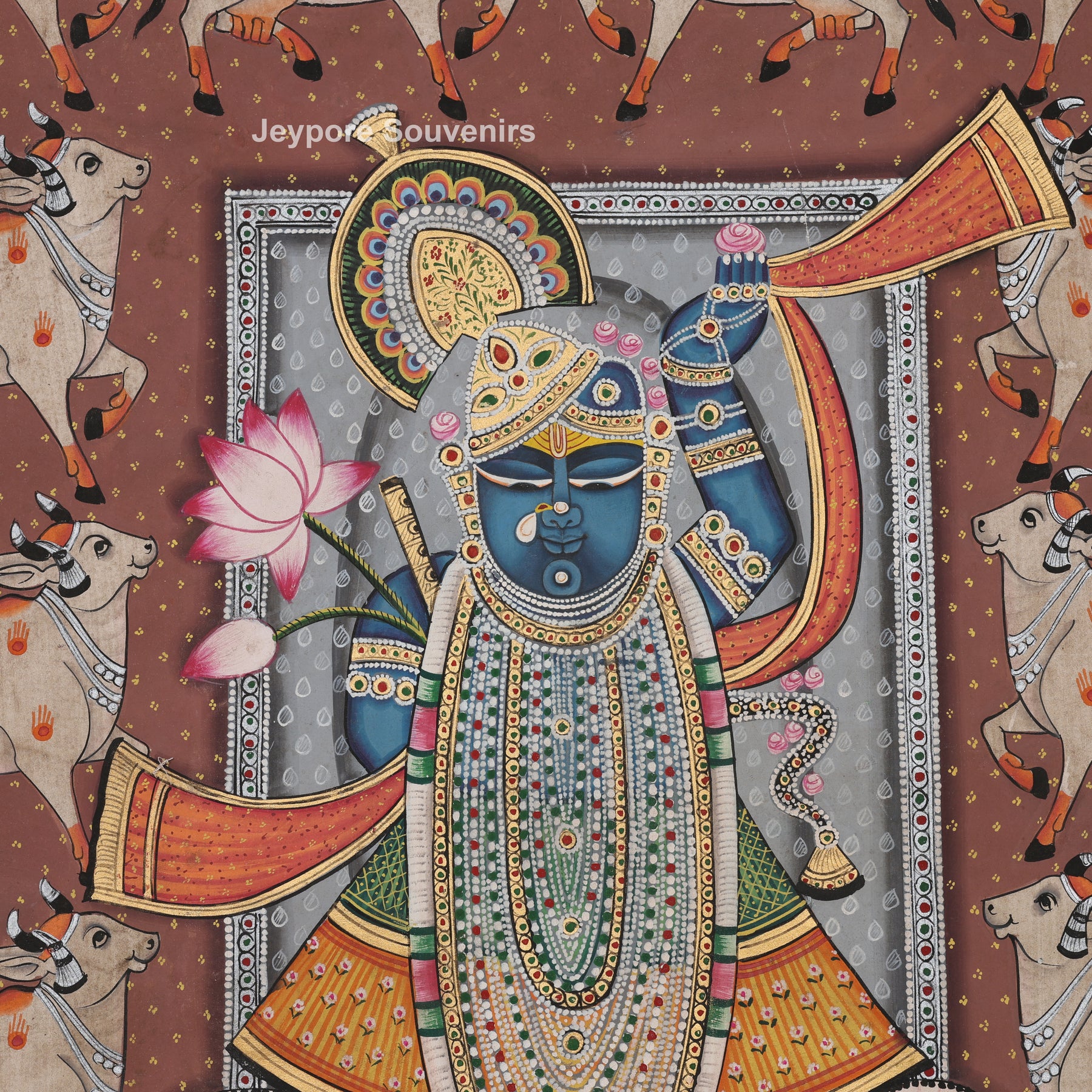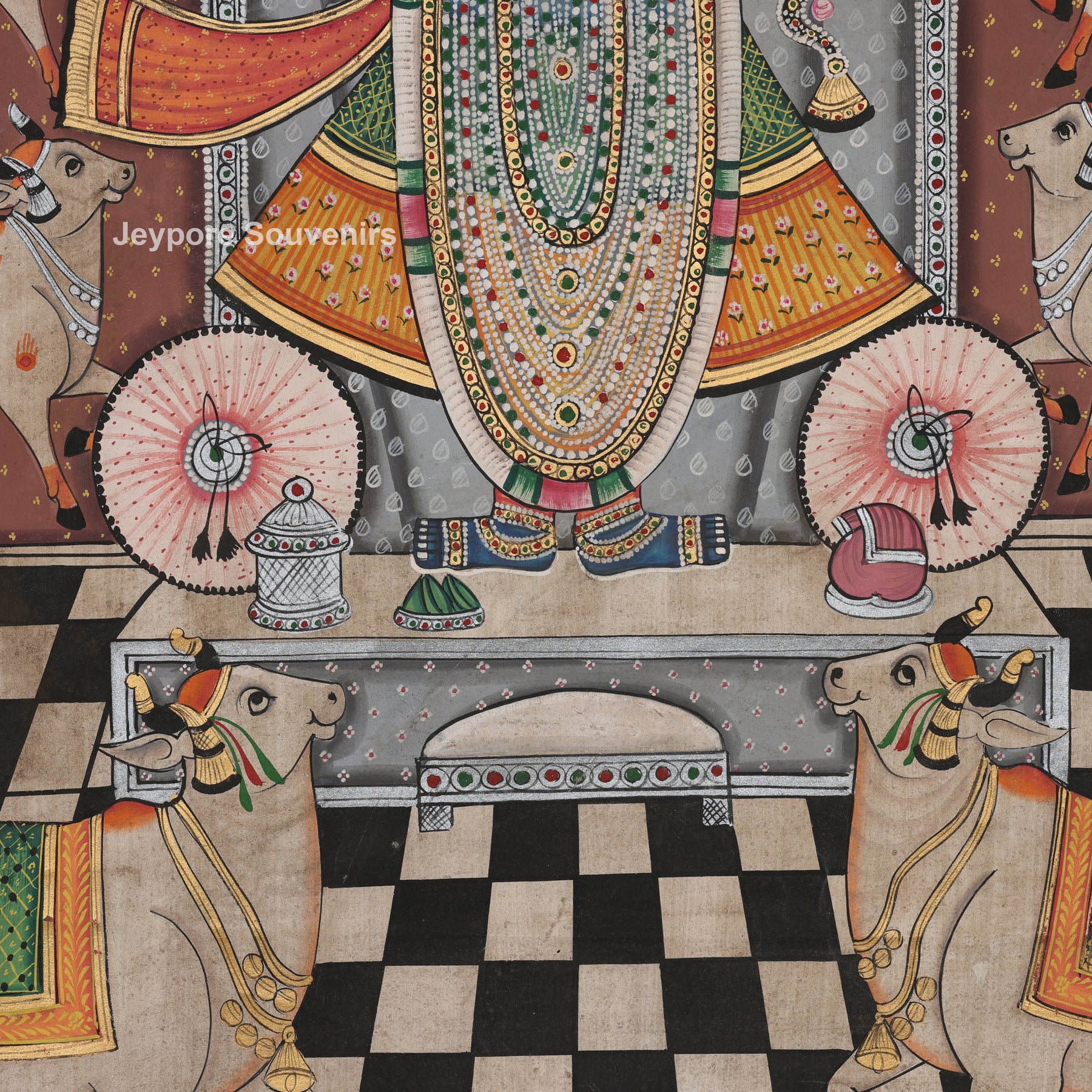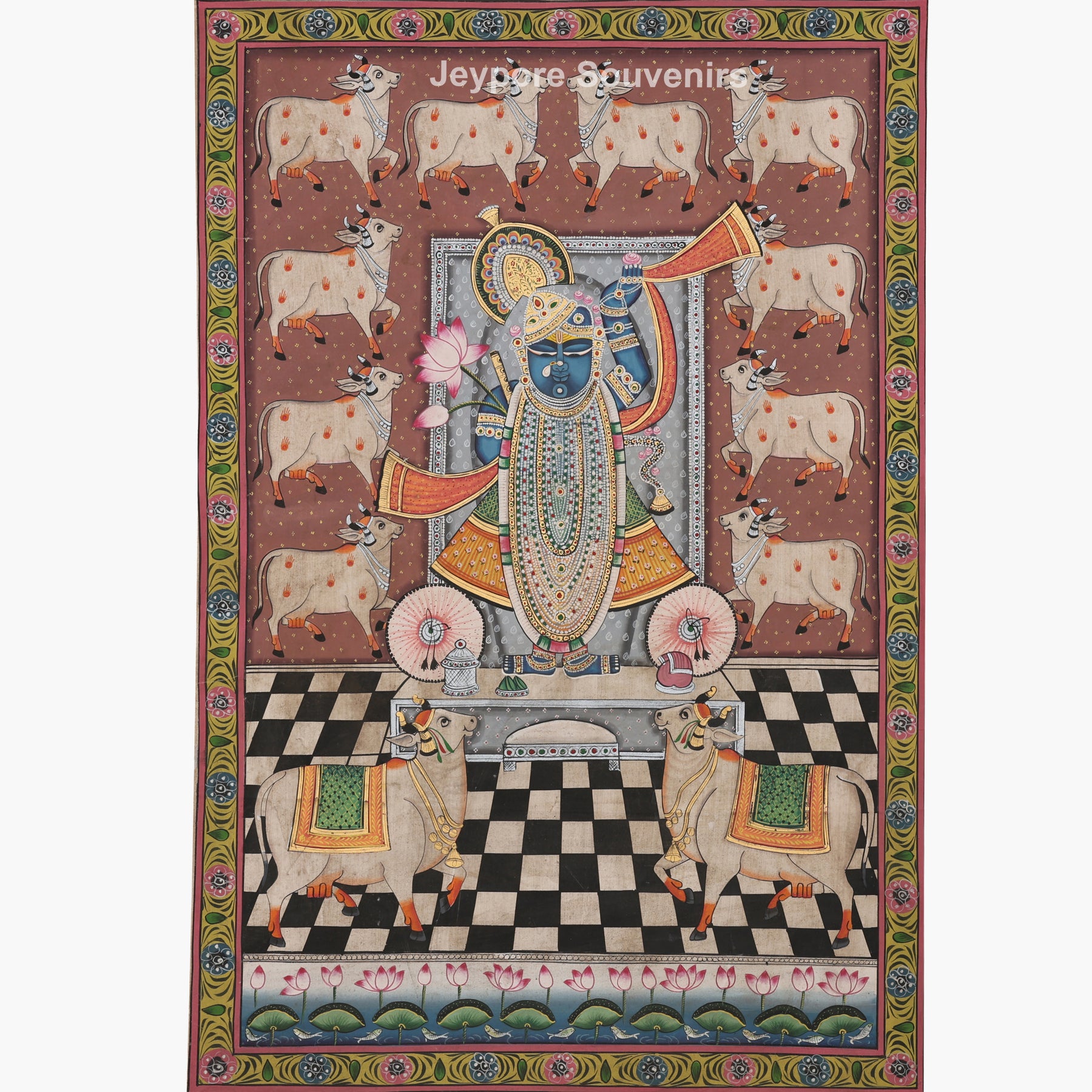 Pichwai painting features Shrinathji, the revered form of Lord Krishna, standing in divine grace at the center of a richly detailed temple setting. Surrounded by a repeating border of sacred cows, the artwork reflects themes of devotion, protection, prosperity, and spiritual abundance deeply rooted in temple traditions.