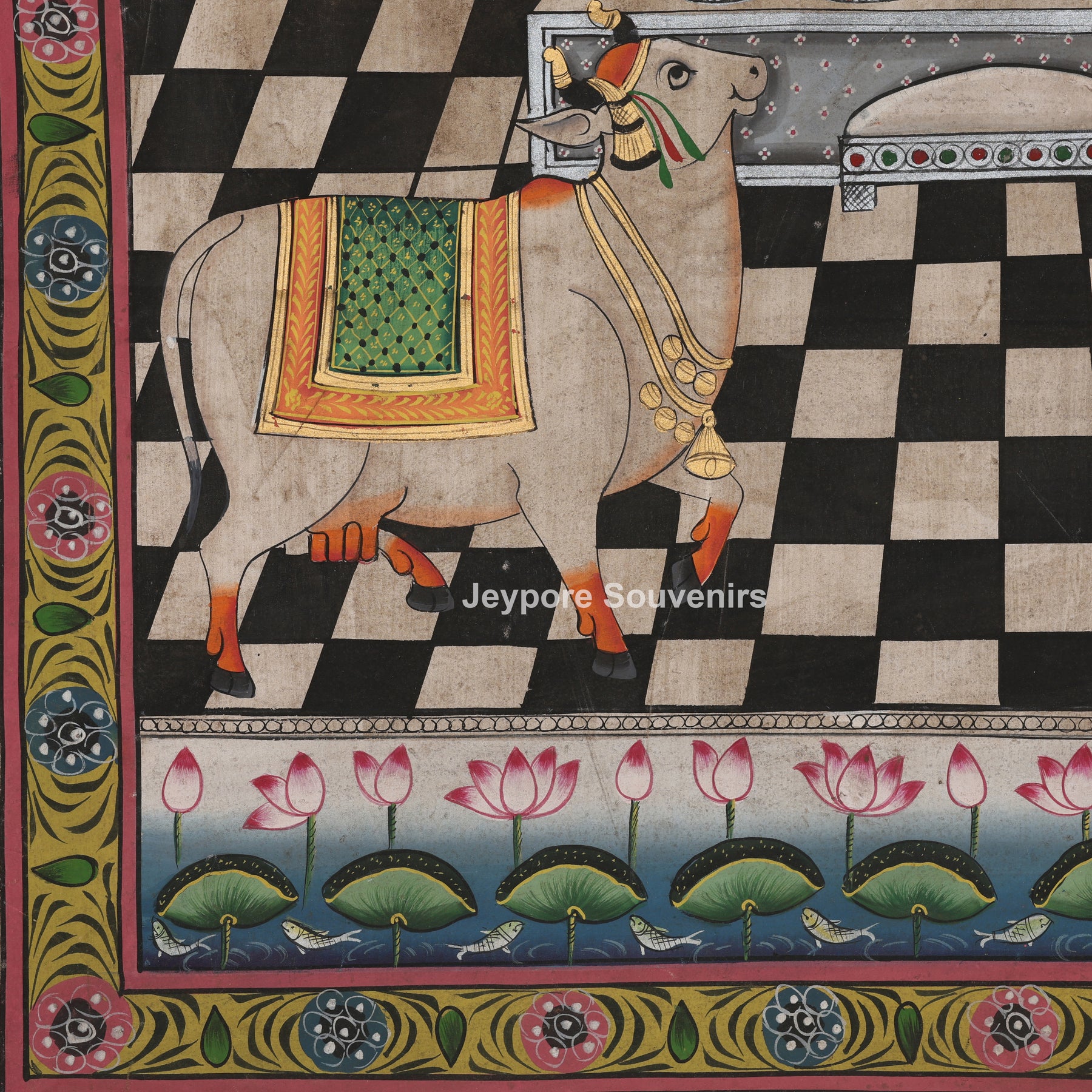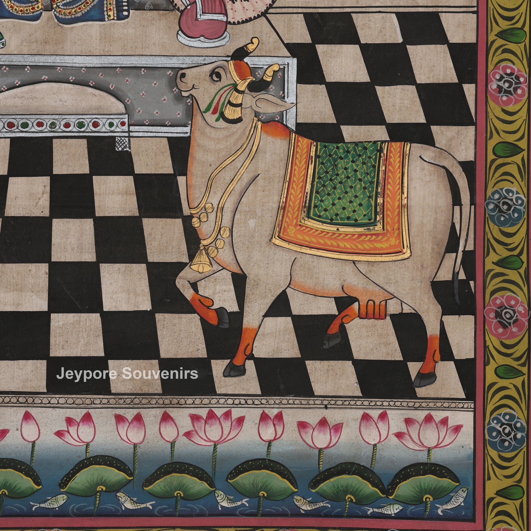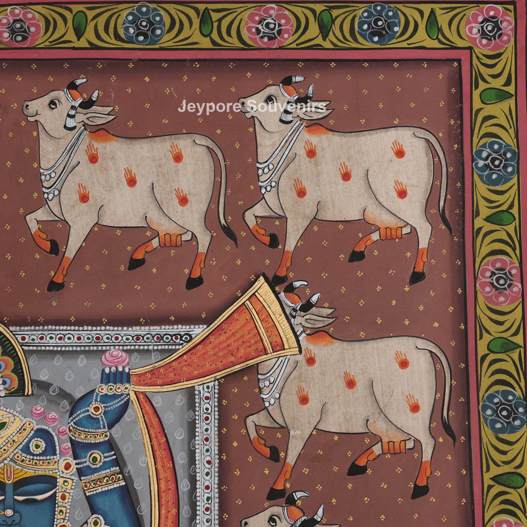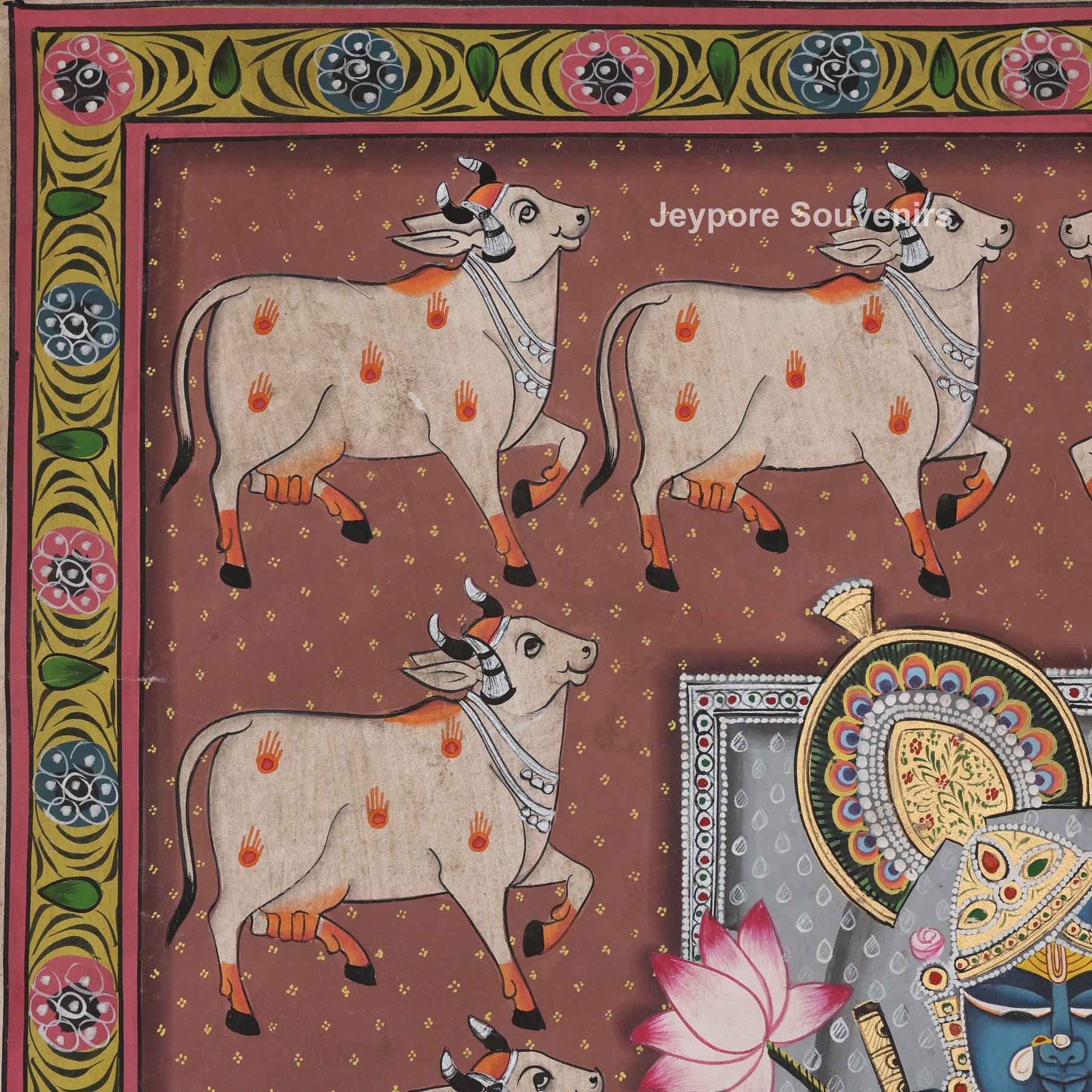 Pichwai painting features Shrinathji, the revered form of Lord Krishna, standing in divine grace at the center of a richly detailed temple setting. Surrounded by a repeating border of sacred cows, the artwork reflects themes of devotion, protection, prosperity, and spiritual abundance deeply rooted in temple traditions.