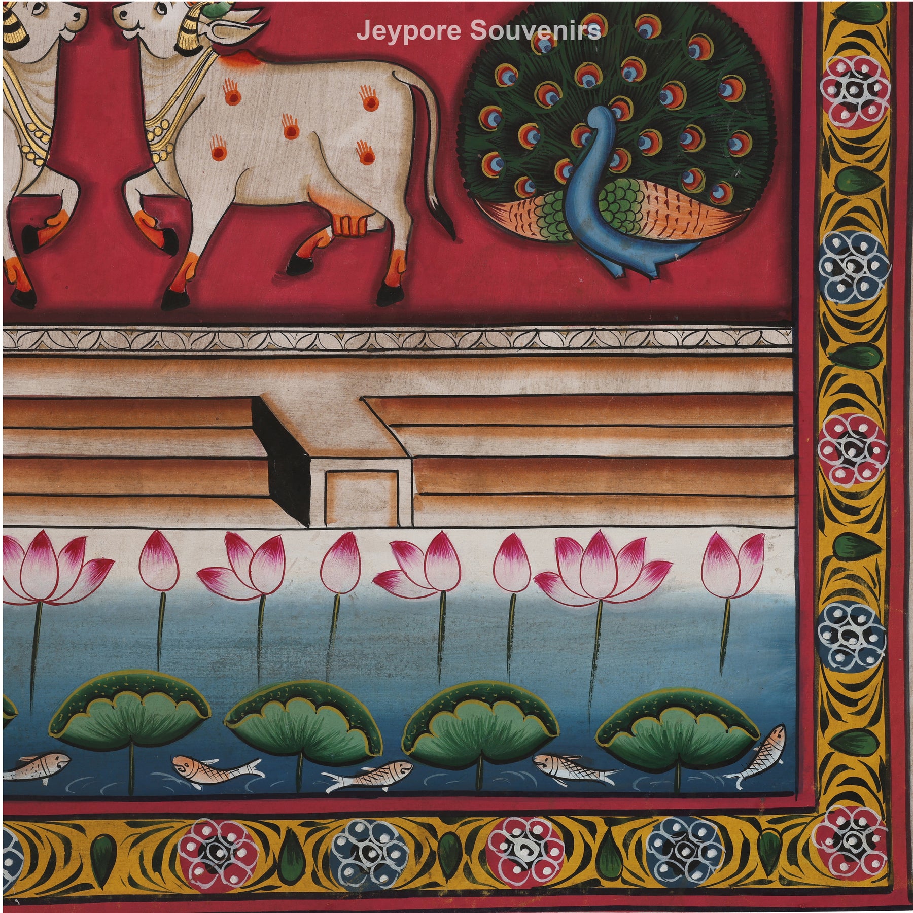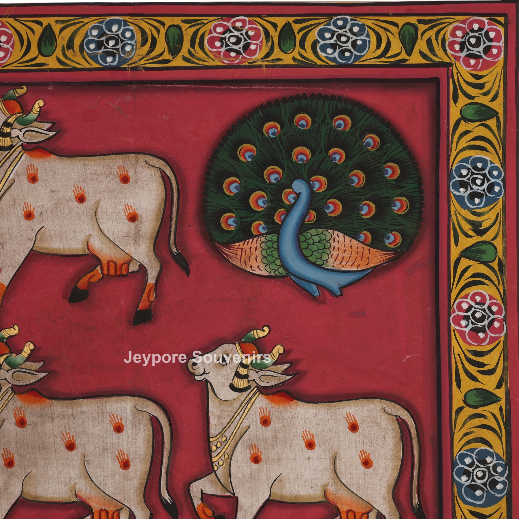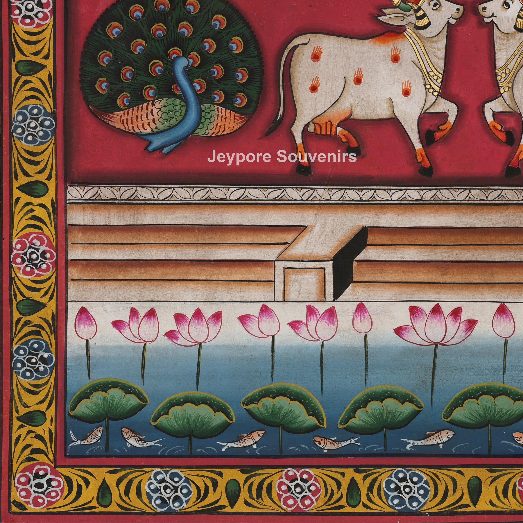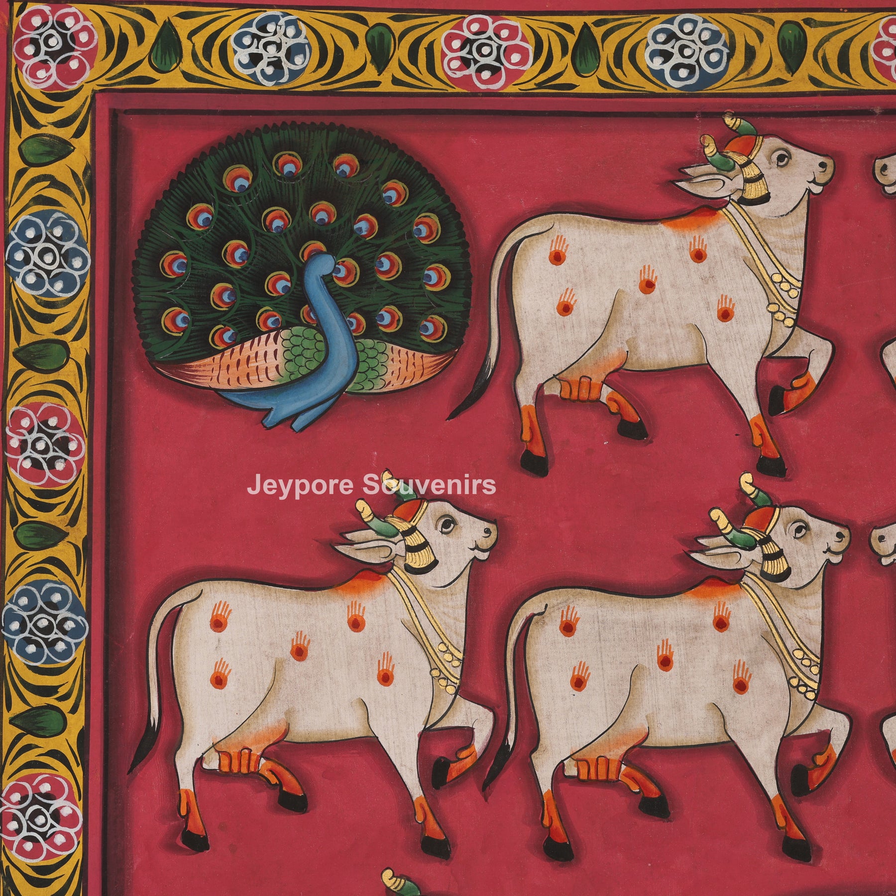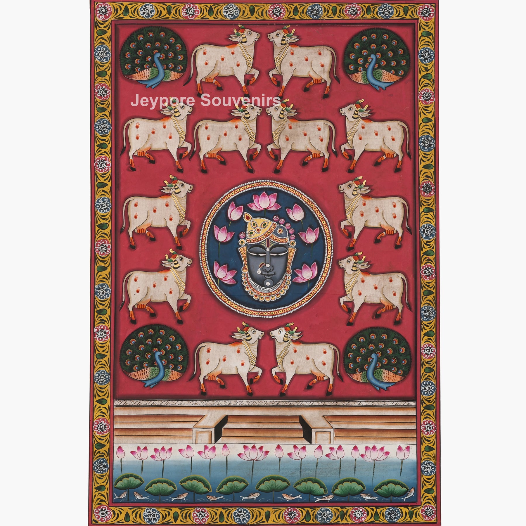 Set against a rich deep red background, the painting is beautifully framed with traditional floral borders inspired by temple art. The symmetrical arrangement and vibrant detailing reflect the spiritual harmony and ritual aesthetics of classical Pichwai paintings.
