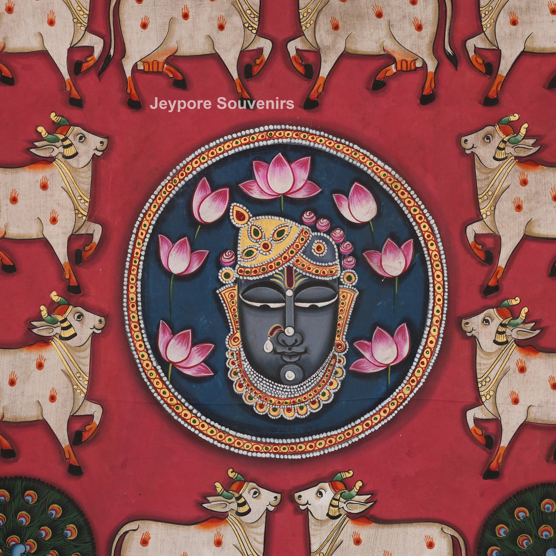 This stunning Pichwai painting presents a sacred mandala-style composition centered around the divine face of Shrinathji, the revered form of Lord Krishna. Encircled by auspicious elements such as sacred cows, blooming lotus flowers, and peacocks, the painting symbolizes devotion, abundance, purity, and divine protection.