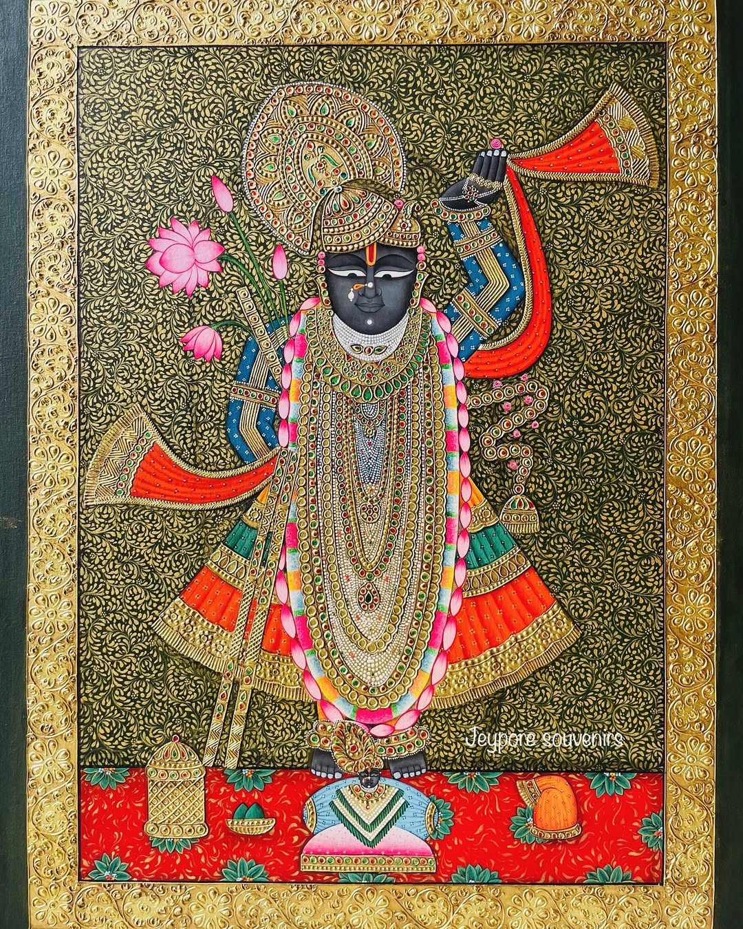 Skilled artisans meticulously apply real gold leaf to embellish the jewelry, crown, halo, and ornamental motifs. The background is painted using premium pigments, and the fine linework around Shrinathji’s face, garments, and surroundings reveals the incredible care and patience invested in each stroke. The embossed detailing provides a subtle three-dimensional effect, elevating this from a flat painting to a regal devotional piece.
