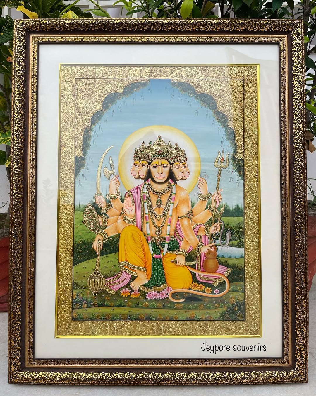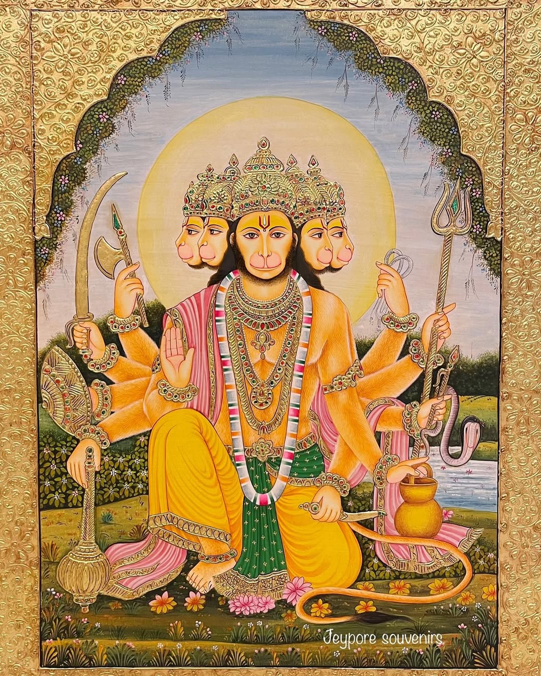 Tanjore style Hand-Painted Panchmukhi Hanumanji painting with real gold leaf work
