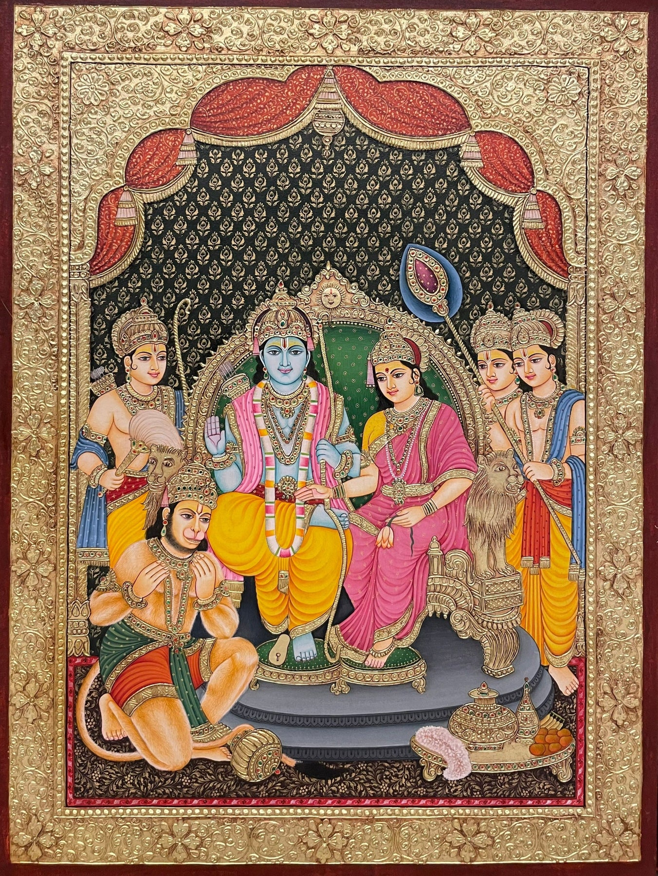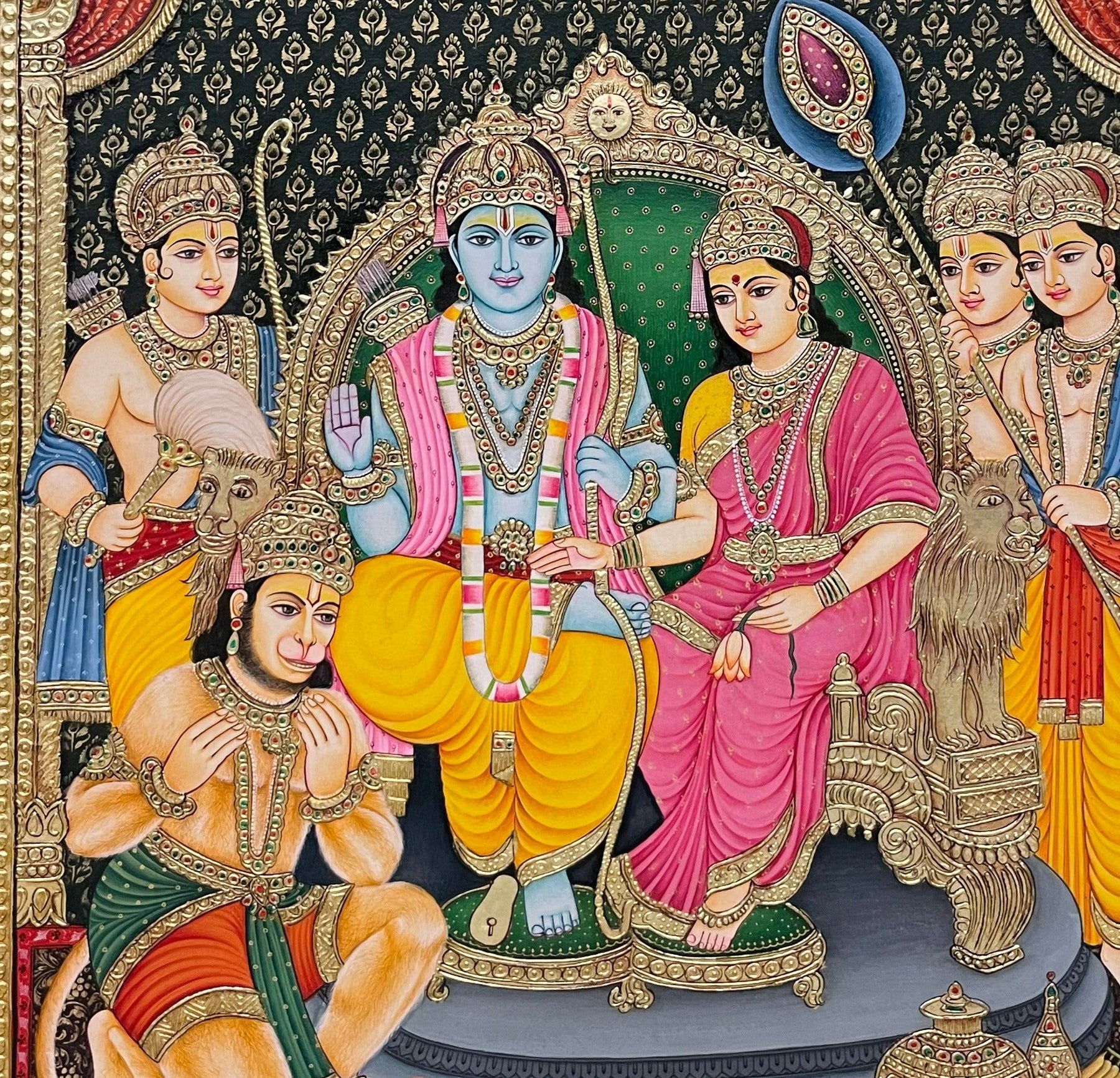 While general Ram paintings may show Rama alone or in battle scenes, Ram Darbar specifically shows the royal council scene Rama enthroned with Sita, Lakshmana, and Hanuman often in rich regal ornamentation and arched frames. The Tanjore style adds gold leaf and embossed relief, giving it a three-dimensional luminosity.