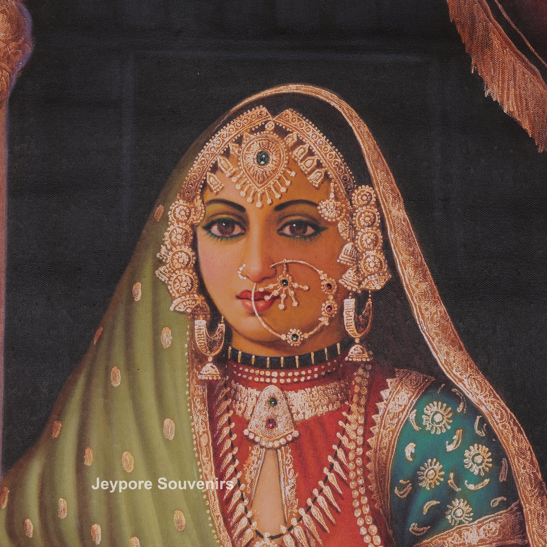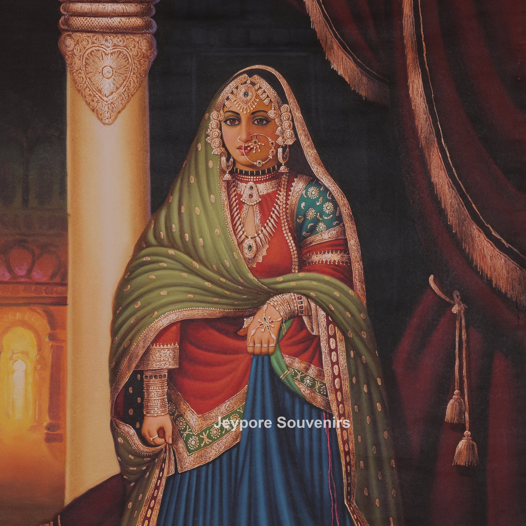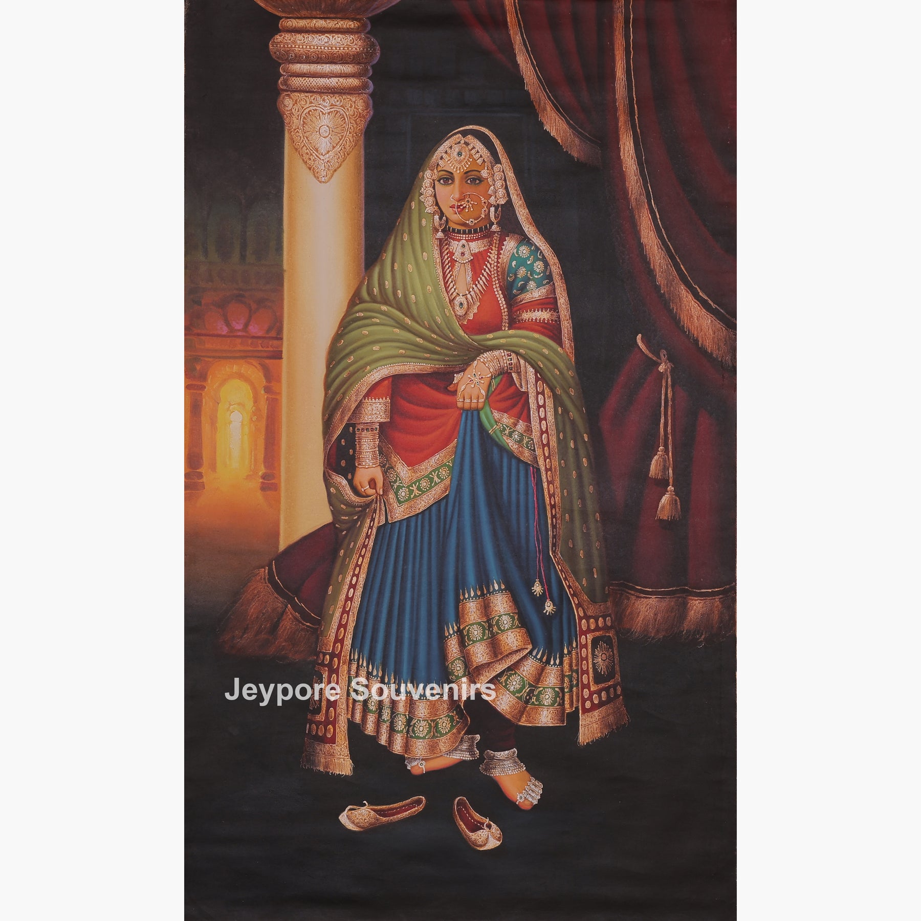 This painting a single woman standing gracefully inside a palace setting. She is wearing rich traditional clothes with detailed designs and heavy jewelry. Her dupatta covers her head, and her expression is calm and dignified. She is standing near a decorated pillar and soft curtains, which give a royal feeling to the scene. Her footwear is placed on the floor, showing respect and tradition. Warm light in the background adds depth and beauty. Overall, the artwork highlights traditional culture, elegance, and royal lifestyle in a simple and peaceful way.