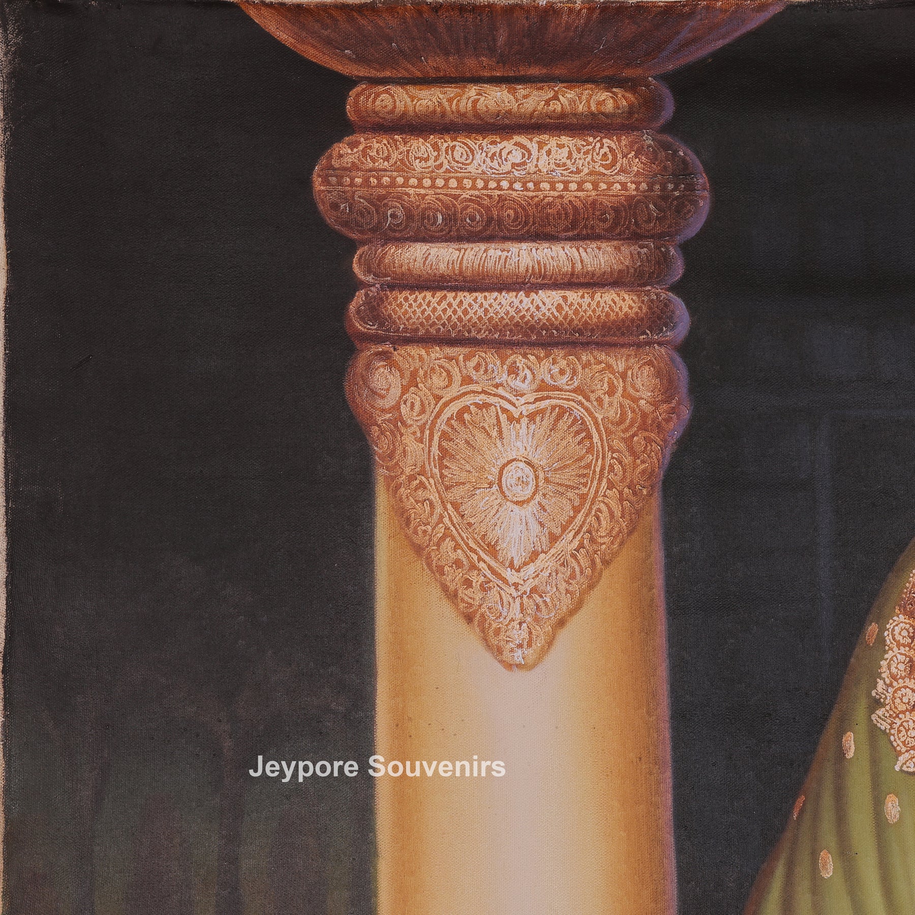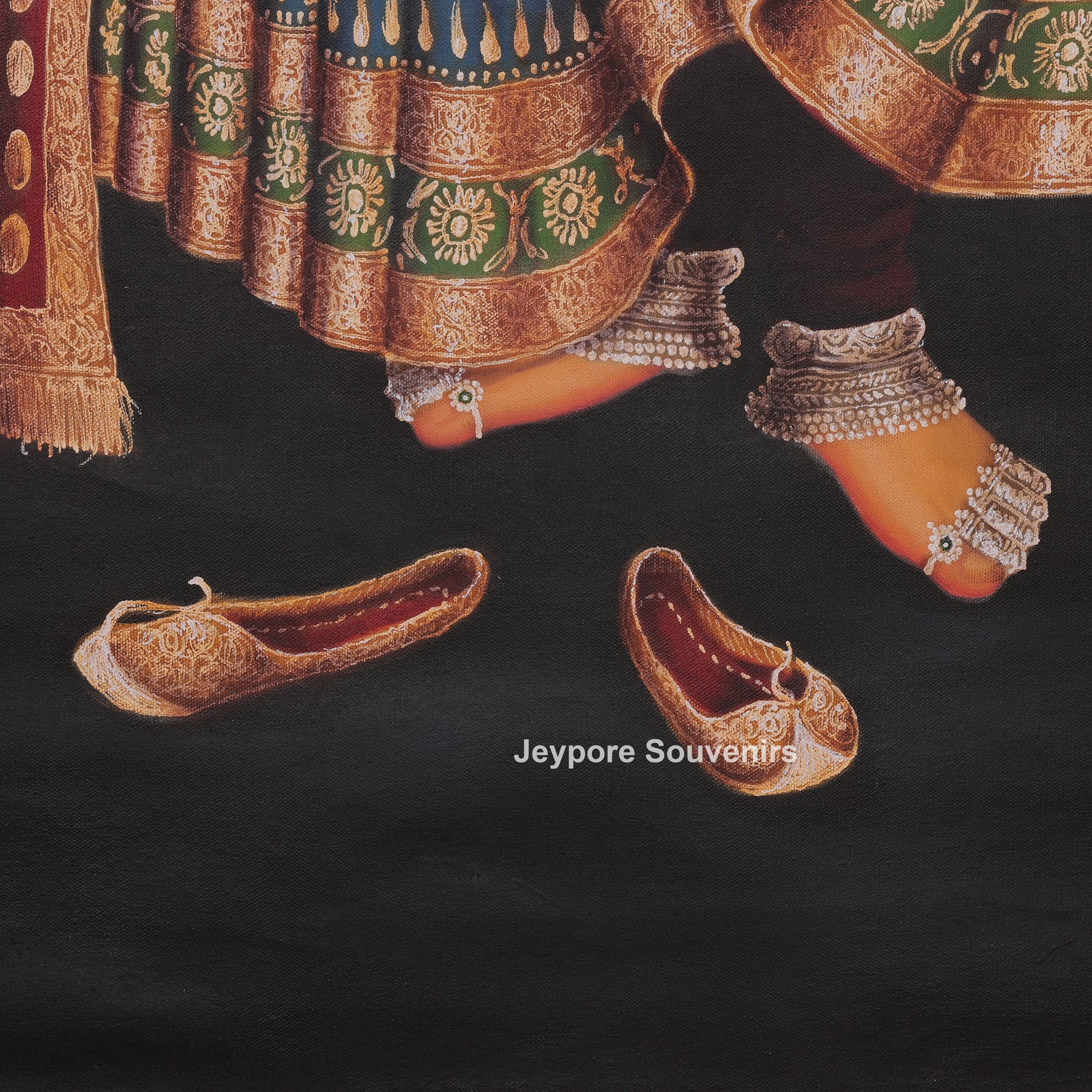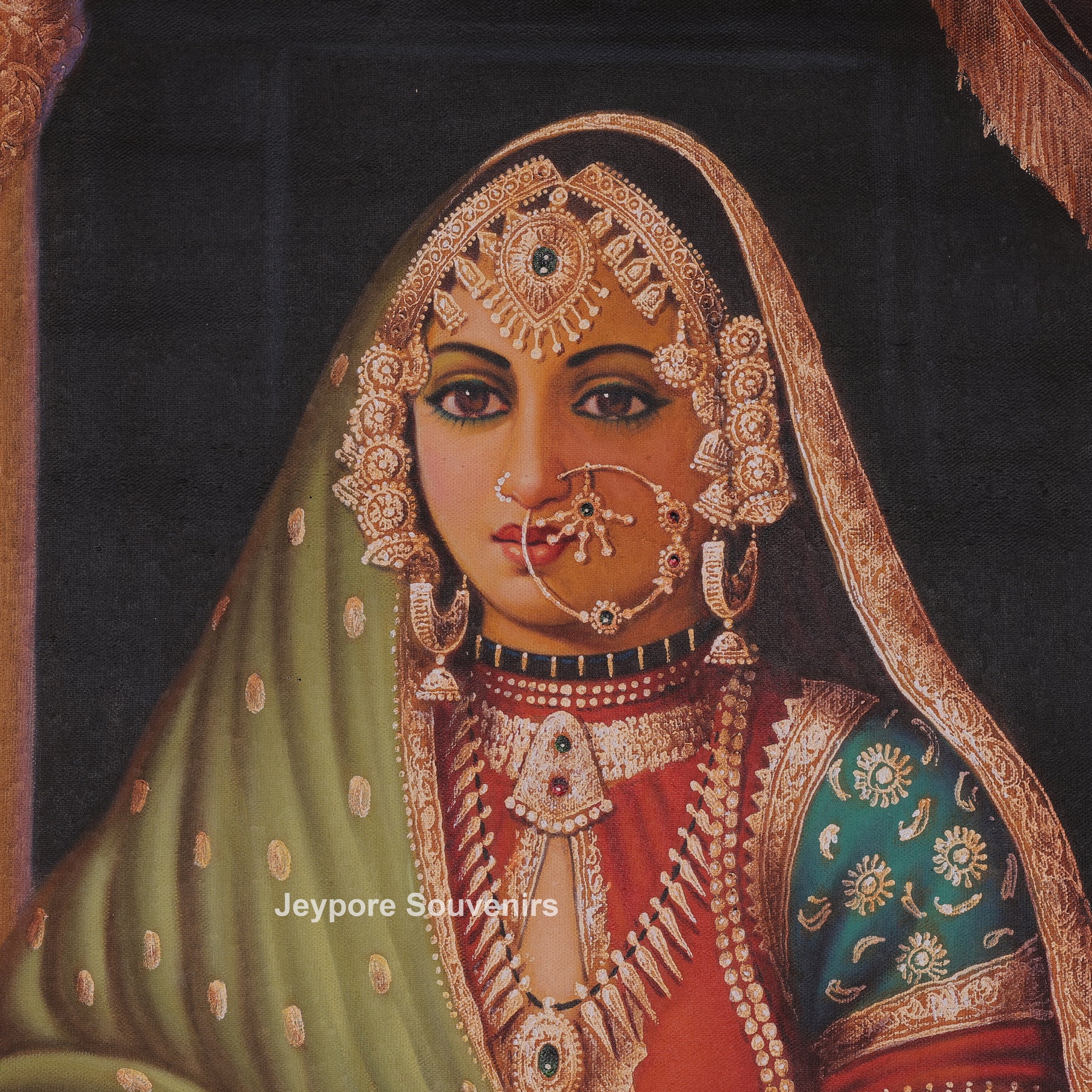 This painting a single woman standing gracefully inside a palace setting. She is wearing rich traditional clothes with detailed designs and heavy jewelry. Her dupatta covers her head, and her expression is calm and dignified. She is standing near a decorated pillar and soft curtains, which give a royal feeling to the scene. Her footwear is placed on the floor, showing respect and tradition. Warm light in the background adds depth and beauty. Overall, the artwork highlights traditional culture, elegance, and royal lifestyle in a simple and peaceful way.