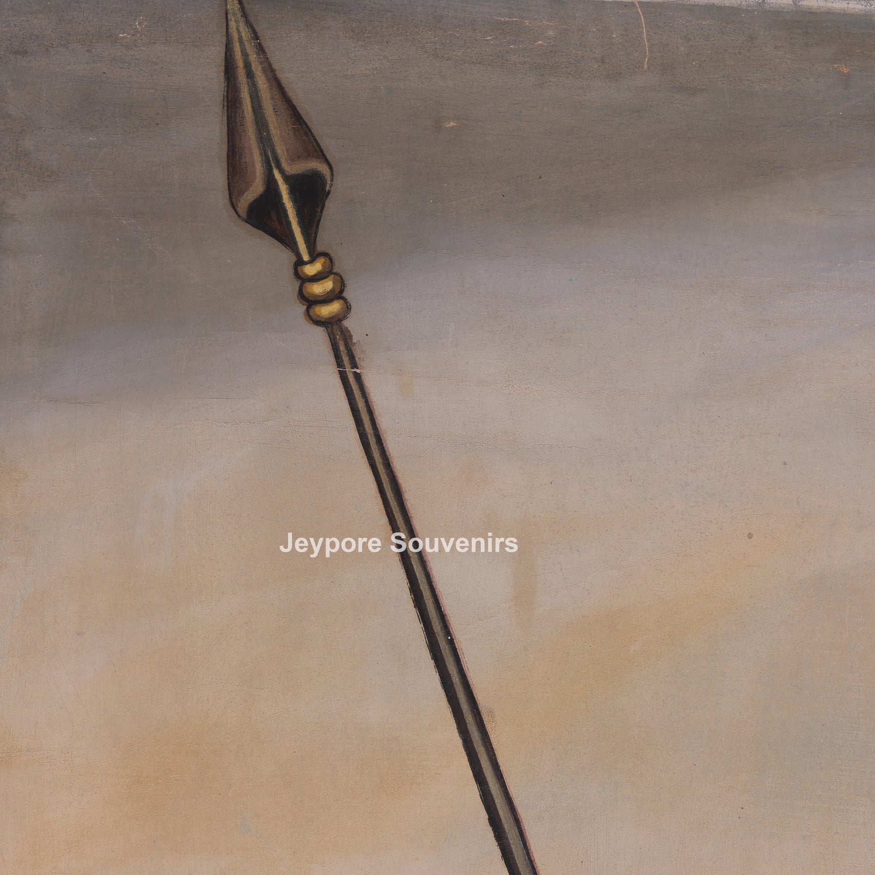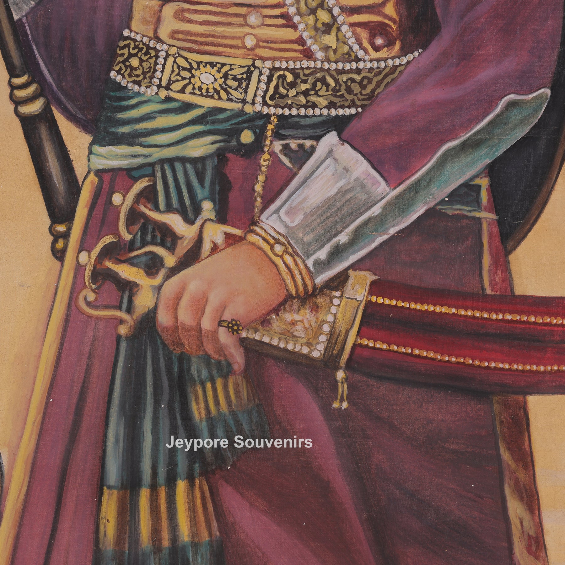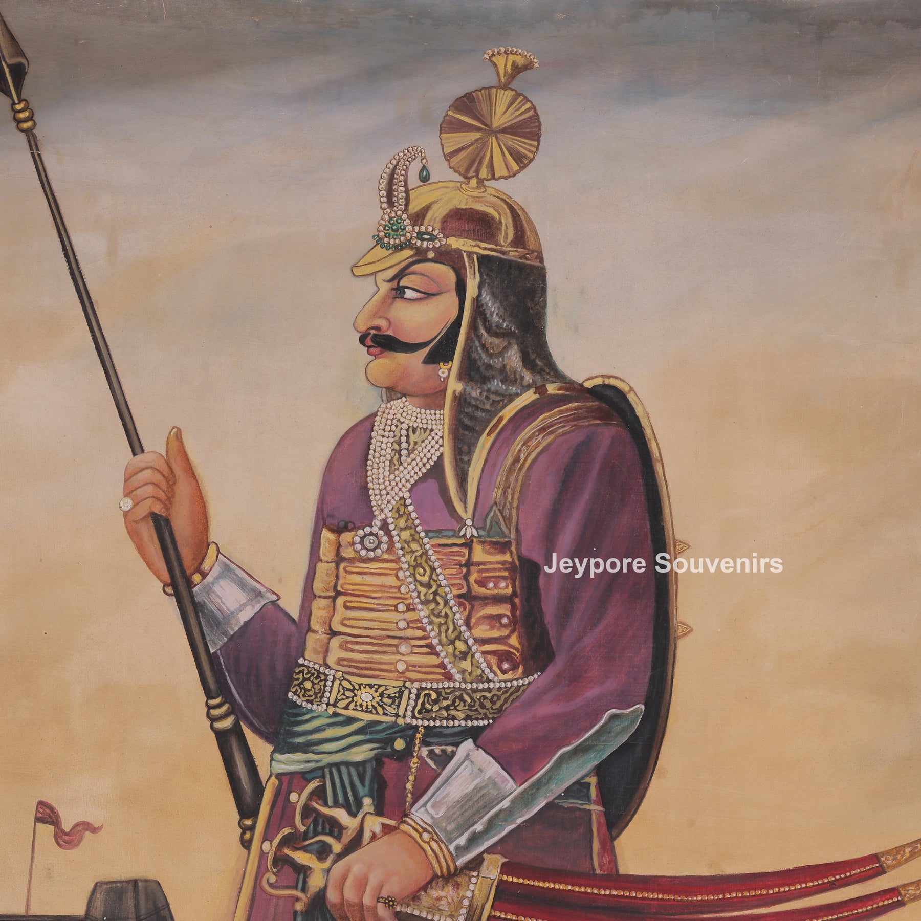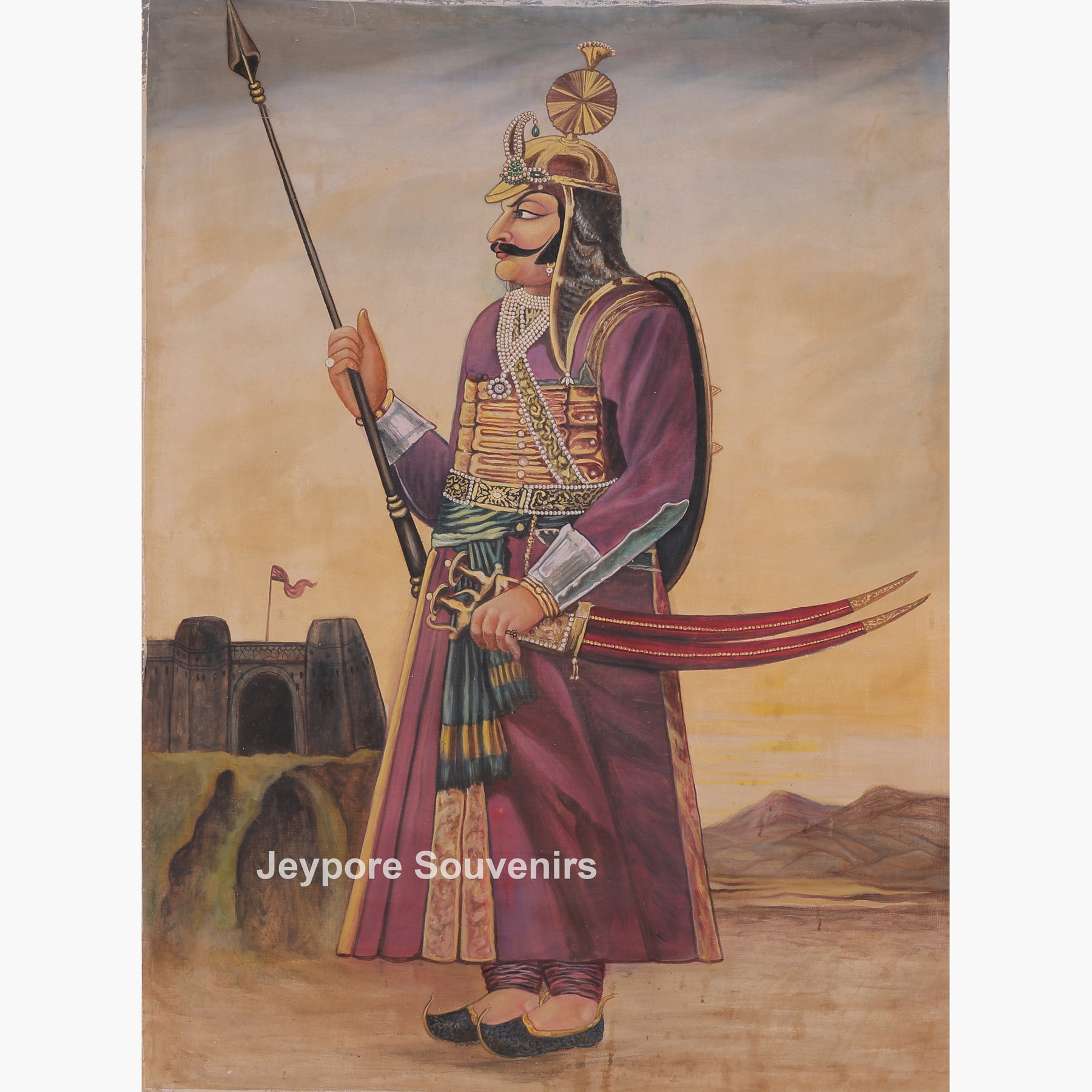 This canvas painting a royal warrior standing proudly in an open landscape. He is dressed in traditional royal clothes and wearing a decorated helmet and jewelry. The man is holding a long spear in one hand and a curved sword in the other, showing strength and bravery. A fort can be seen in the background, along with hills and open land, giving a historic and royal feeling. His posture is calm and confident, as if he is guarding or watching over the land. Overall, the artwork represents courage, royalty, and traditional warrior life.