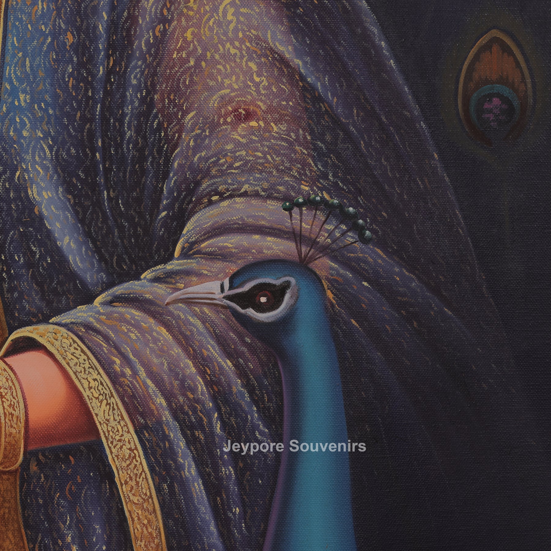 This canvas painting presents a graceful woman dressed in blue tones, seated peacefully with peacocks around her. The painting reflects calm beauty, elegance, and a close connection with nature. The woman is shown holding fruits gently, while the peacocks frame the scene with their flowing forms and detailed feathers, adding balance and visual harmony. Soft shading and smooth brushwork create depth and a soothing atmosphere dominated by blue and teal hues. This handmade piece is created using high-quality canvas, durable wooden framing, and rich acrylic colors that ensure long-lasting brightness. Fine detailing in jewelry, facial expressions, and fabric folds highlights the skill and creativity involved. The composition feels serene and timeless, making it suitable for living rooms, bedrooms, or meditation spaces. This painting brings a sense of peace, grace, and cultural charm to any interior setting.
