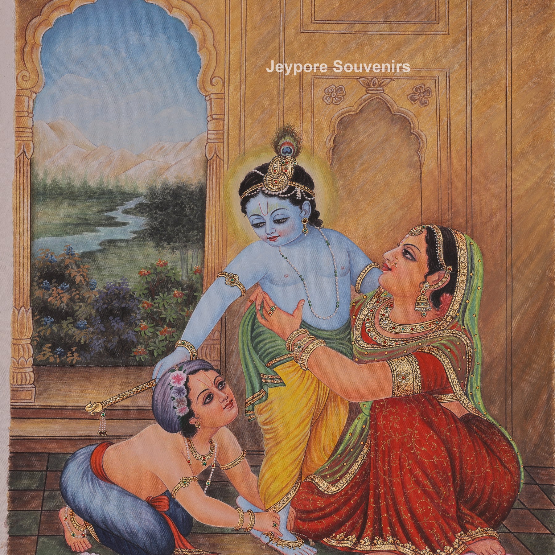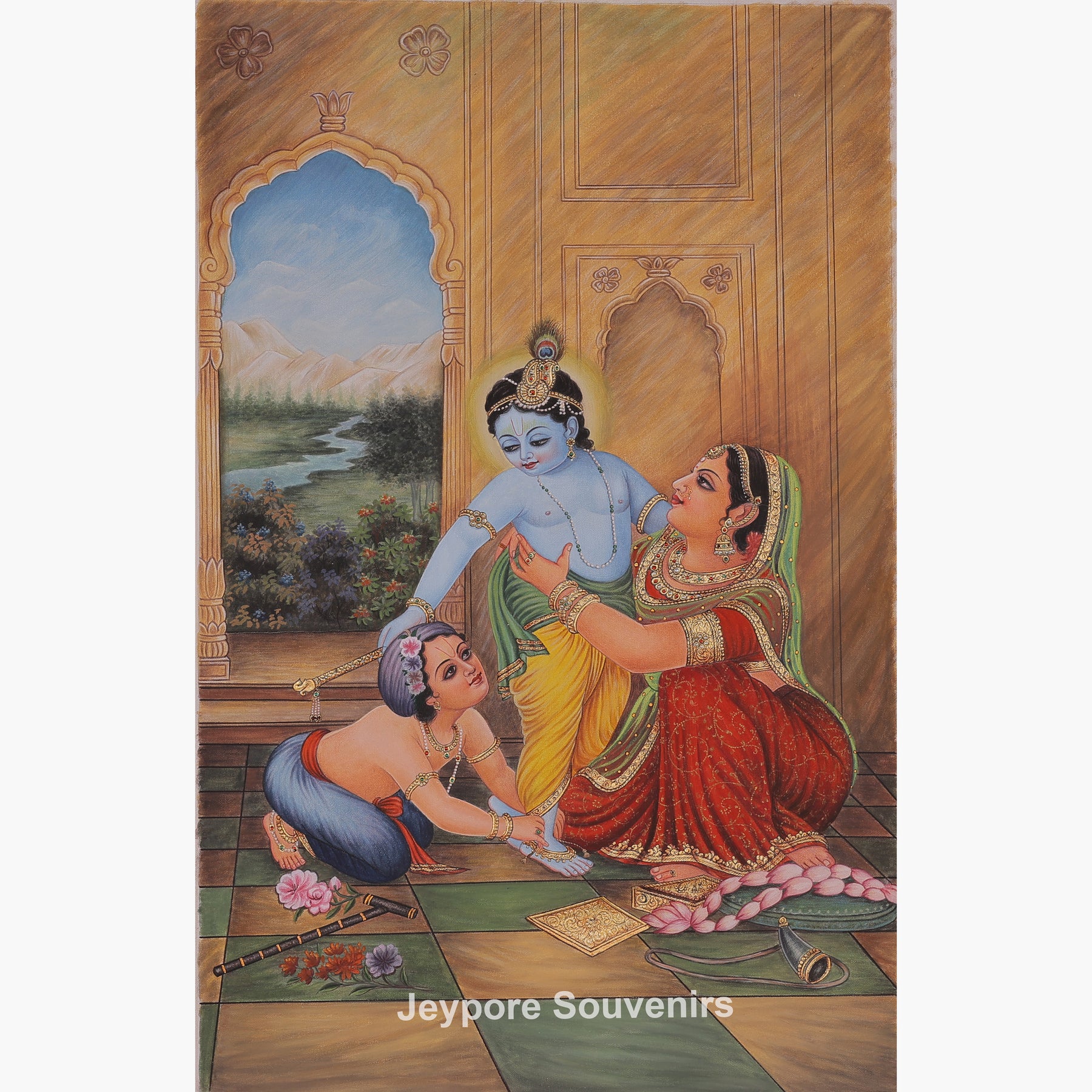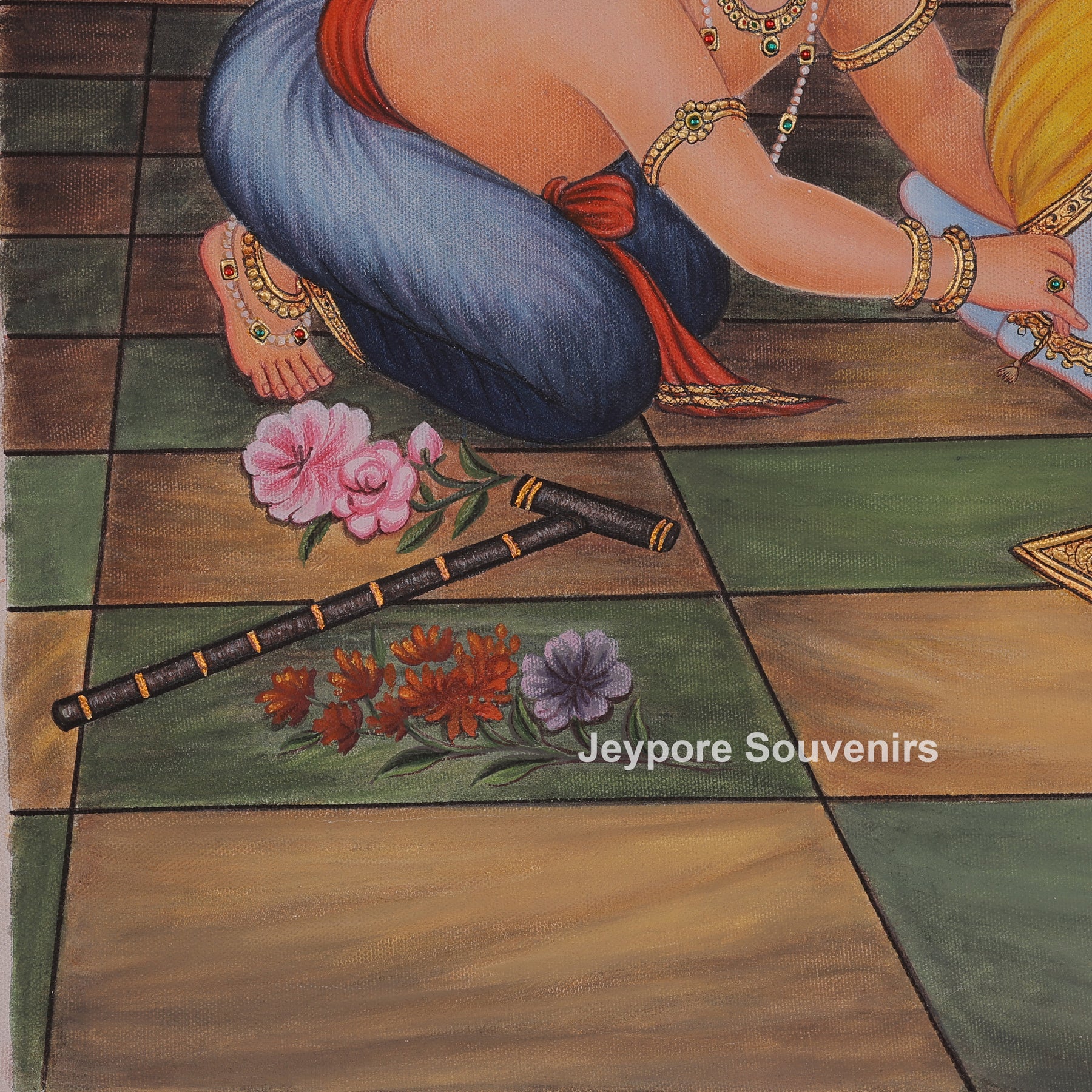 This hand-painted canvas painting artwork shows a loving indoor scene with child Krishna and Mother Yashoda. Krishna is standing gently while Mother Yashoda is holding him with care and affection. Another woman is sitting near Krishna’s feet, helping and attending to him lovingly. Krishna is shown with a soft blue skin tone and simple ornaments, while the women wear beautiful traditional clothes and jewelry. Inside the room, you can see patterned flooring, a window opening to nature, and small objects like flowers and a flute on the floor. The painting shows care, love, and a warm family moment in a peaceful traditional setting.