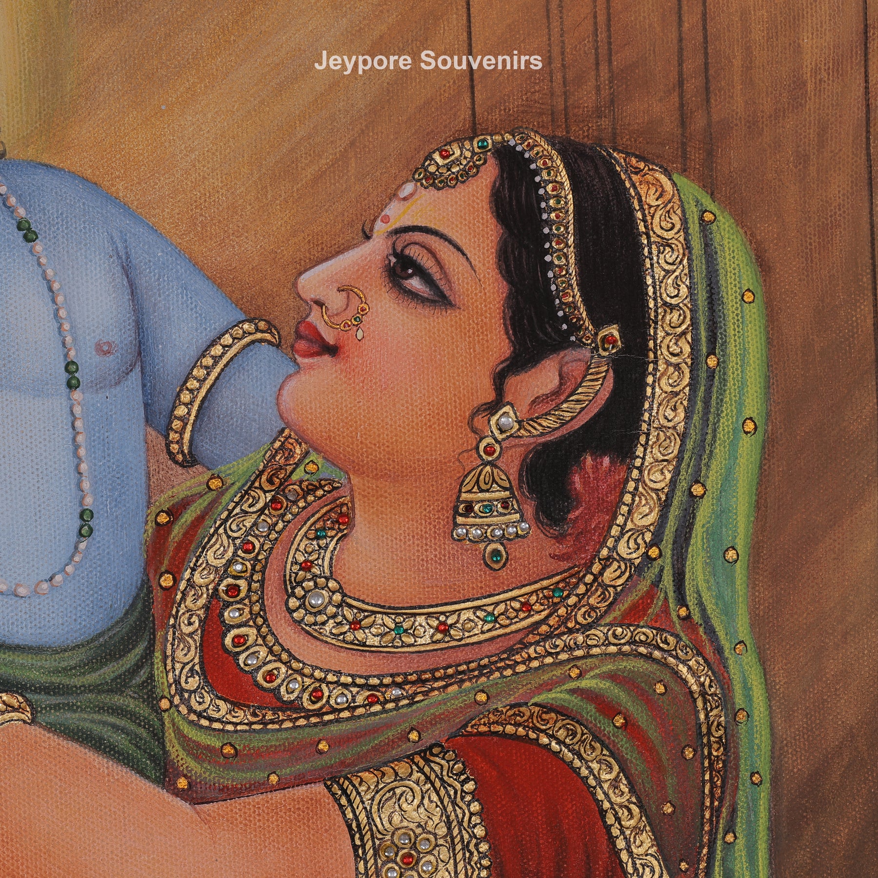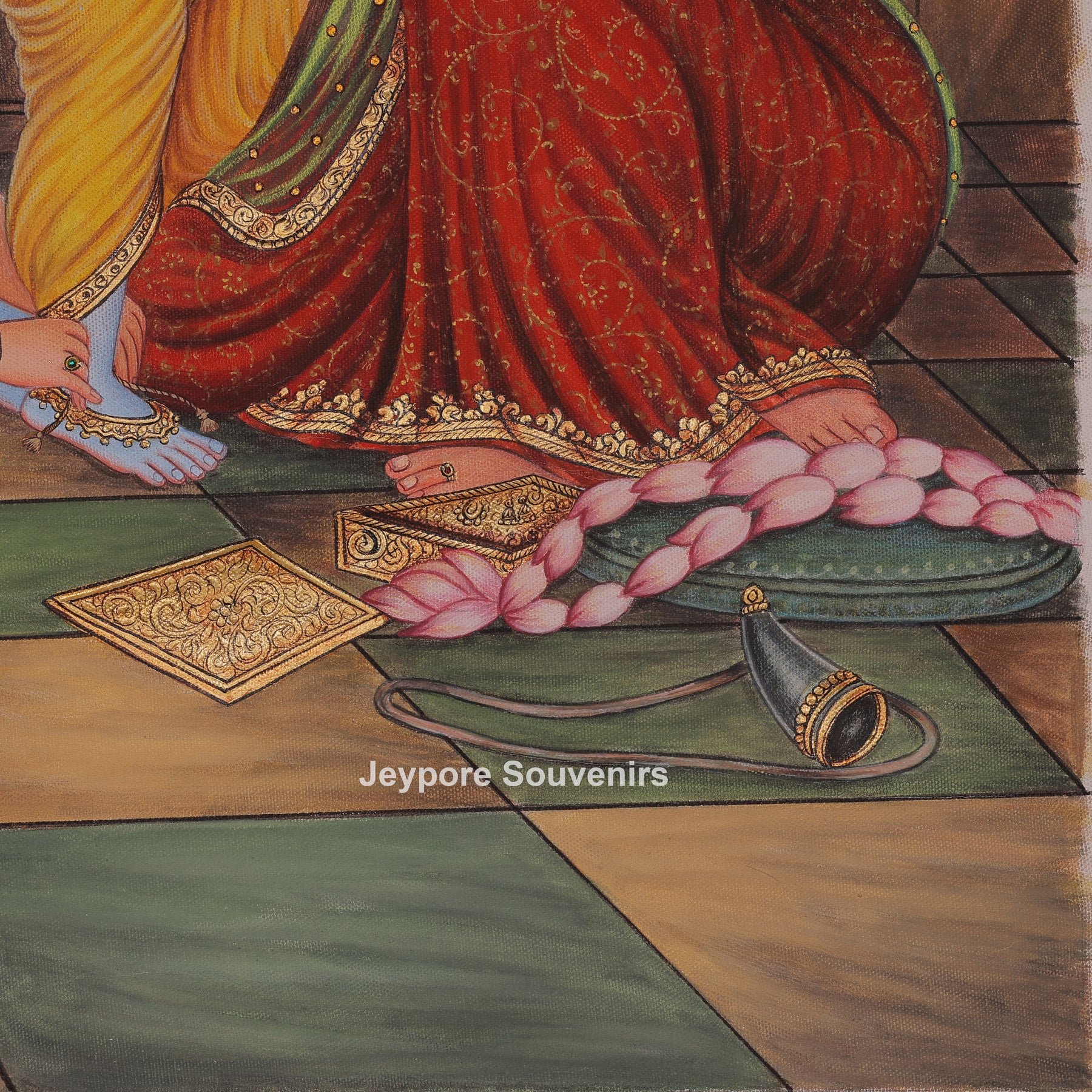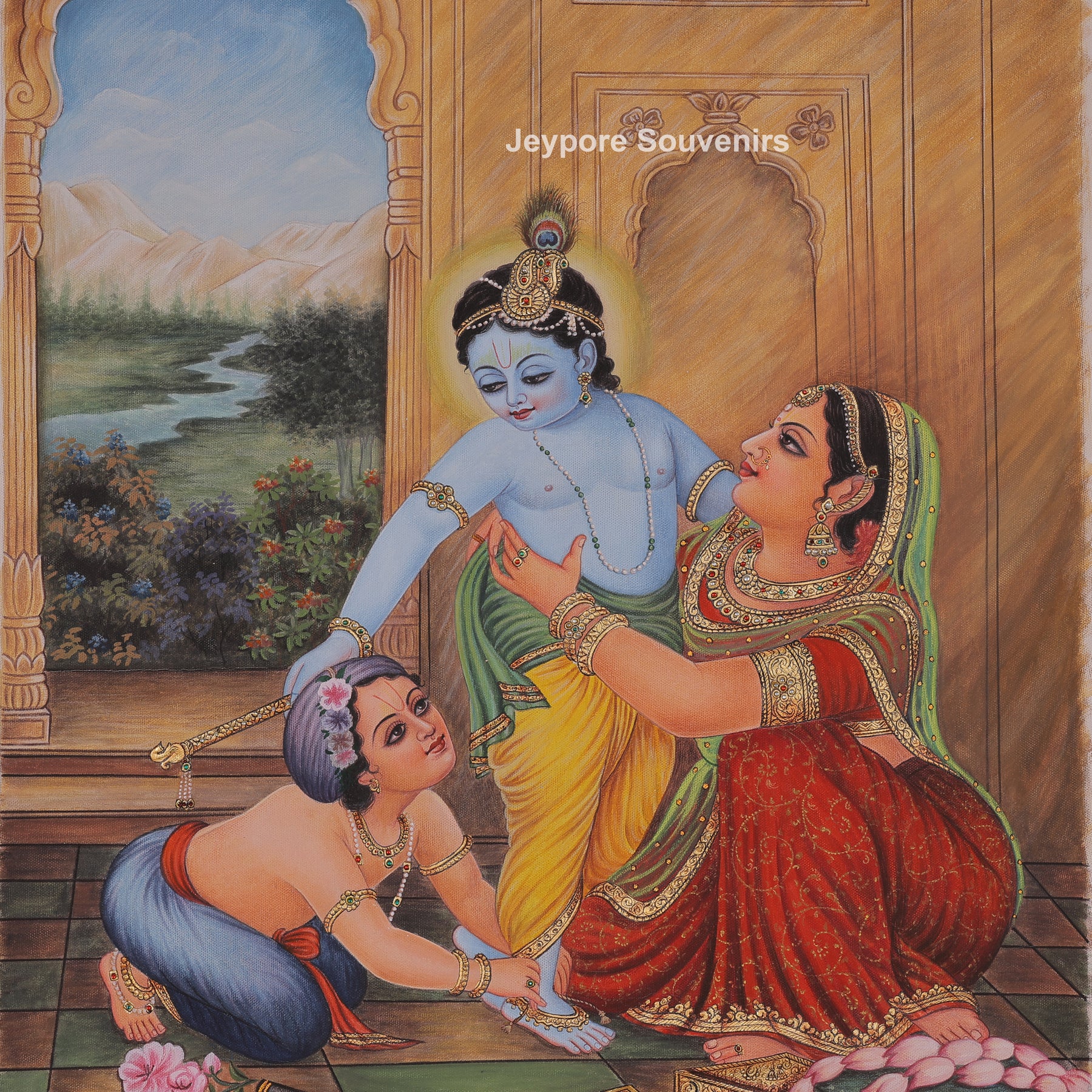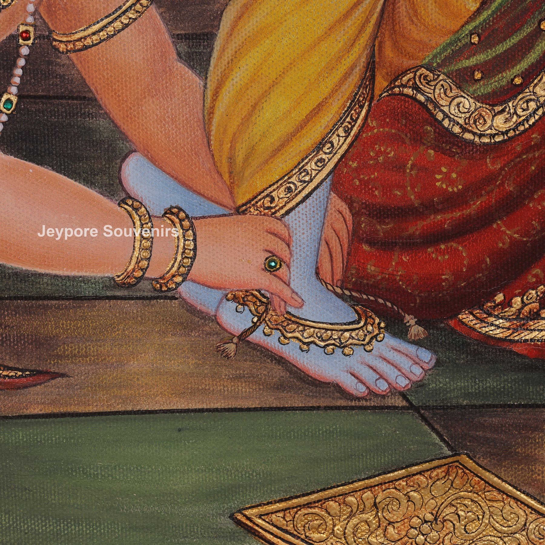 This hand-painted canvas painting artwork shows a loving indoor scene with child Krishna and Mother Yashoda. Krishna is standing gently while Mother Yashoda is holding him with care and affection. Another woman is sitting near Krishna’s feet, helping and attending to him lovingly. Krishna is shown with a soft blue skin tone and simple ornaments, while the women wear beautiful traditional clothes and jewelry. Inside the room, you can see patterned flooring, a window opening to nature, and small objects like flowers and a flute on the floor. The painting shows care, love, and a warm family moment in a peaceful traditional setting.