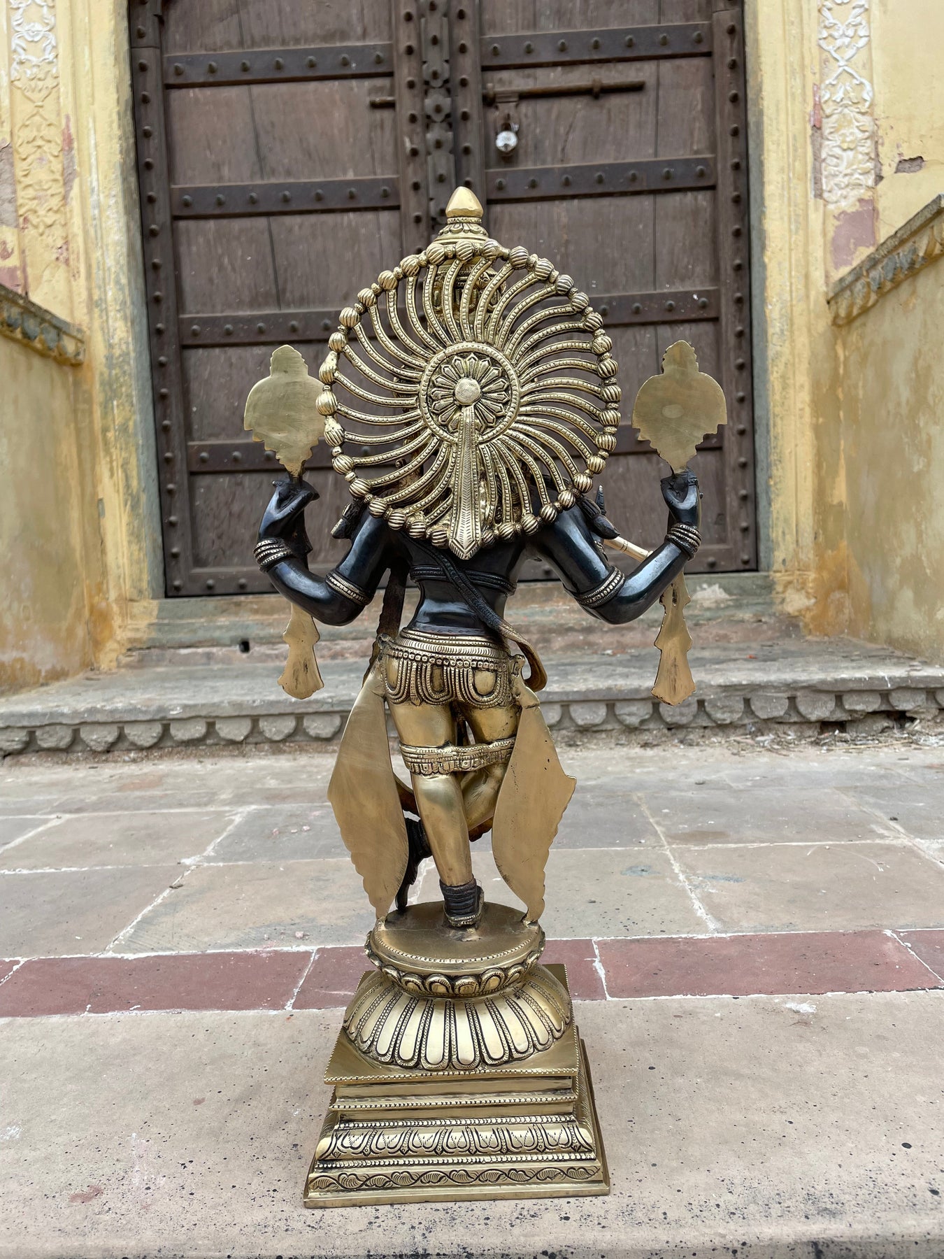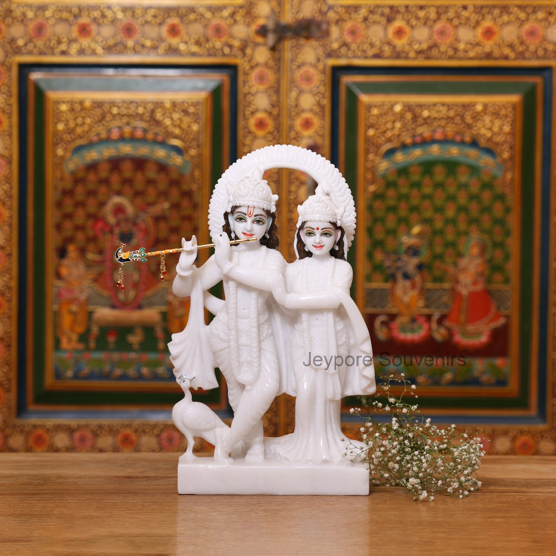 The flute is usually a separate, delicate piece made of metal (often brass) with decorative stones, which allows for finer detail and is placed in the idol’s hands. It is generally not marble.