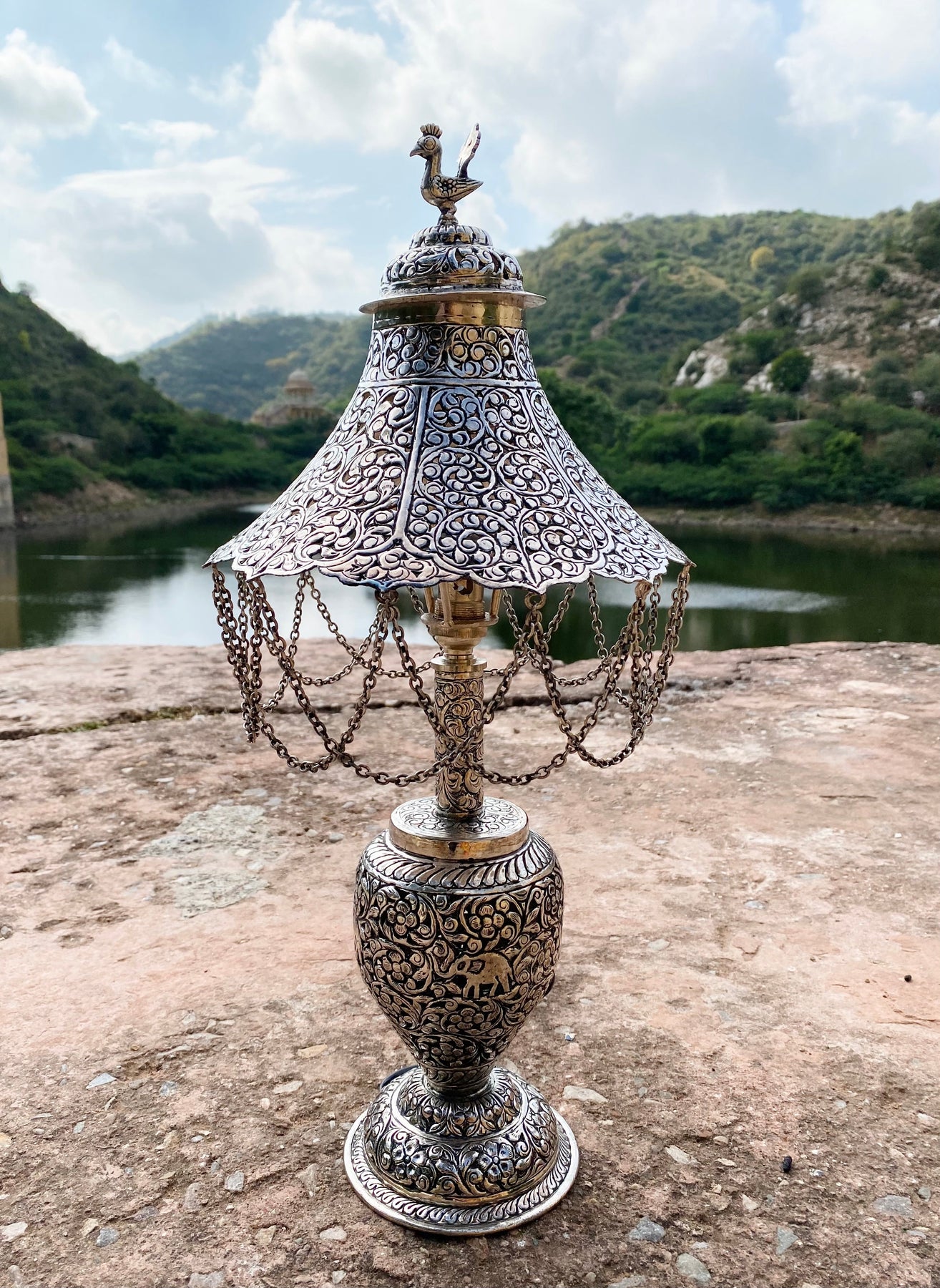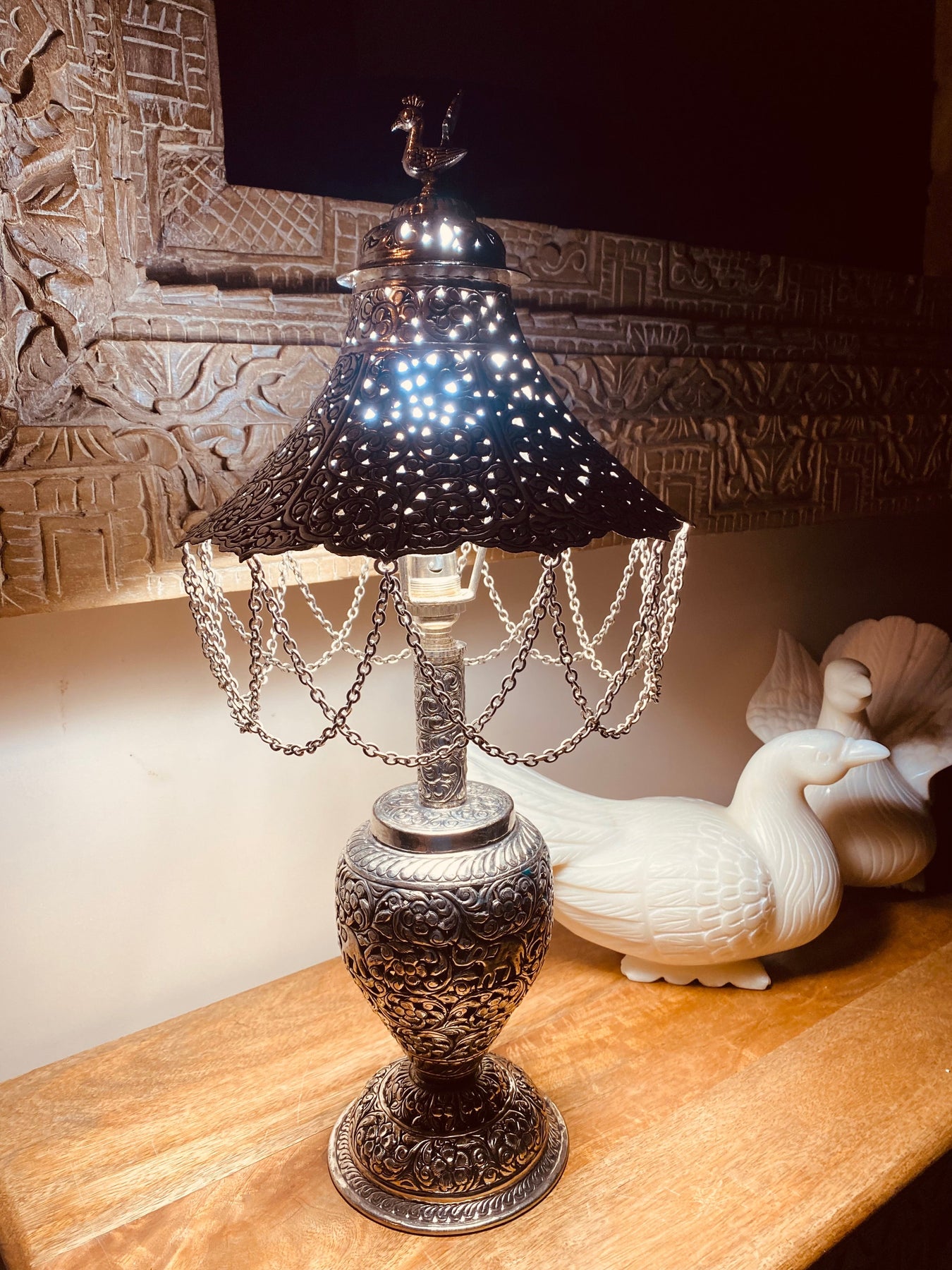 Beautifully hand carved copper with silver polish table lamp with intricate detailing on all the sides.