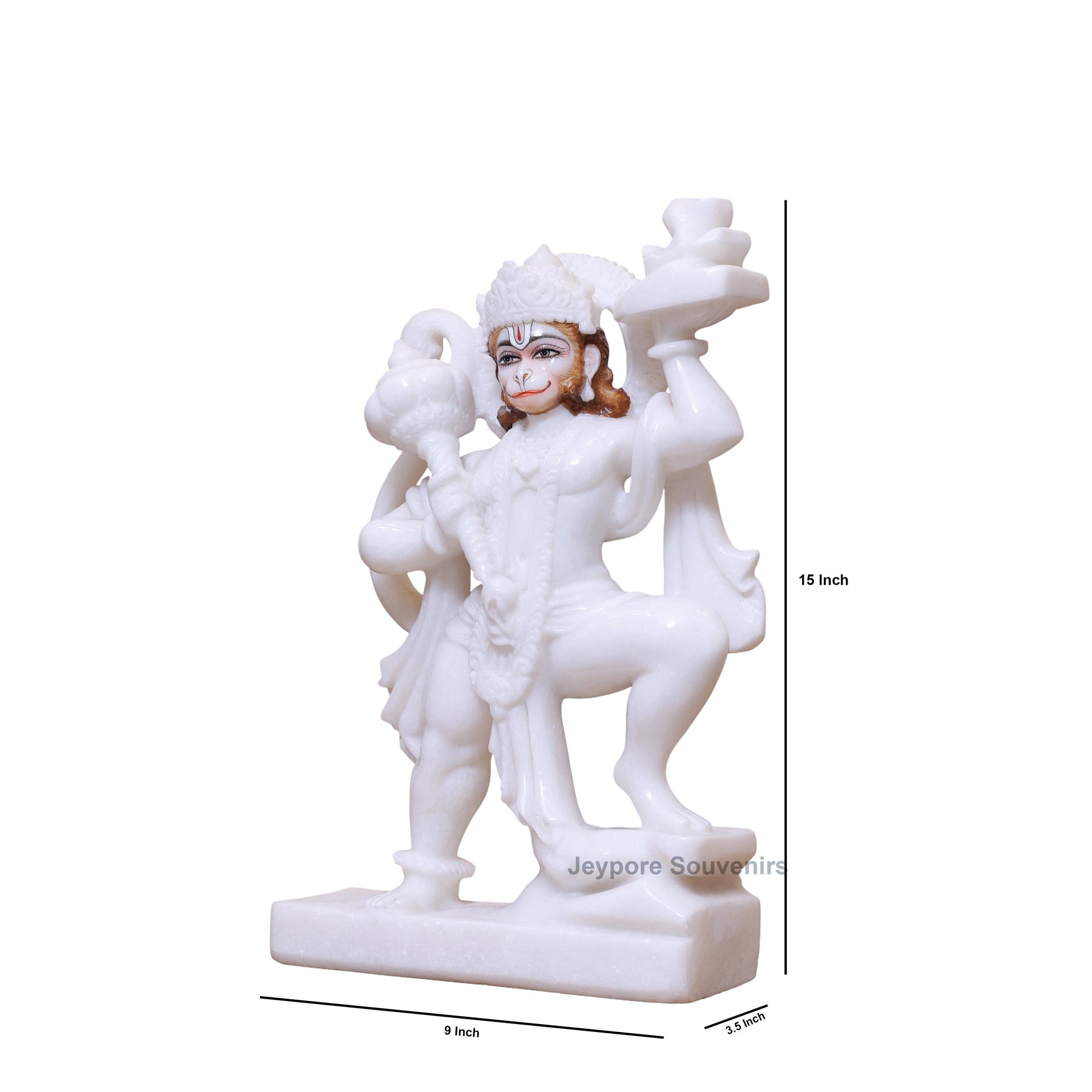 Experience the embodiment of selfless service, miraculous strength, and unwavering devotion with this majestic Lord Hanuman idol. Meticulously hand-carved from pure white marble by India's celebrated traditional artisans at Jeypore Souvenirs, this statue captures the epic moment from the Ramayana where Hanuman lifts the entire Dronagiri Mountain containing the life-saving Sanjeevani herb.