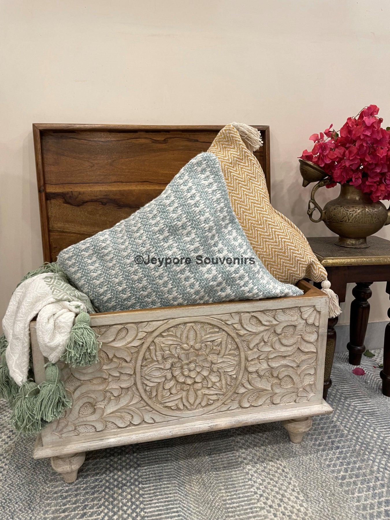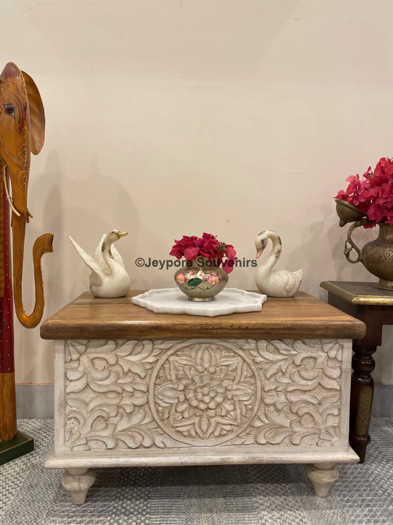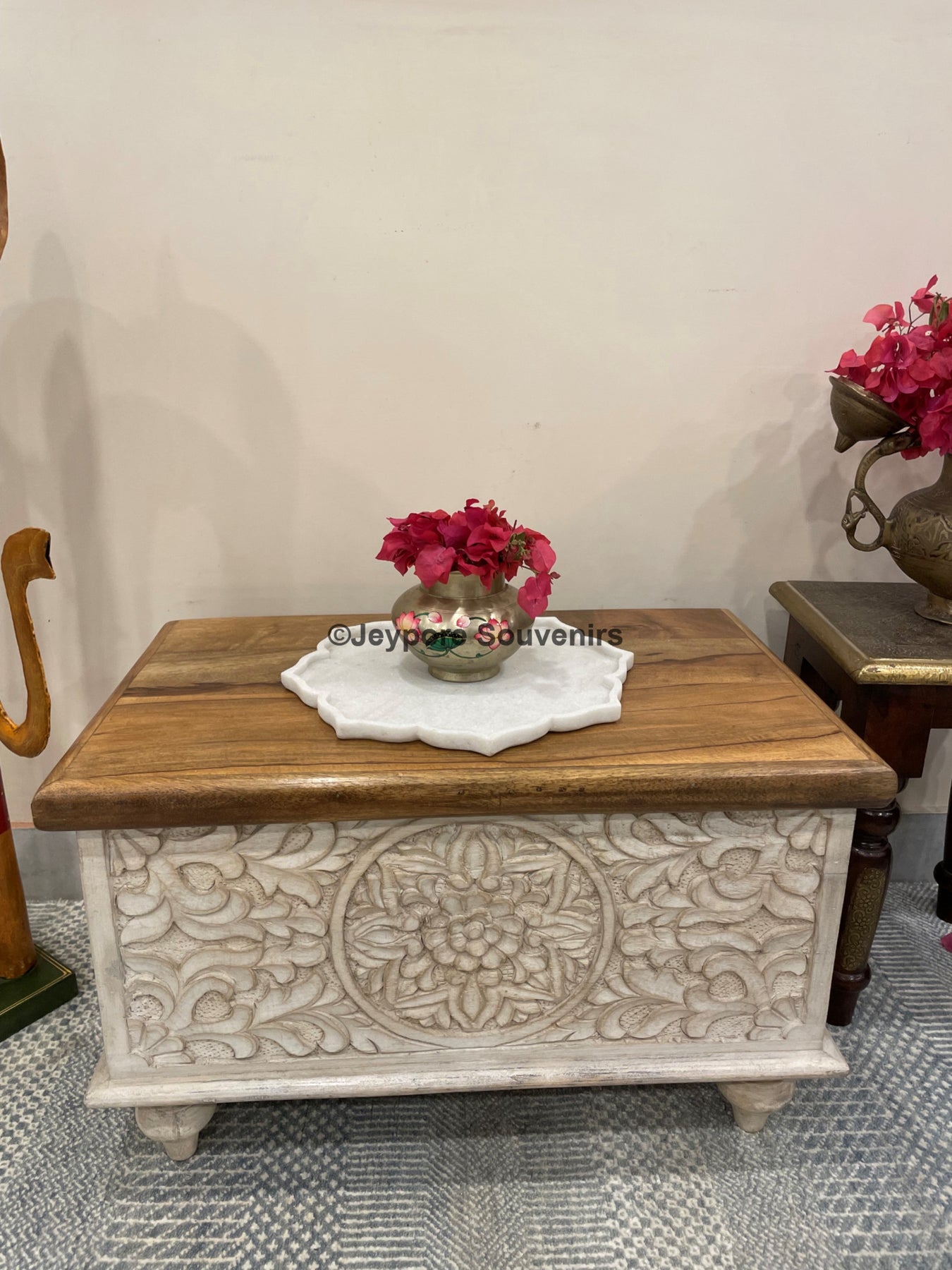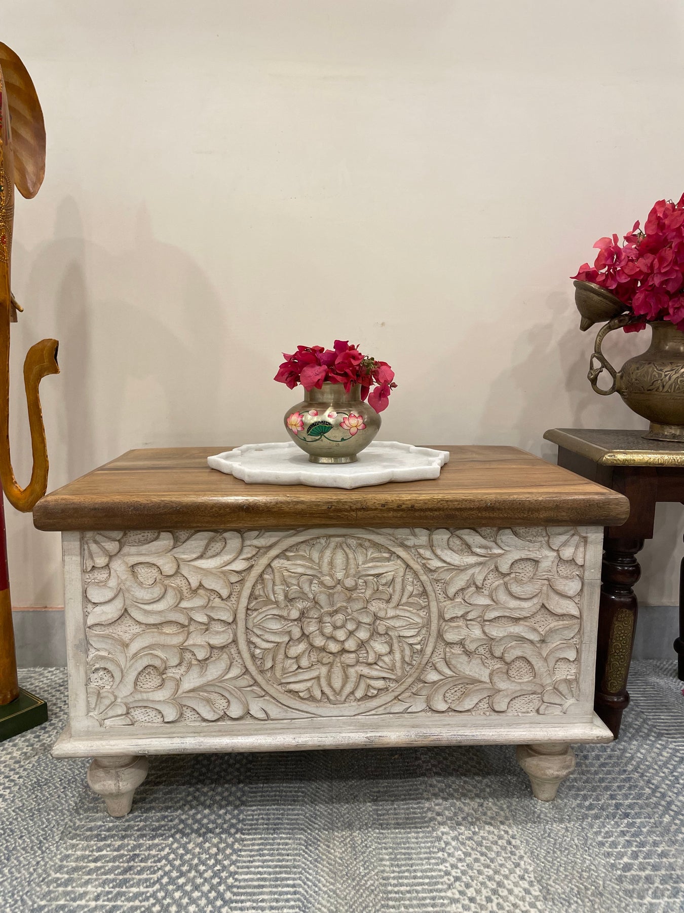 This antique style Hand Carved storage chest from India is a rare find. It has beautiful hand carved floral motifs on it which gives very royal and unique vibe to this furniture.