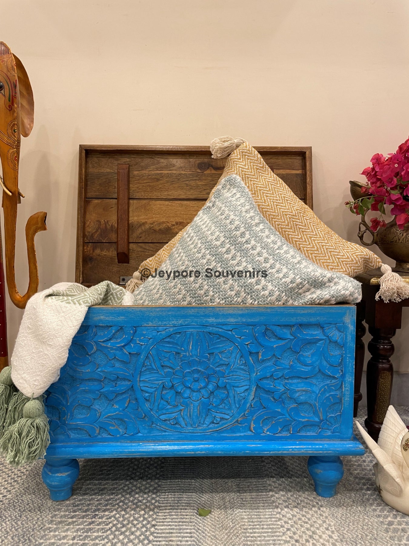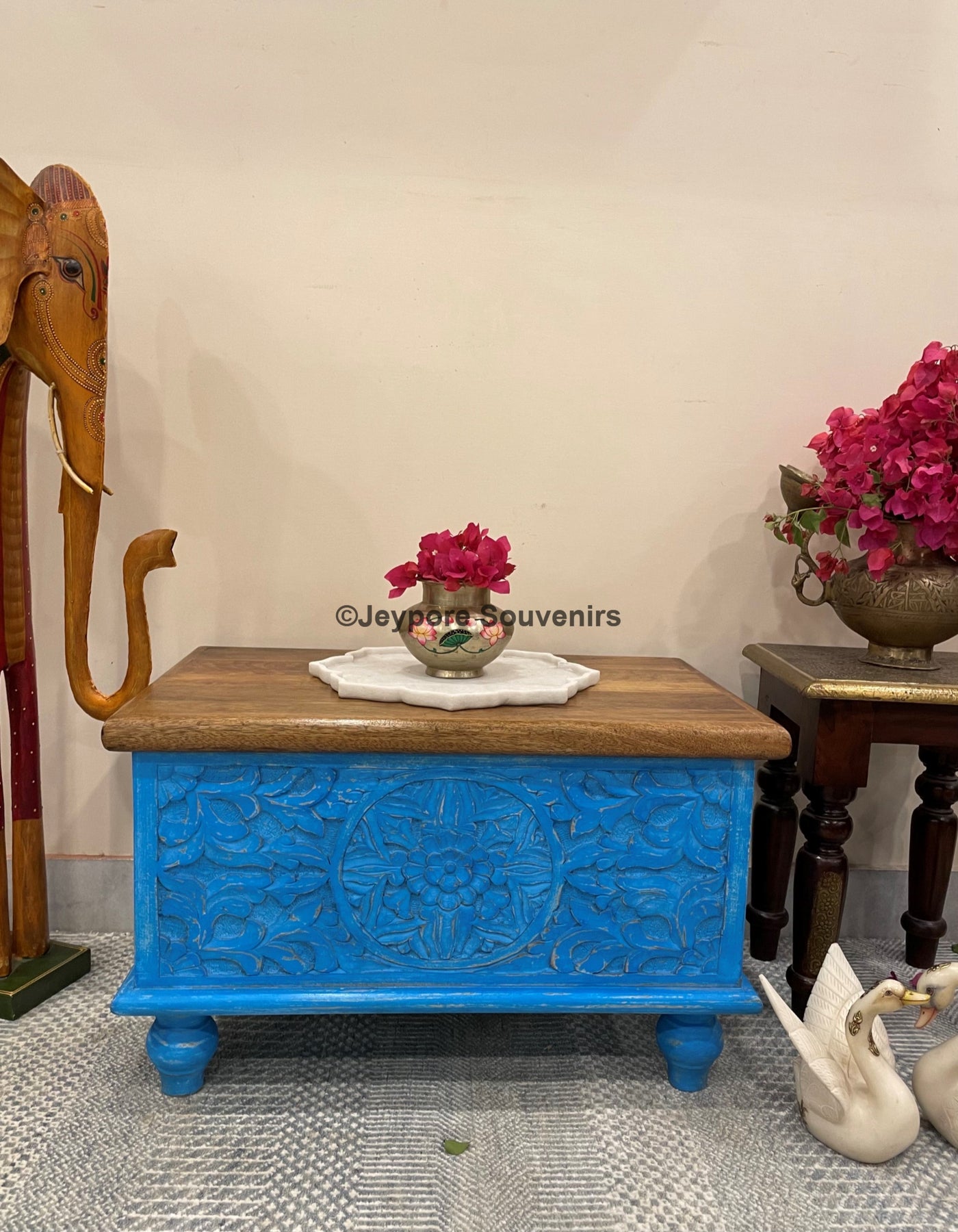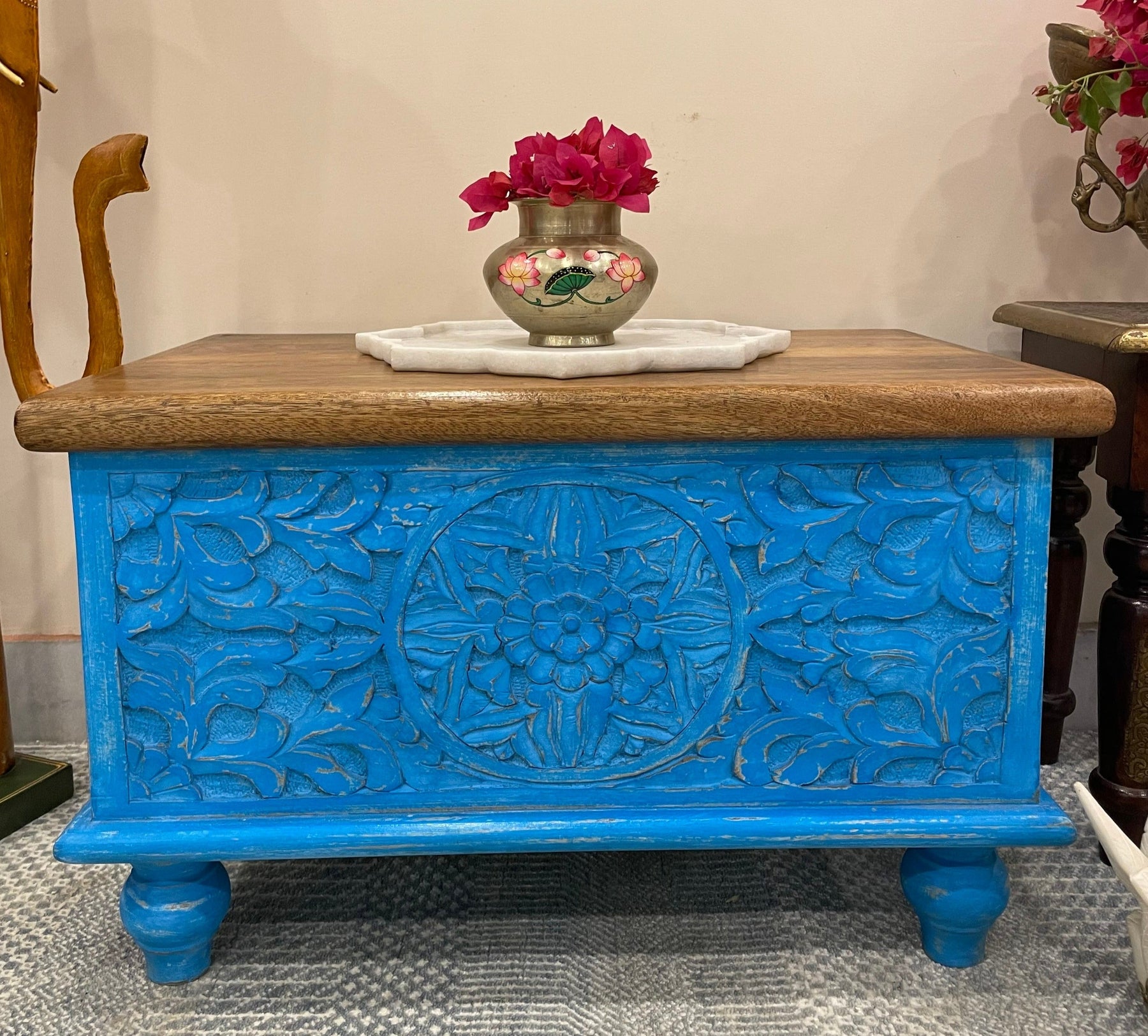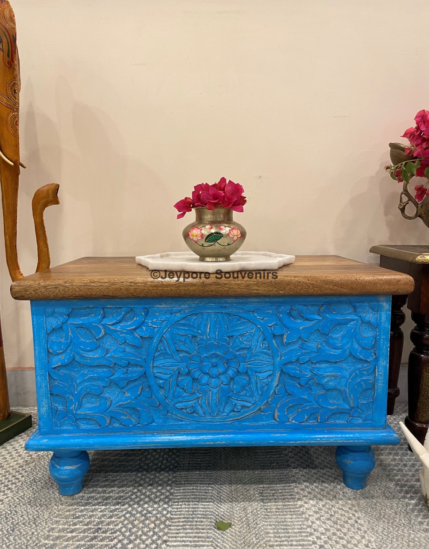 This antique style Hand Carved storage chest from India is a rare find. It has beautiful hand carved floral motifs on it which gives very royal and unique vibe to this furniture.