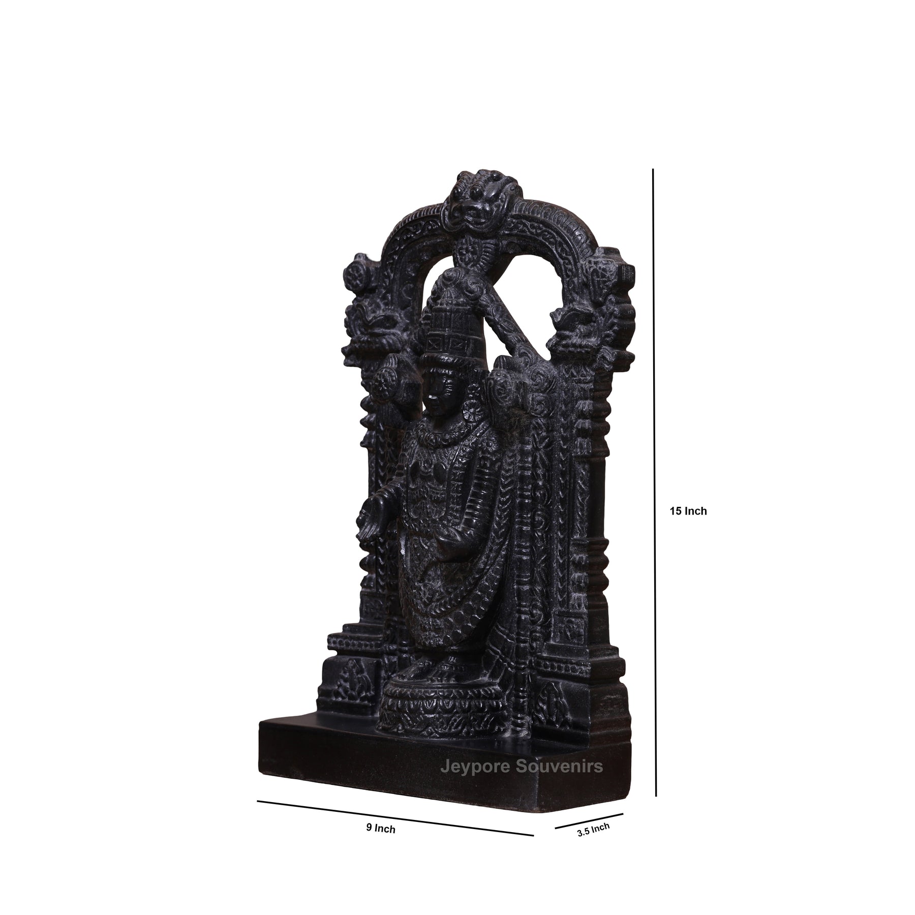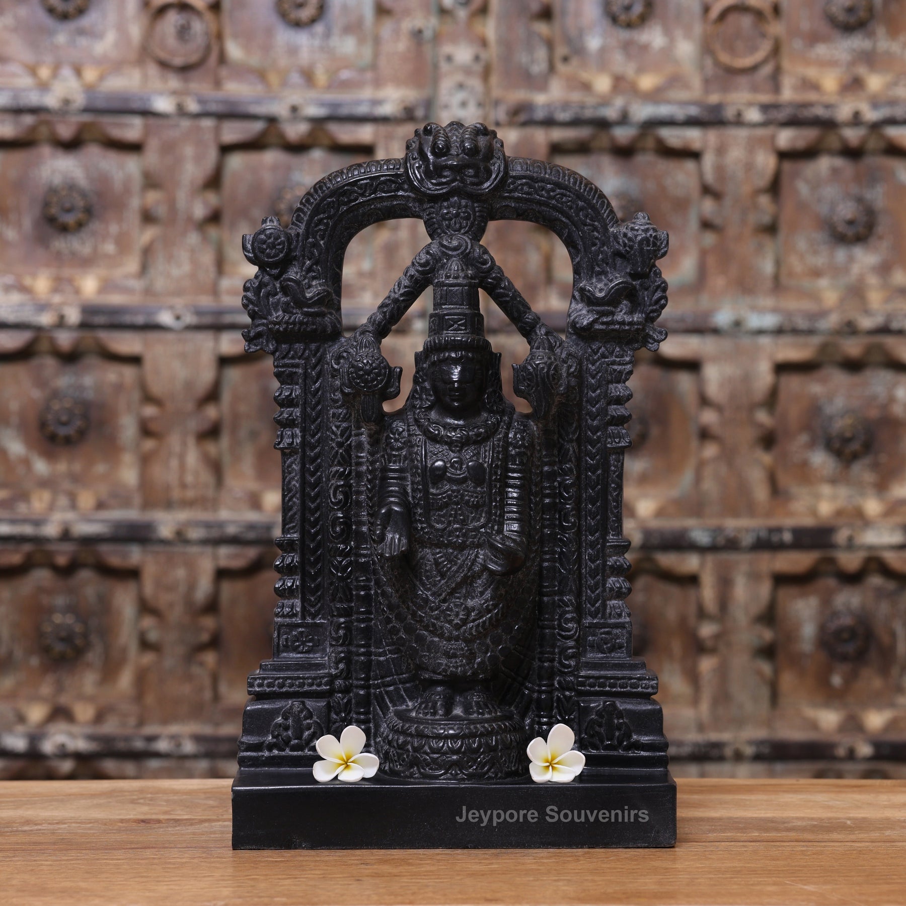 Experience the immense grace and spiritual fulfillment with this majestic Tirupati Balaji idol, the revered form of Lord Venkateswara, an incarnation of Vishnu. Meticulously carved from a rich, dark stone black marble, this 15-inches statue captures the iconic standing posture of the deity, flanked by an intricately designed temple arch (Prabhavali).