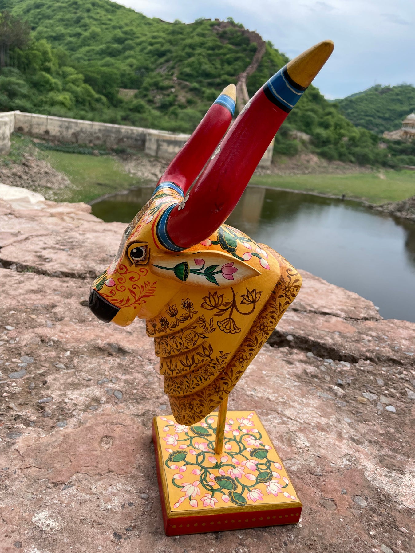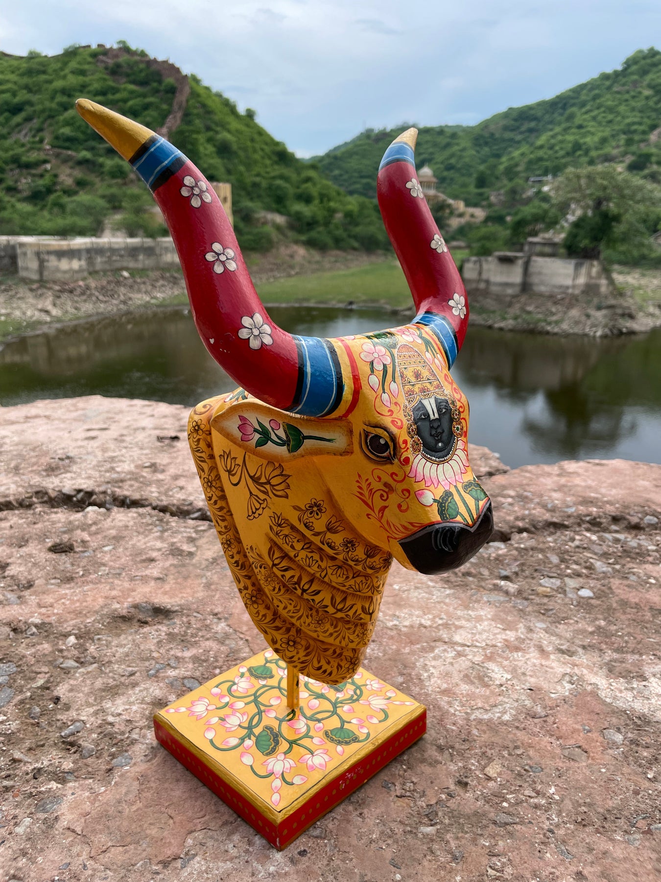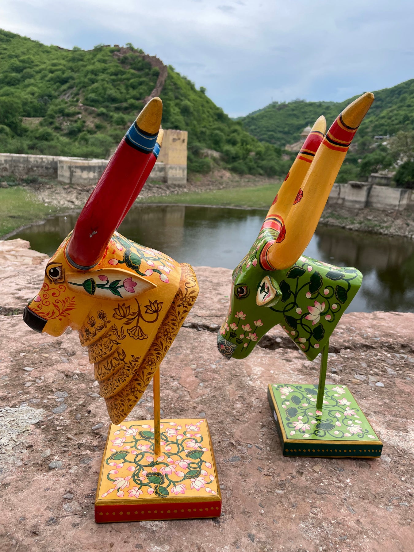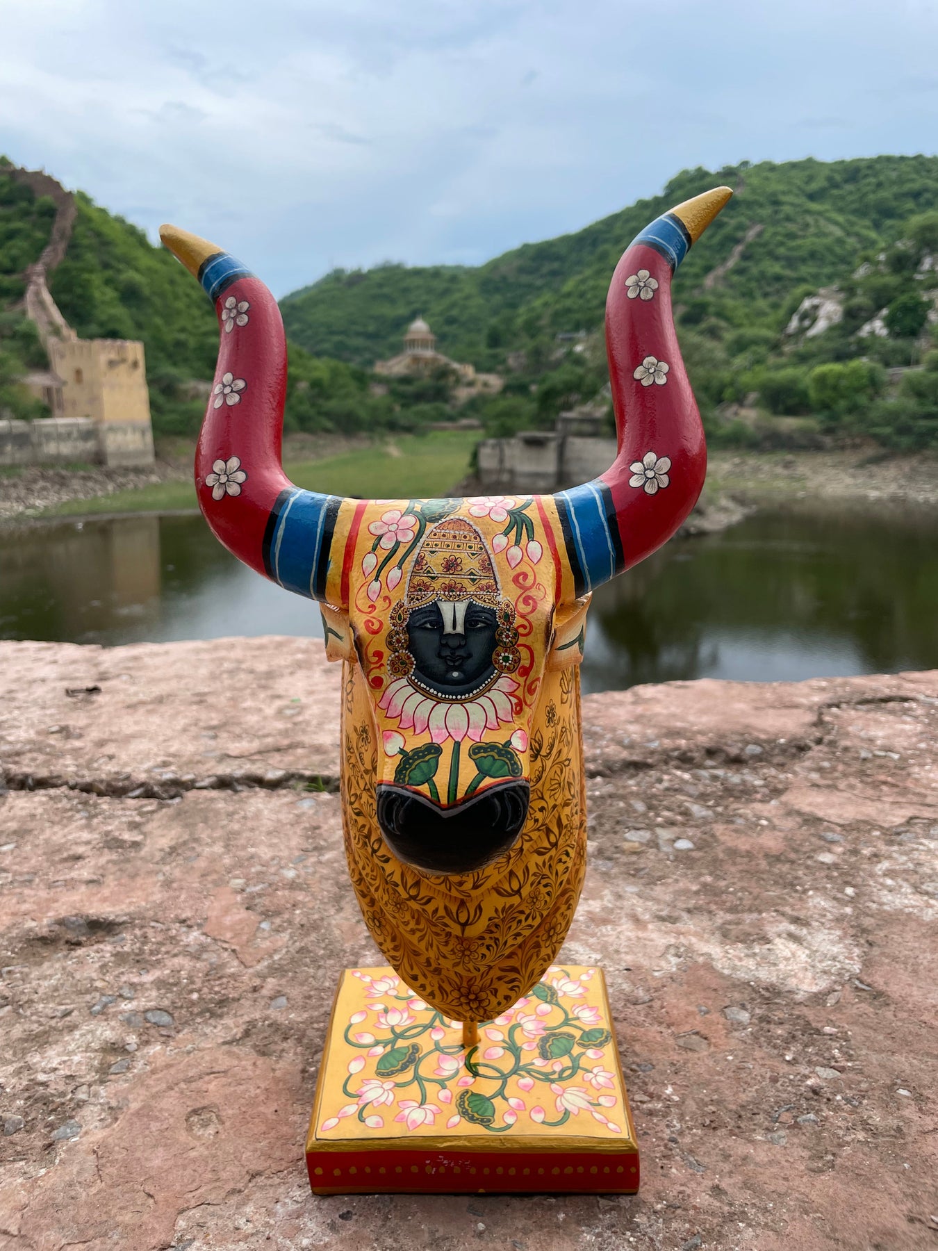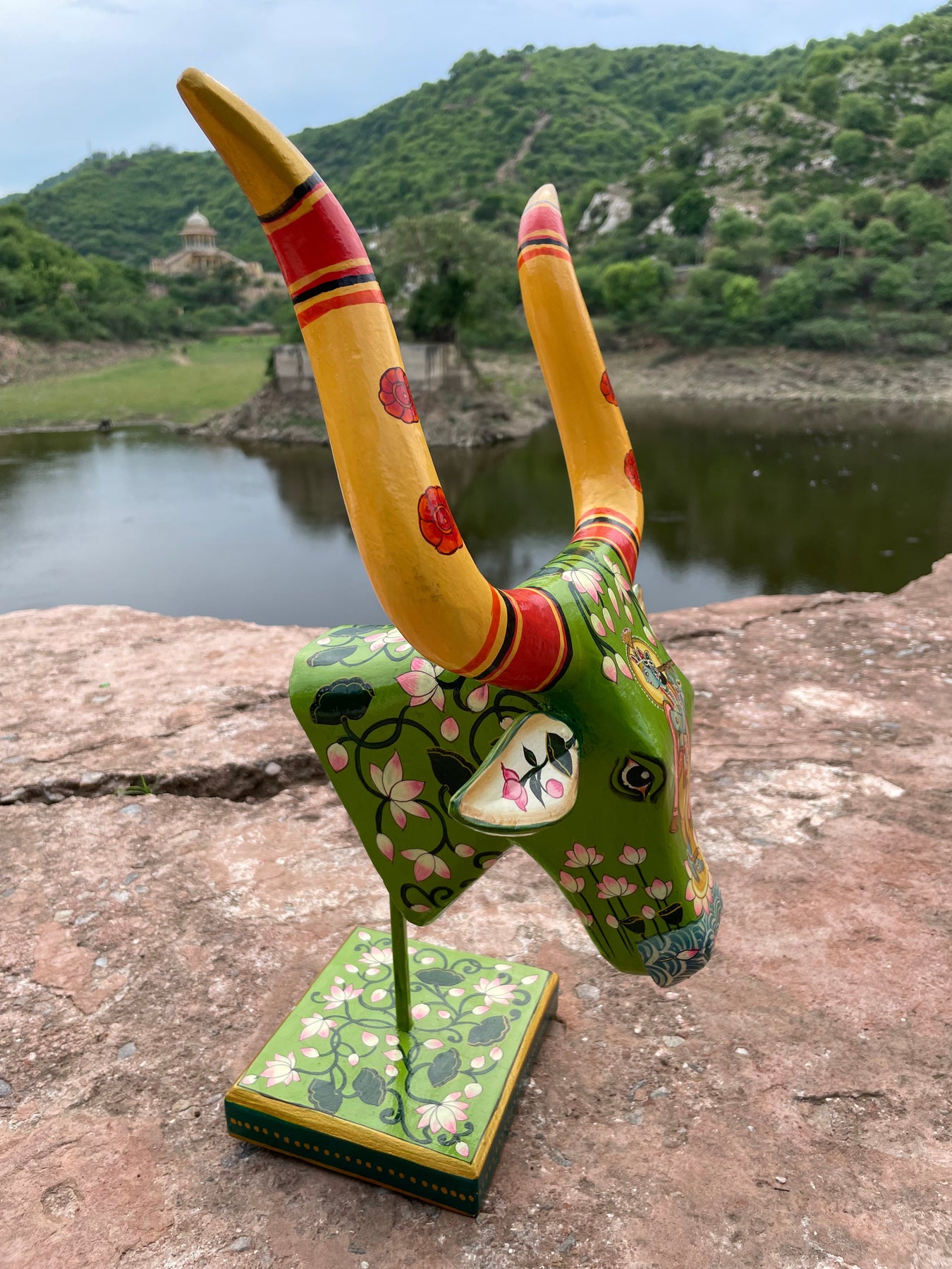 These unique, one of its kind hand painted wooden nandi heads on stand with colorful painting on them would be a statement piece to your décor.