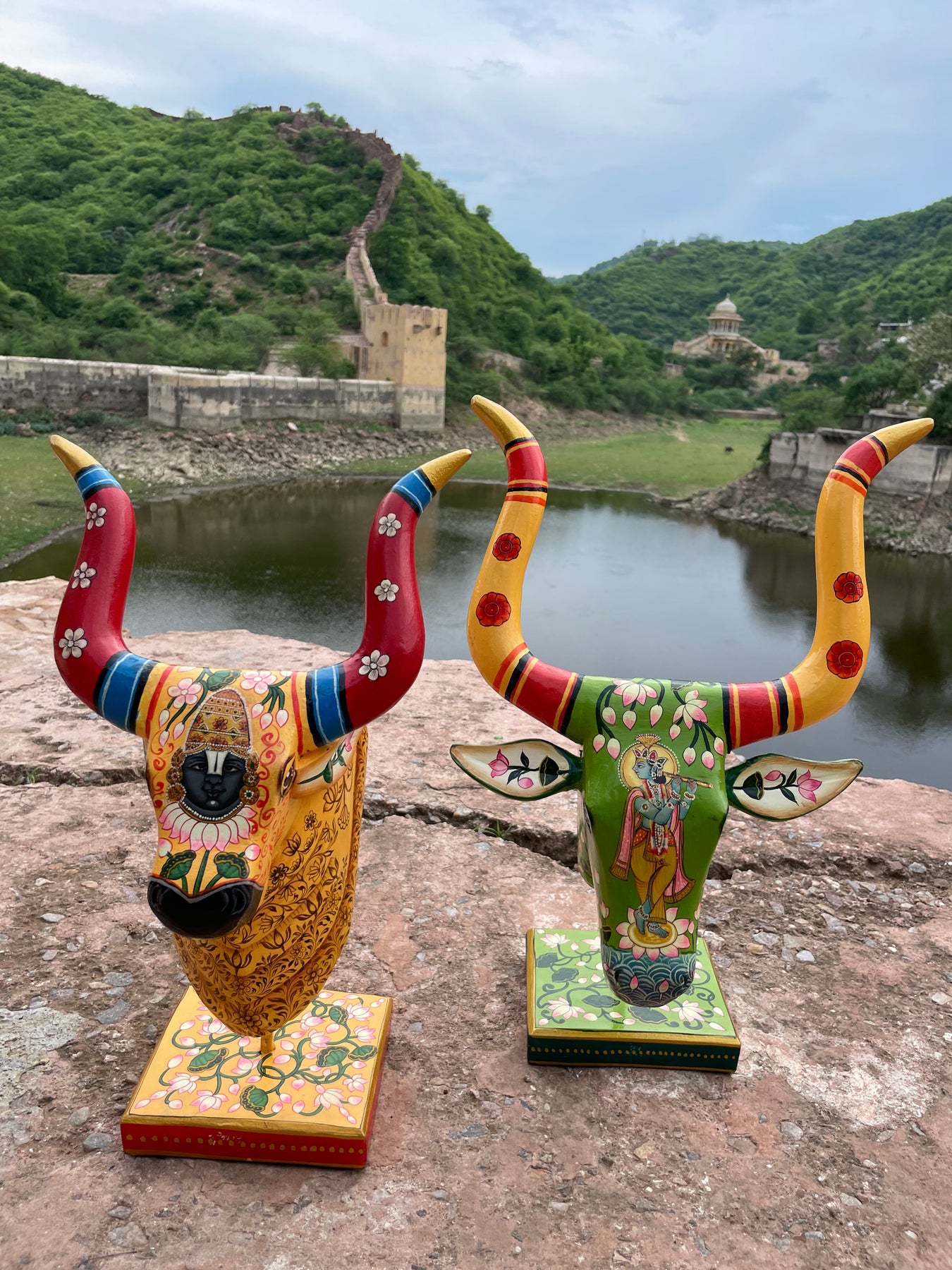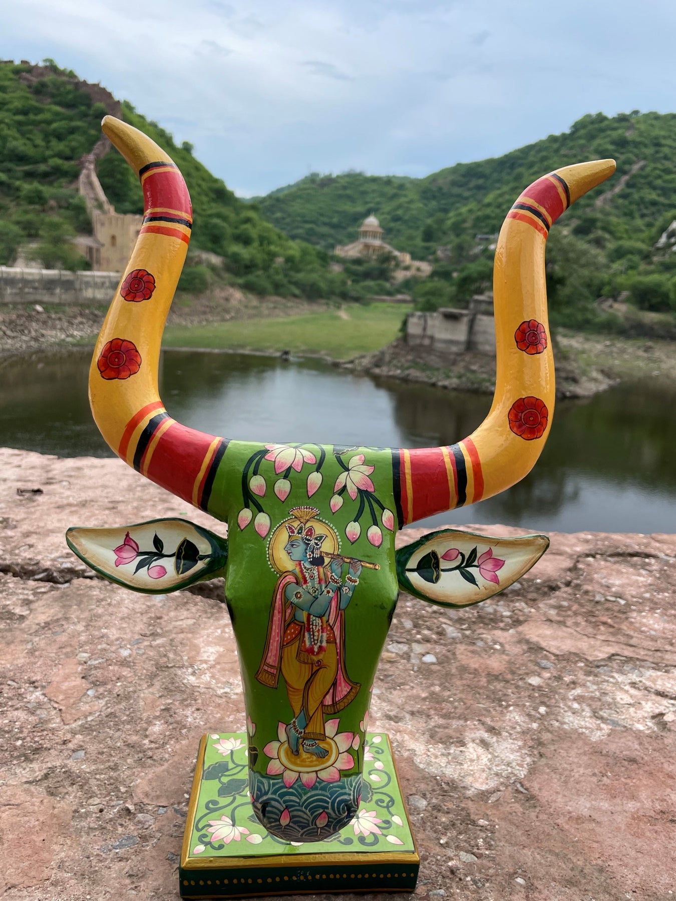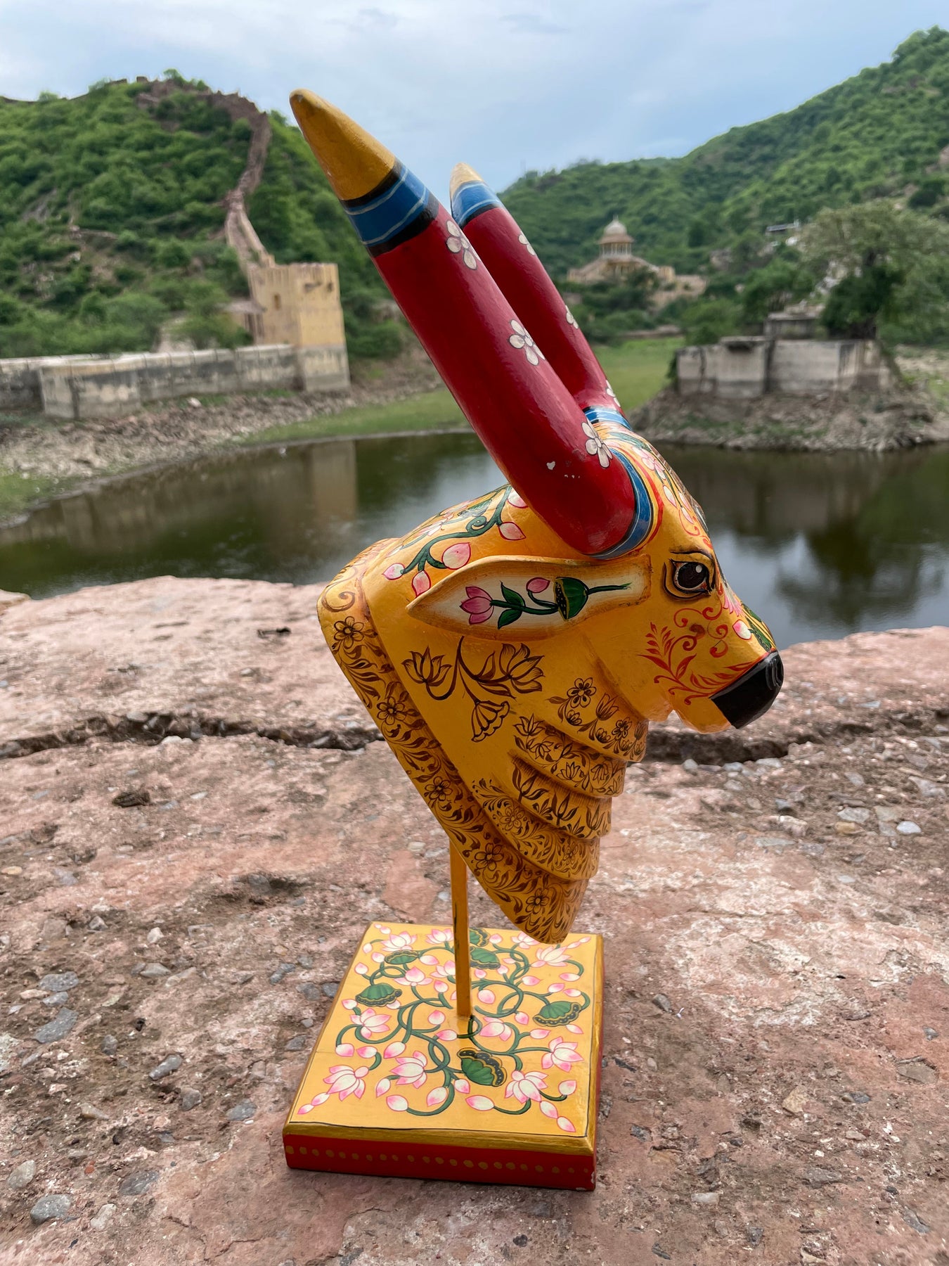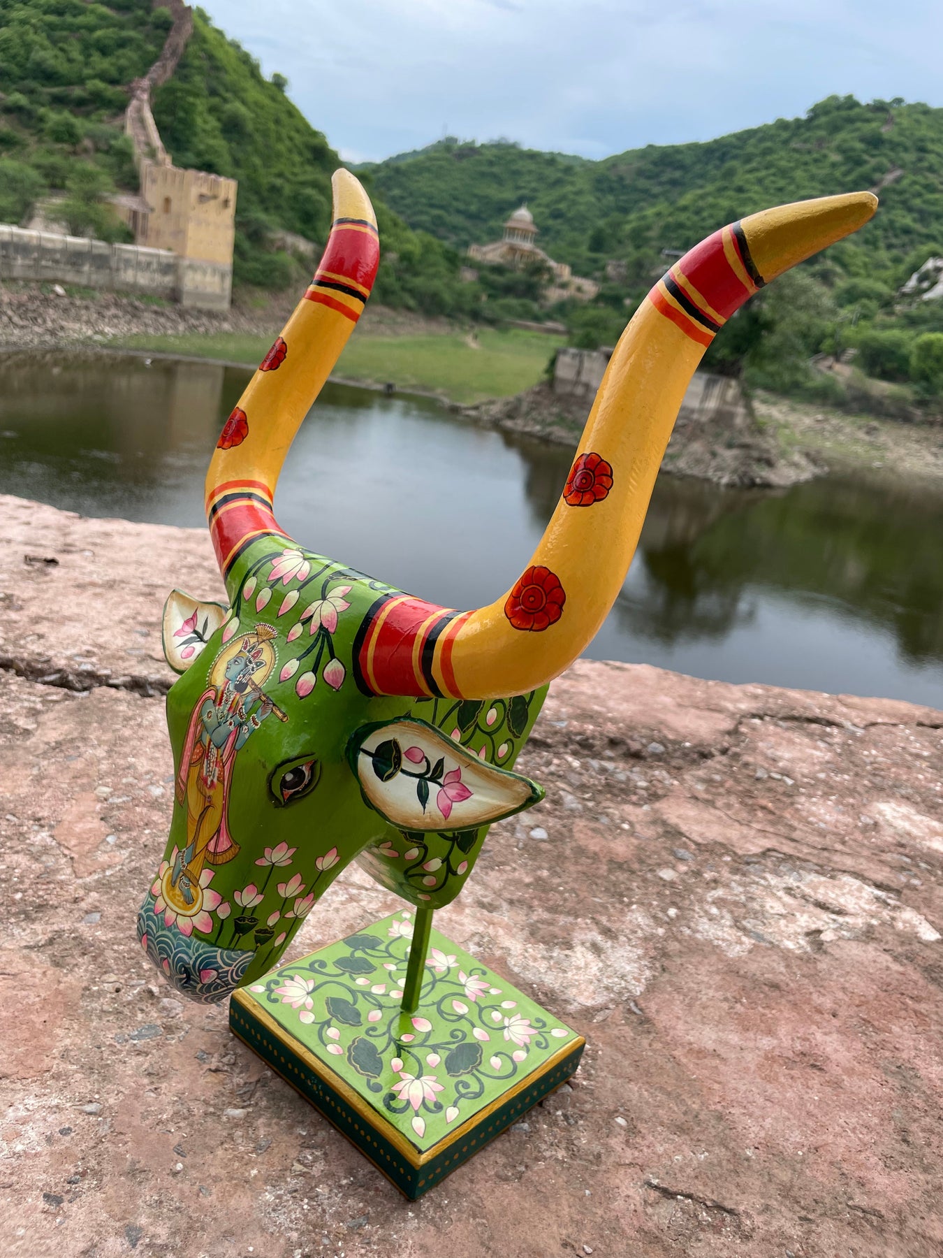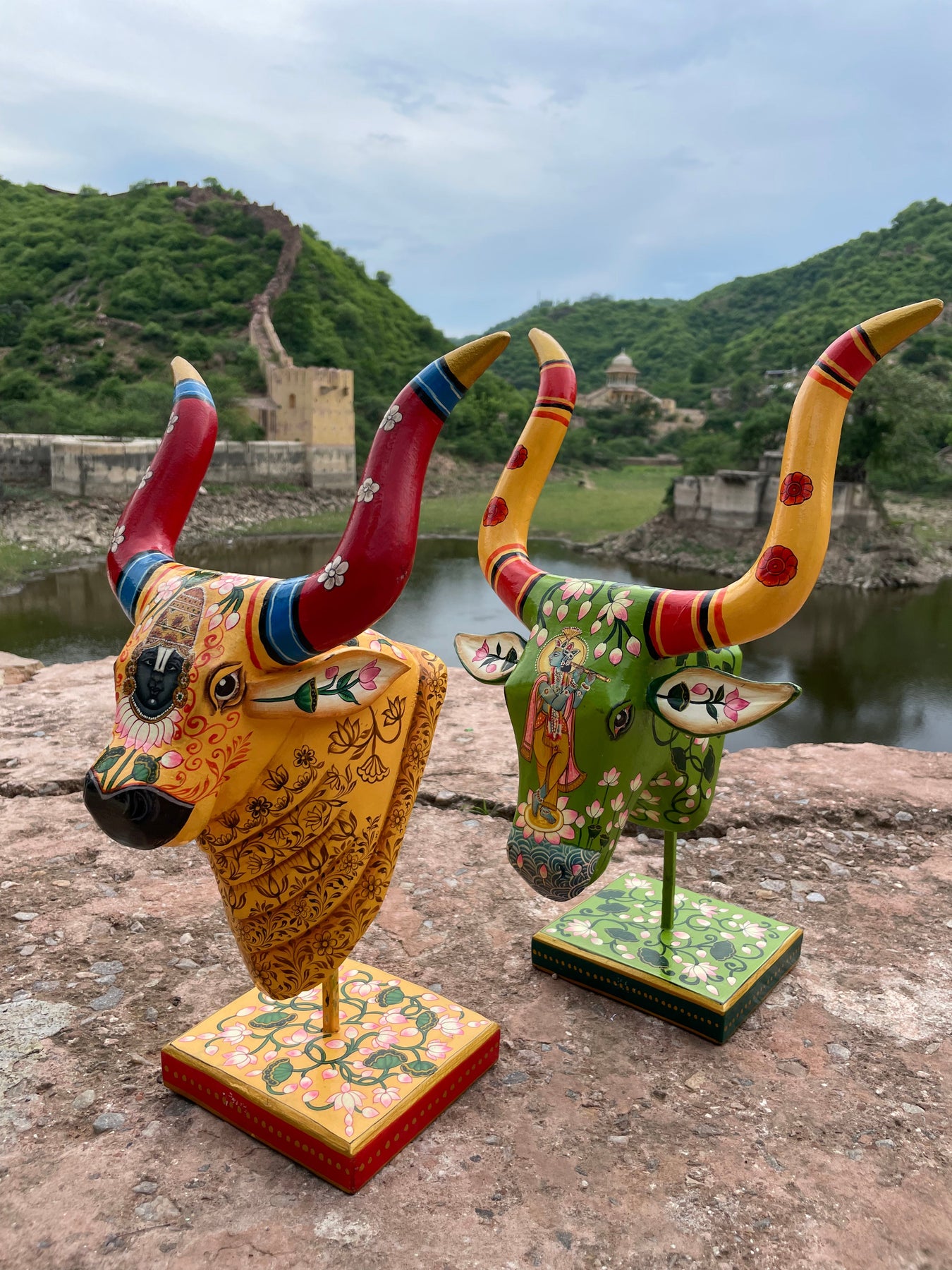These unique, one of its kind hand painted wooden nandi heads on stand with colorful painting on them would be a statement piece to your décor.