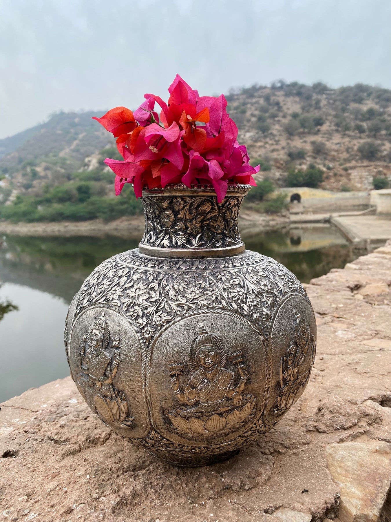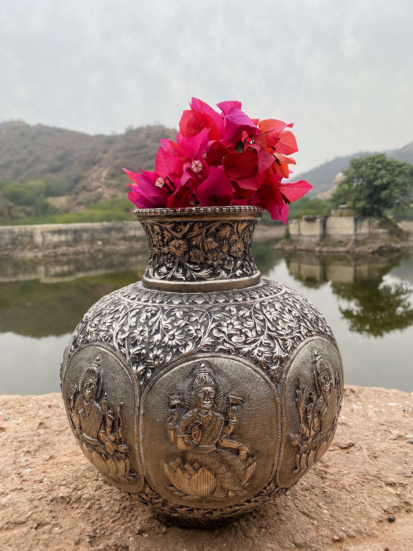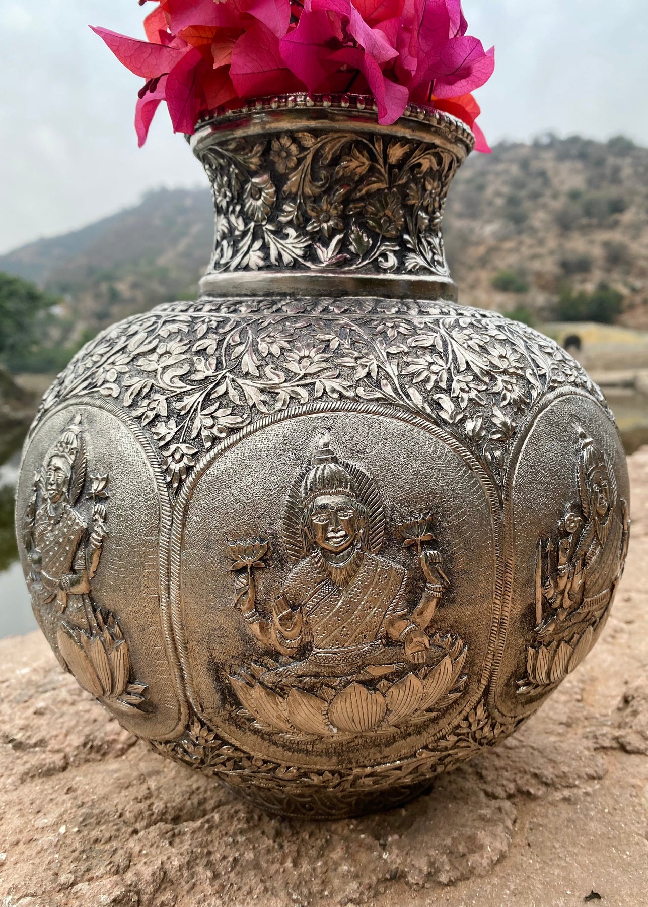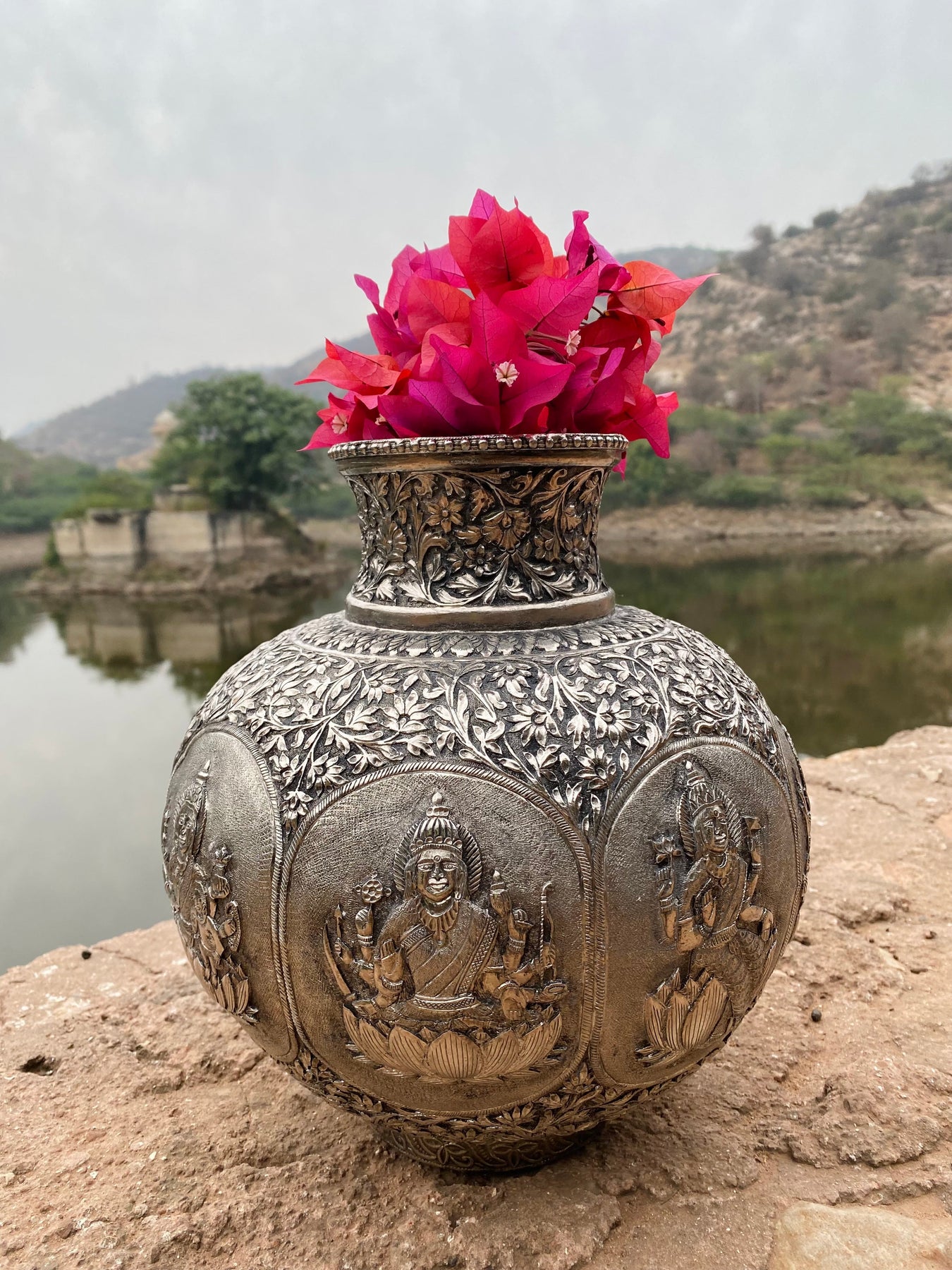 Beautifully hand carved vase with intricate detailing by depicting Goddess Lakshmi on all the sides.