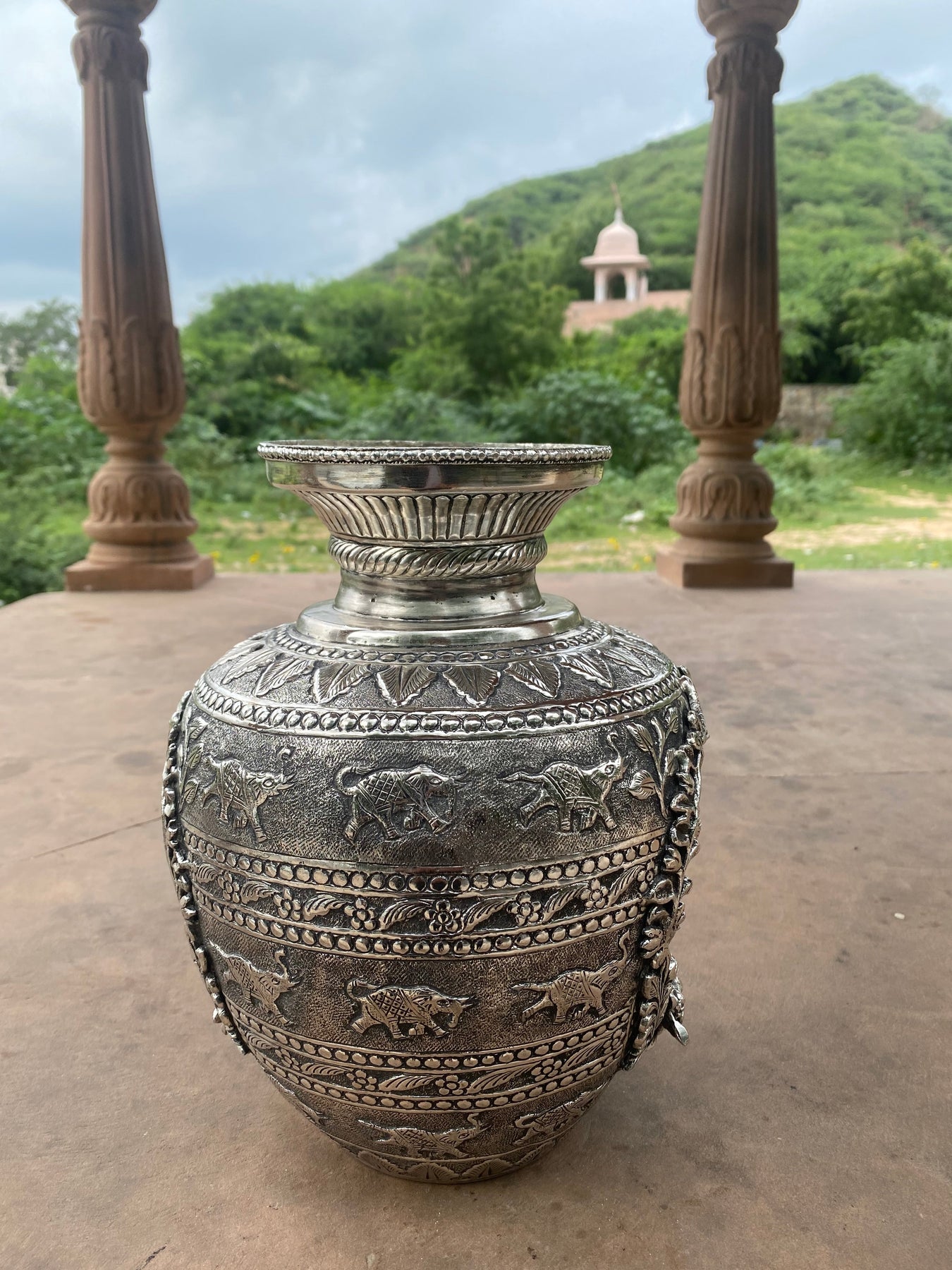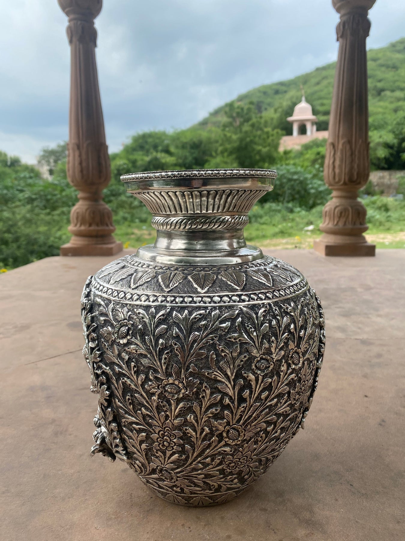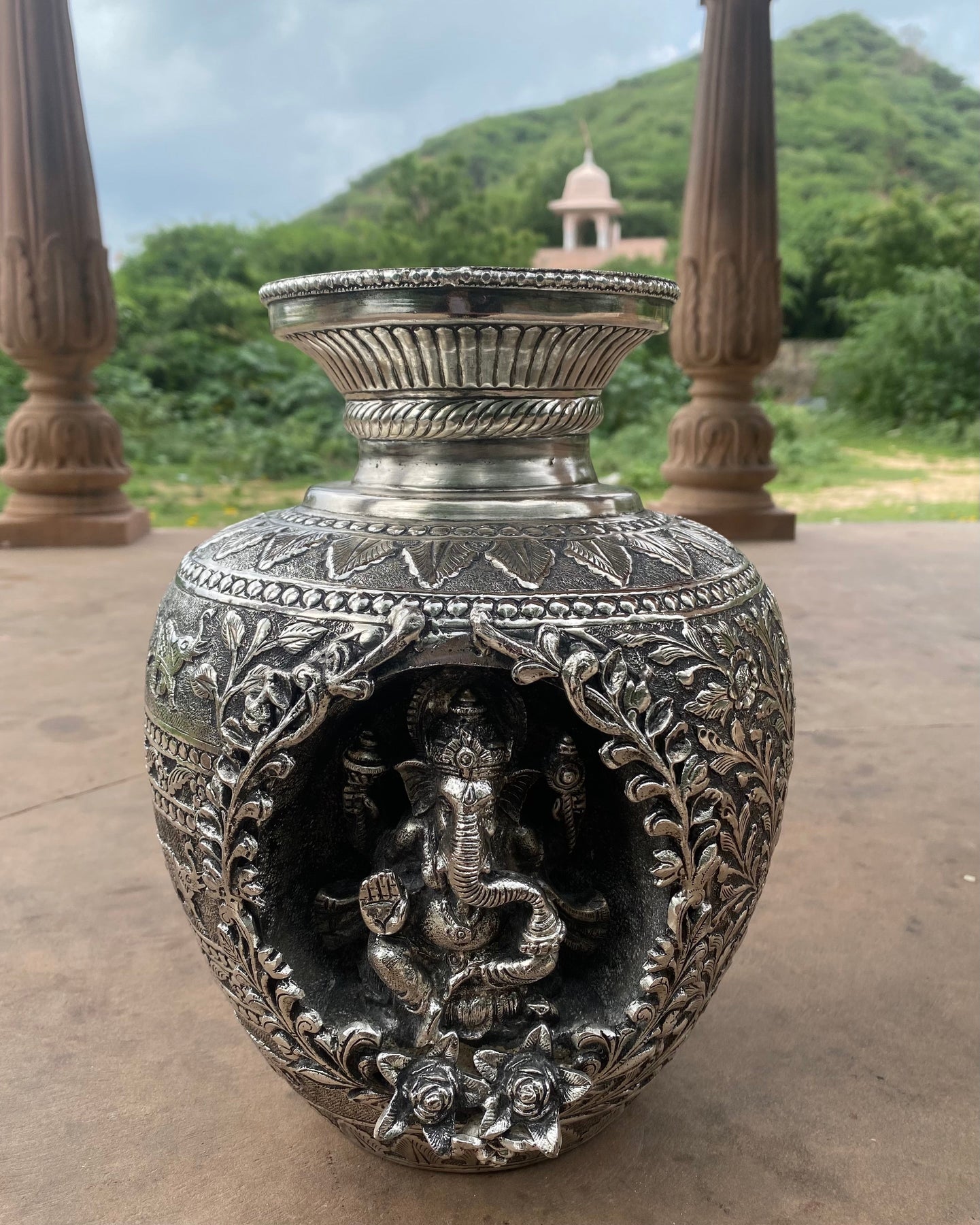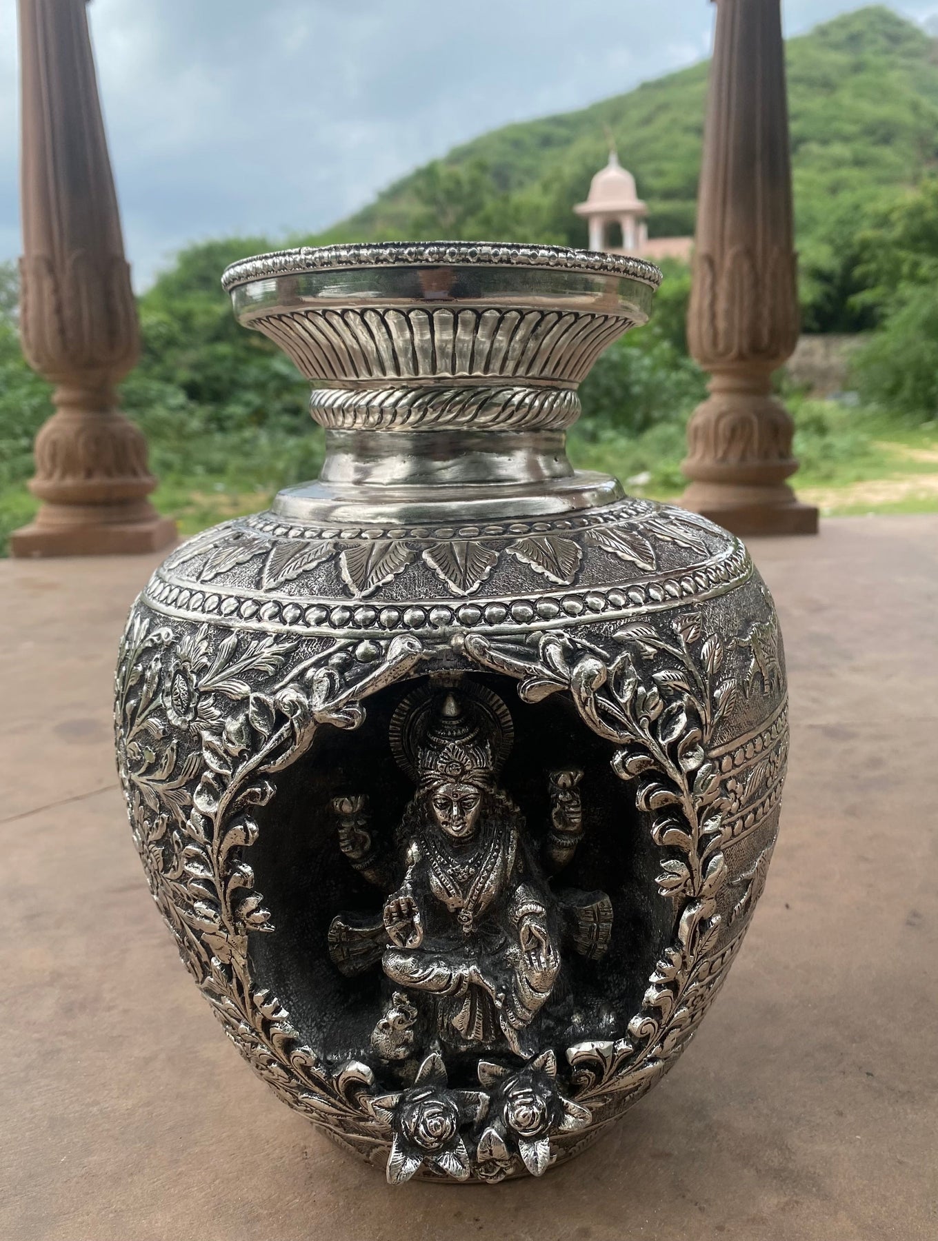 Silver Hand Carved Vase depicting Lord Ganesha and Goddess Laxmi