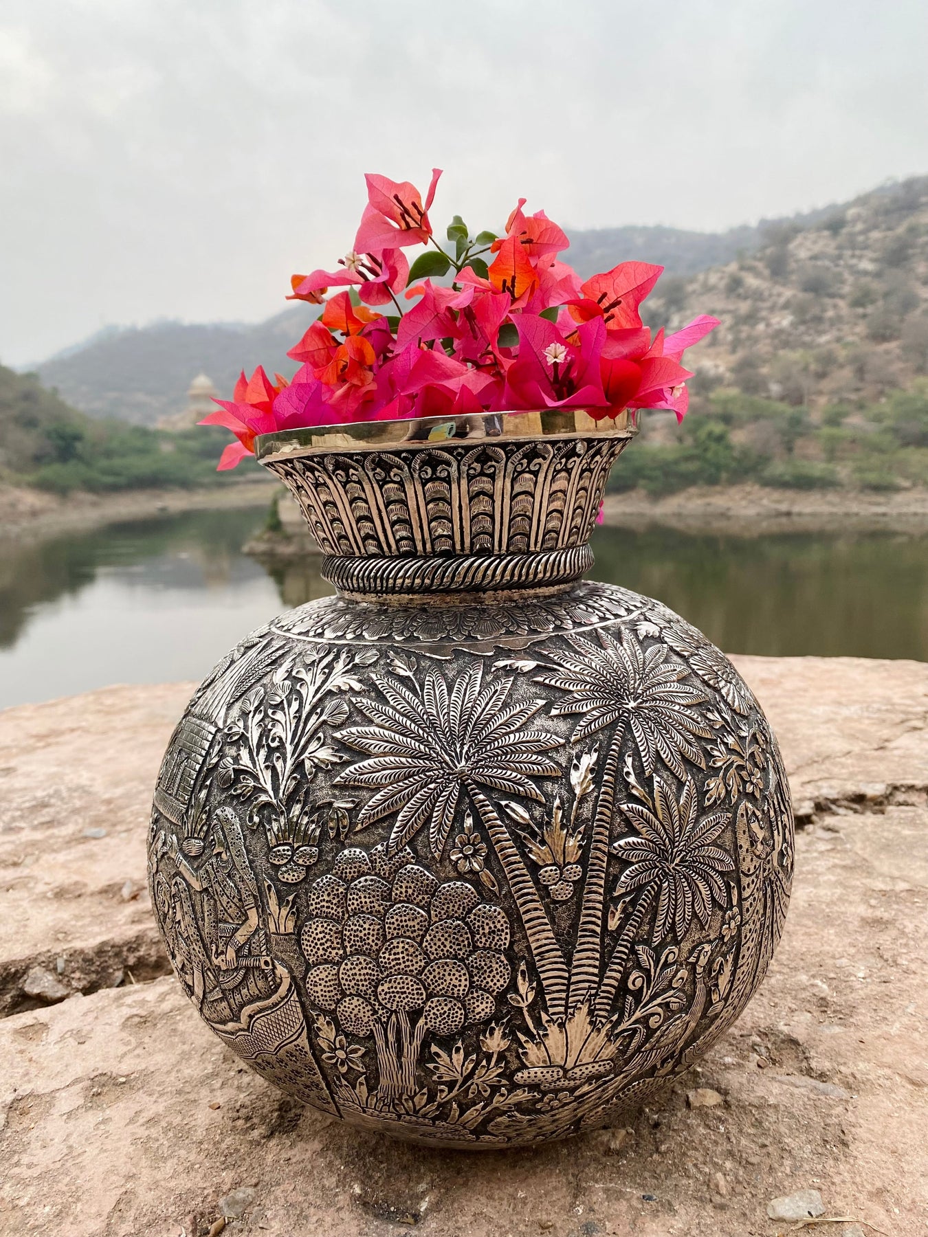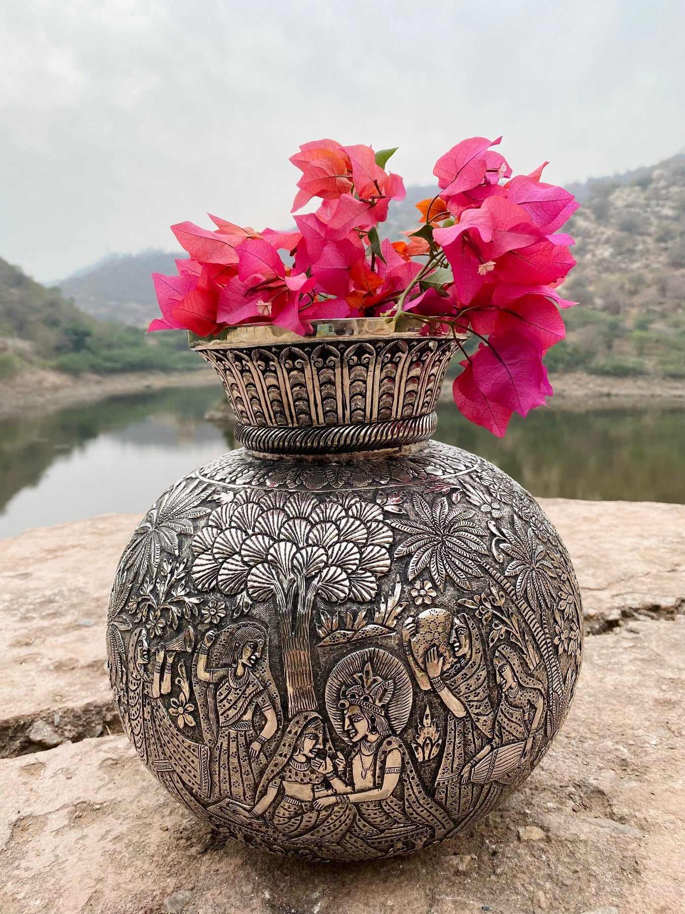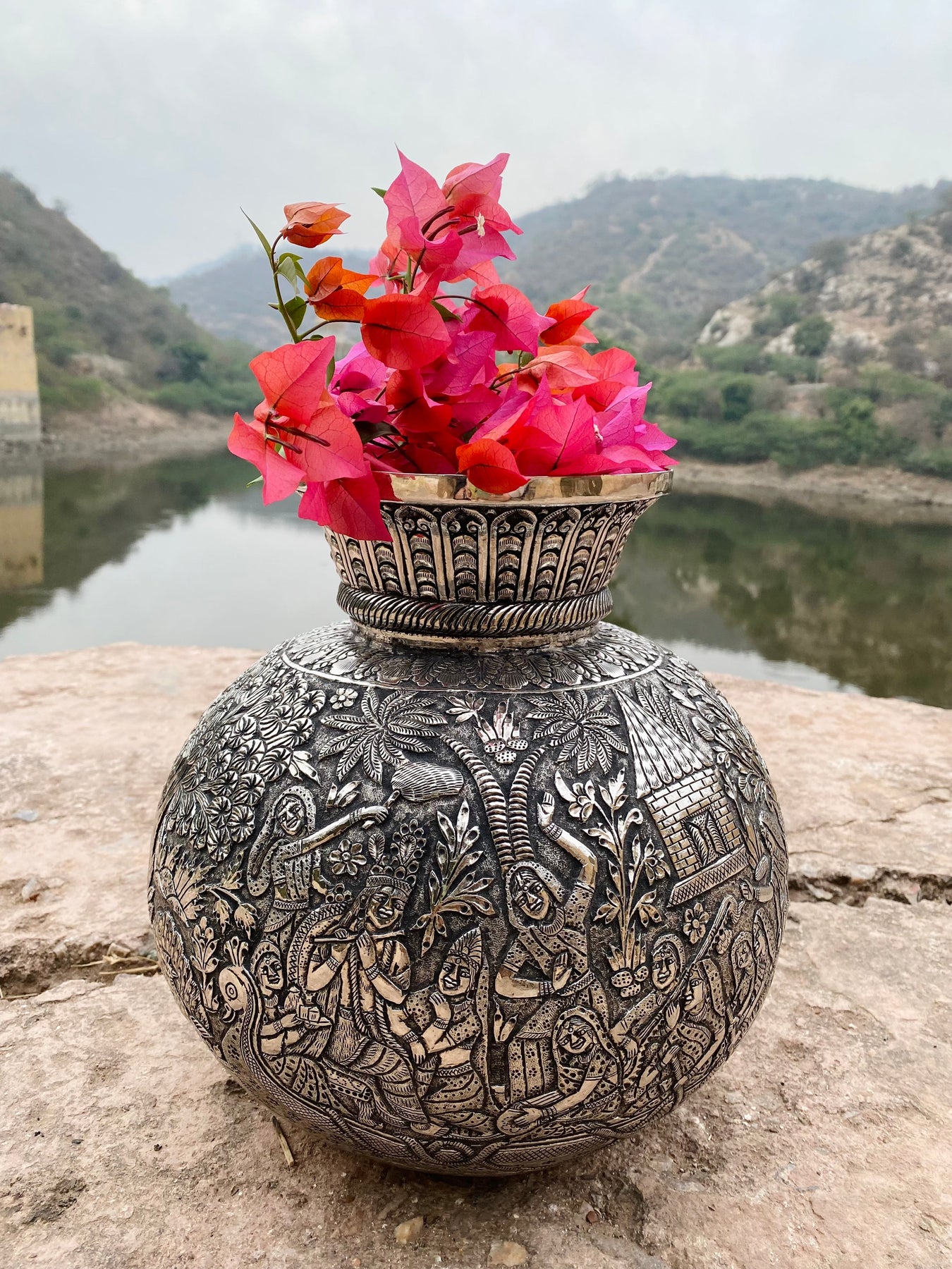 Beautifully hand carved vase with intricate detailing by depicting Goddess Lakshmi on all the sides.