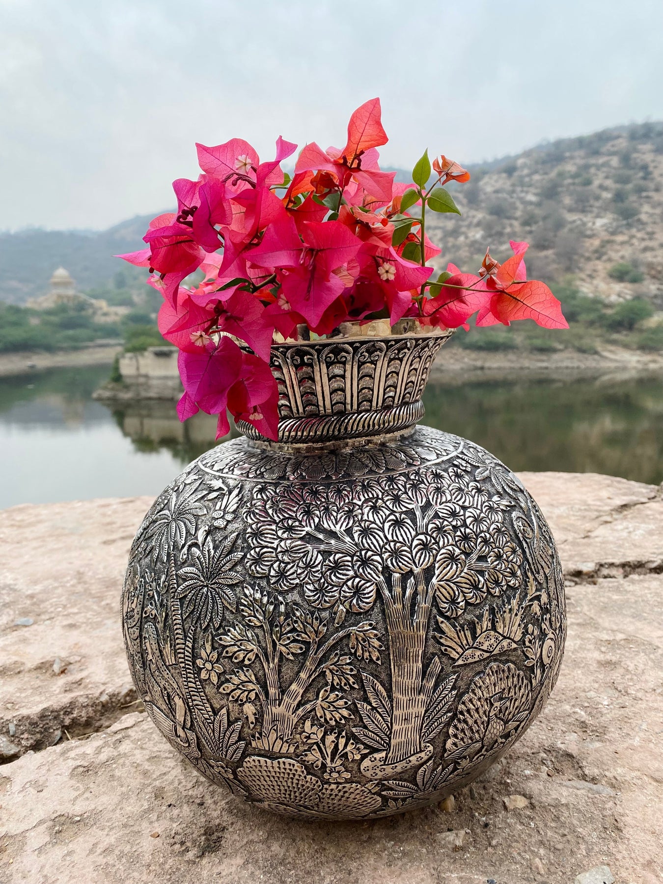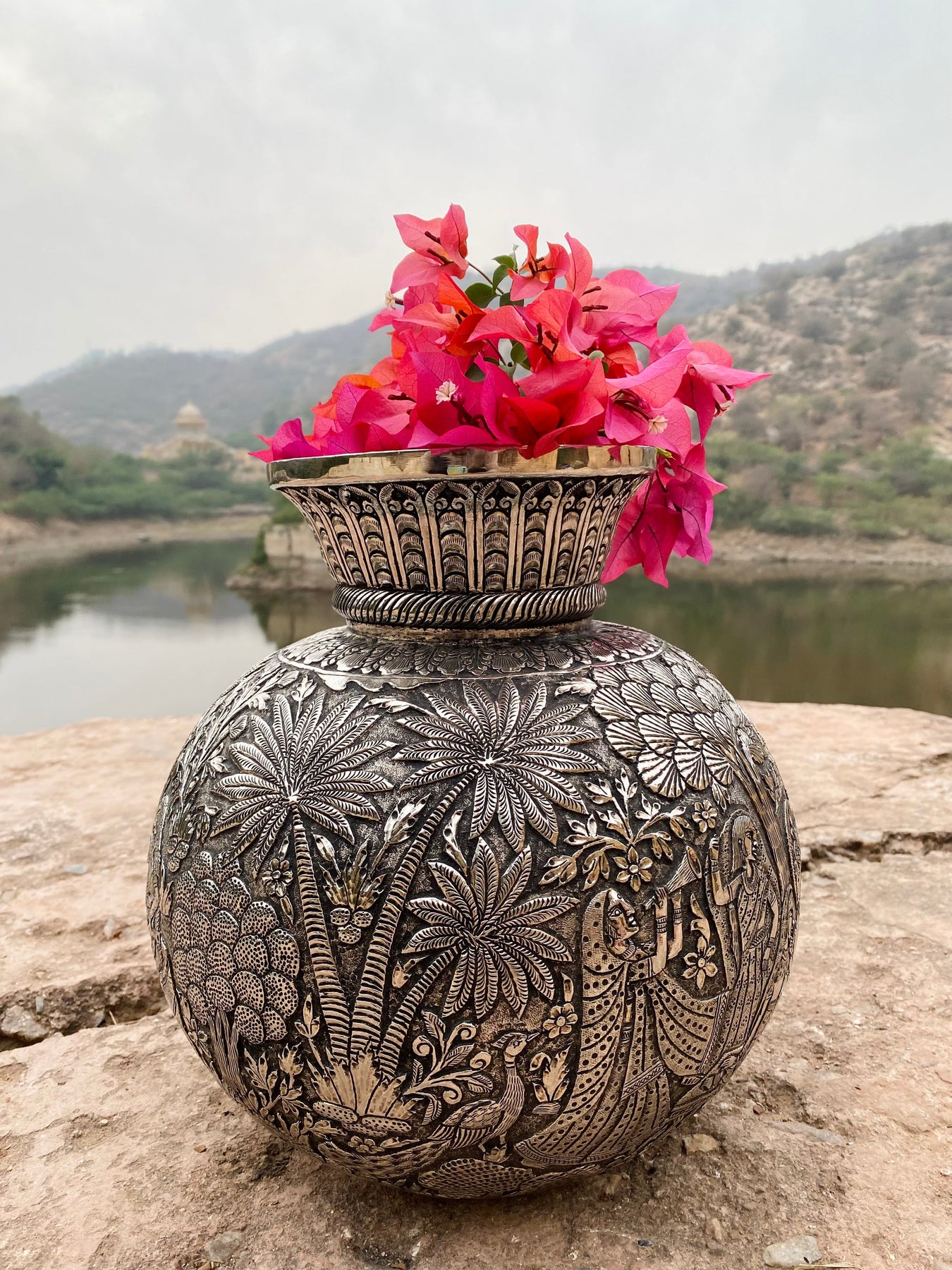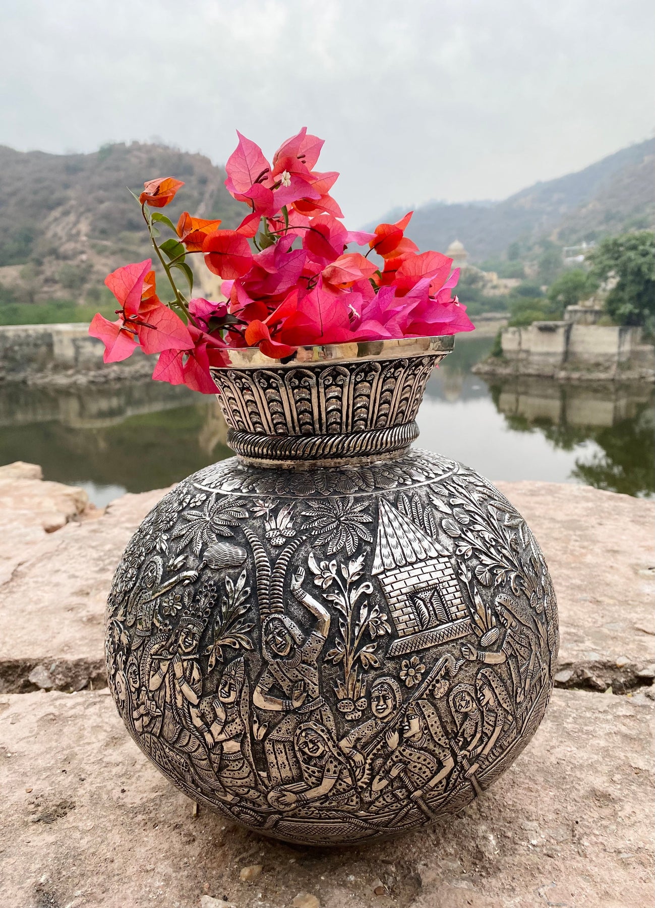 Beautifully hand carved vase with intricate detailing by depicting Goddess Lakshmi on all the sides.