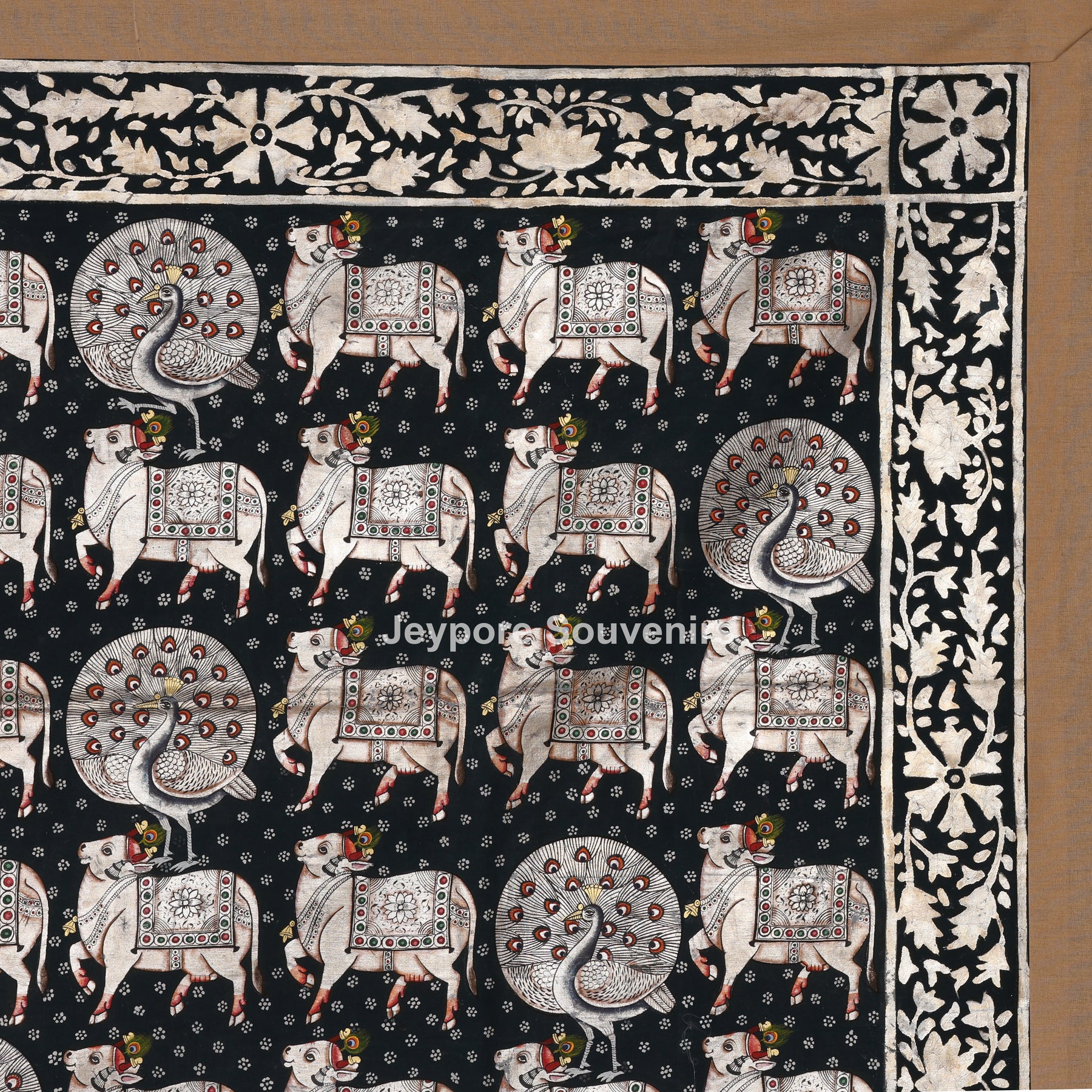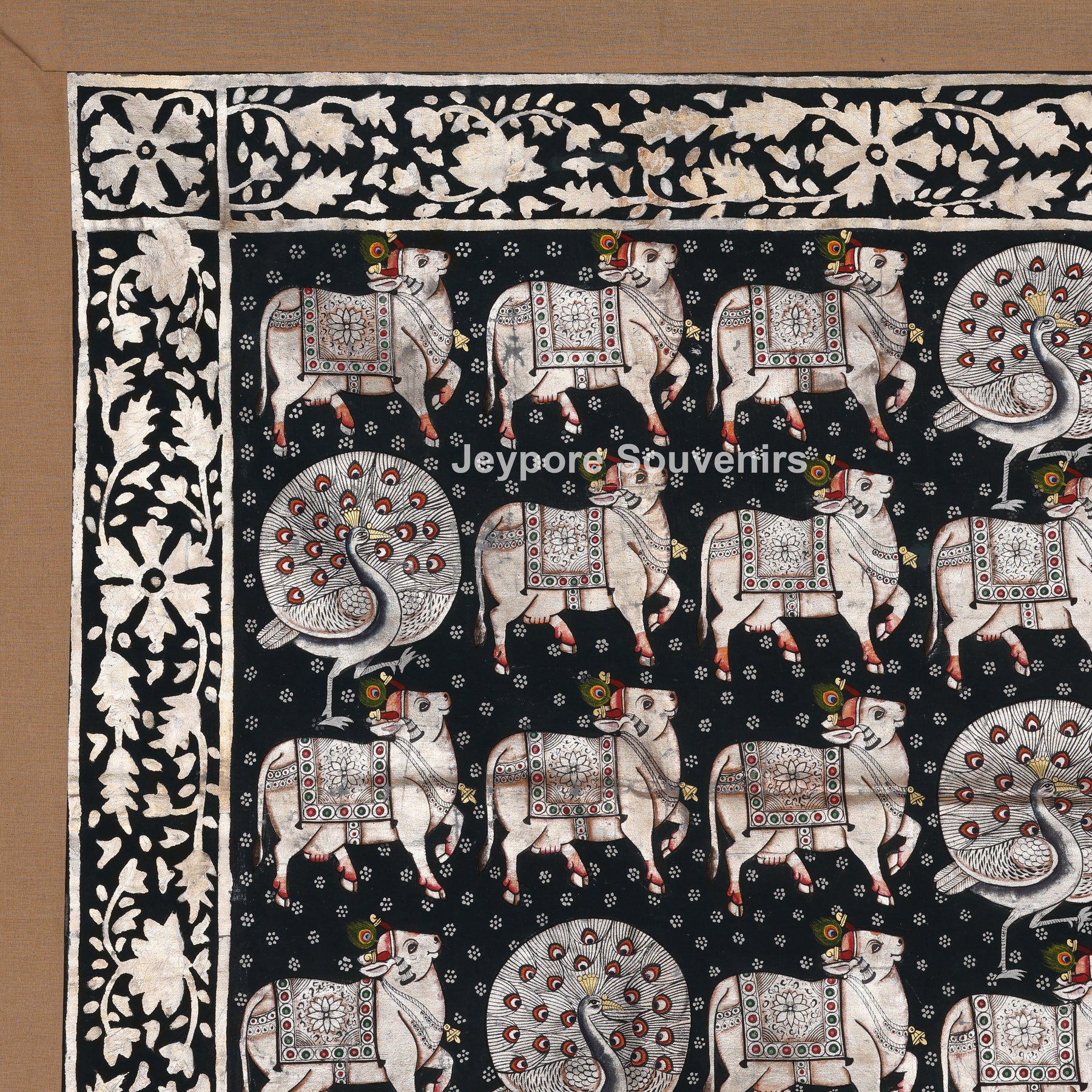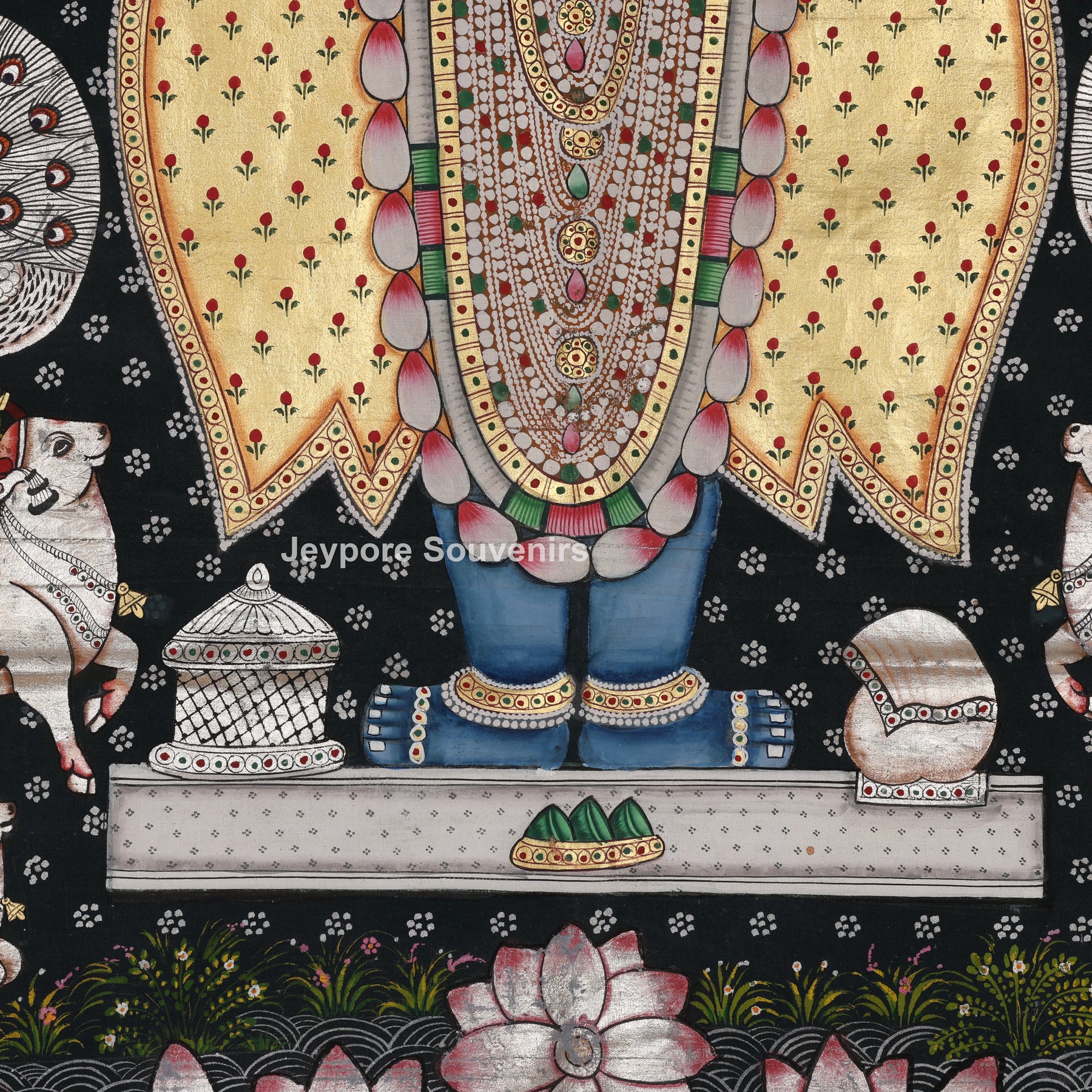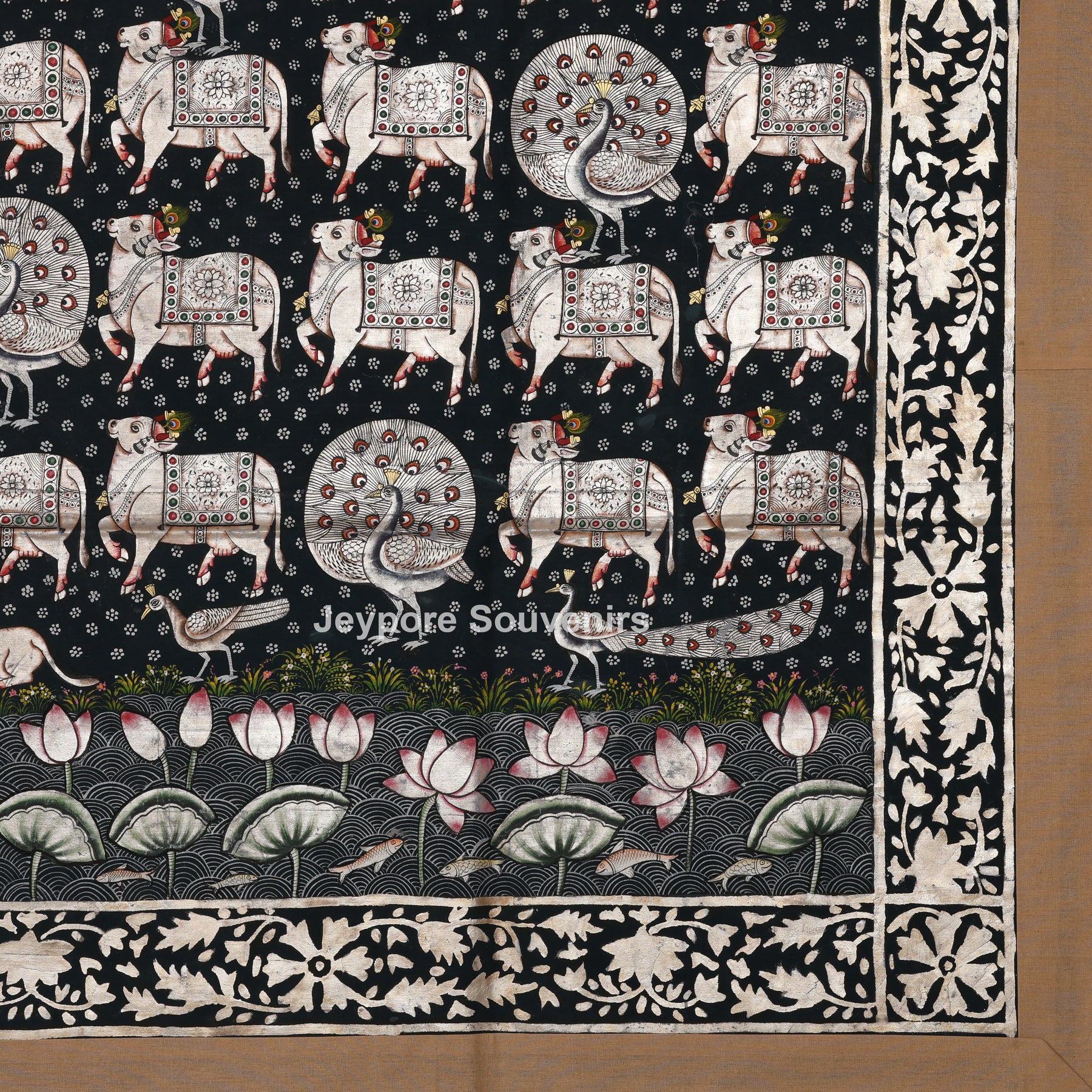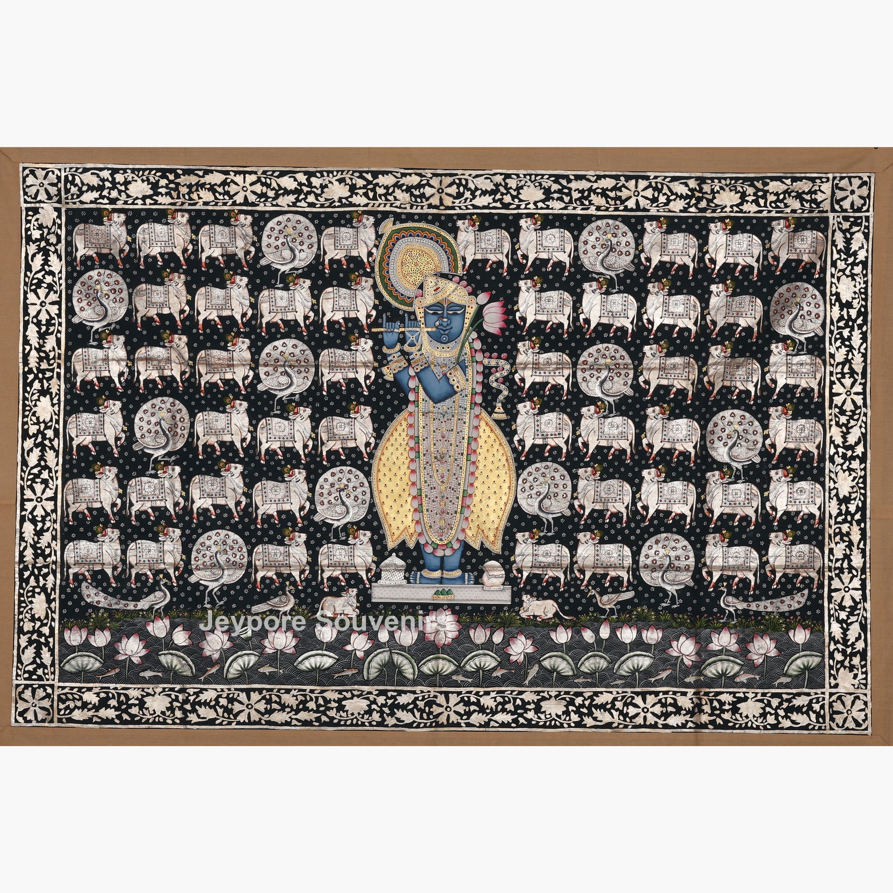 Graceful hand-painted Pichwai piece showcases Shrinathji poised tranquilly within a harmonious arrangement of sacred cows and peacocks, representing prosperity and celestial safeguarding. Crafted in the classic Nathdwara style of Rajasthan, the artwork is done on premium cotton fabric with natural mineral, stone, and plant-based pigments. Delicate brushwork, intricate decoration, and a harmonious black-and-white backdrop augment its visual richness. Perfect for home shrines, meditation spaces, and traditional interiors, this artwork offers spiritual tranquility, cultural genuineness, and enduring decorative charm.