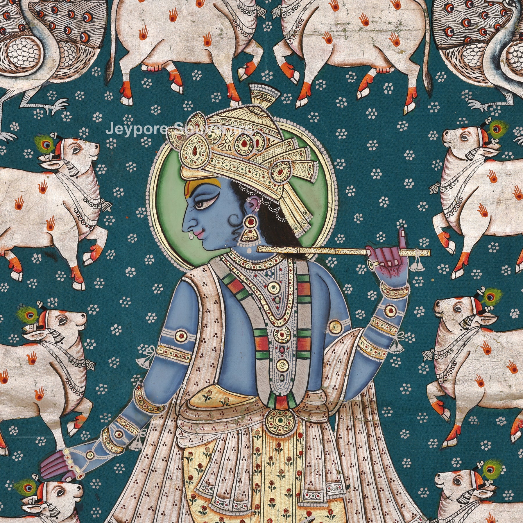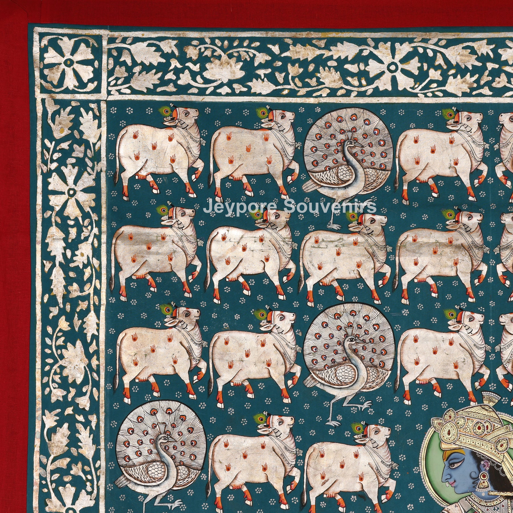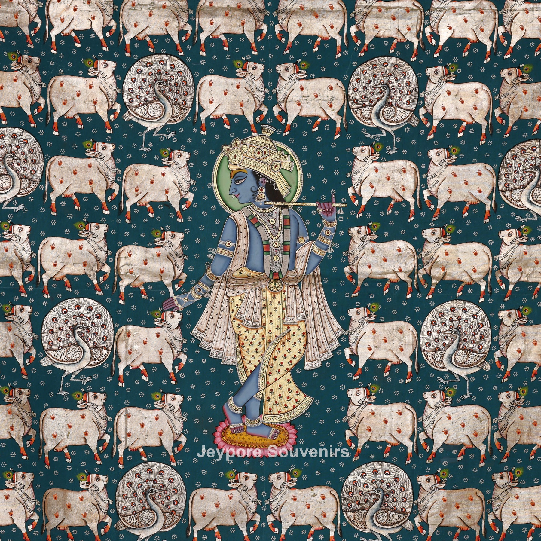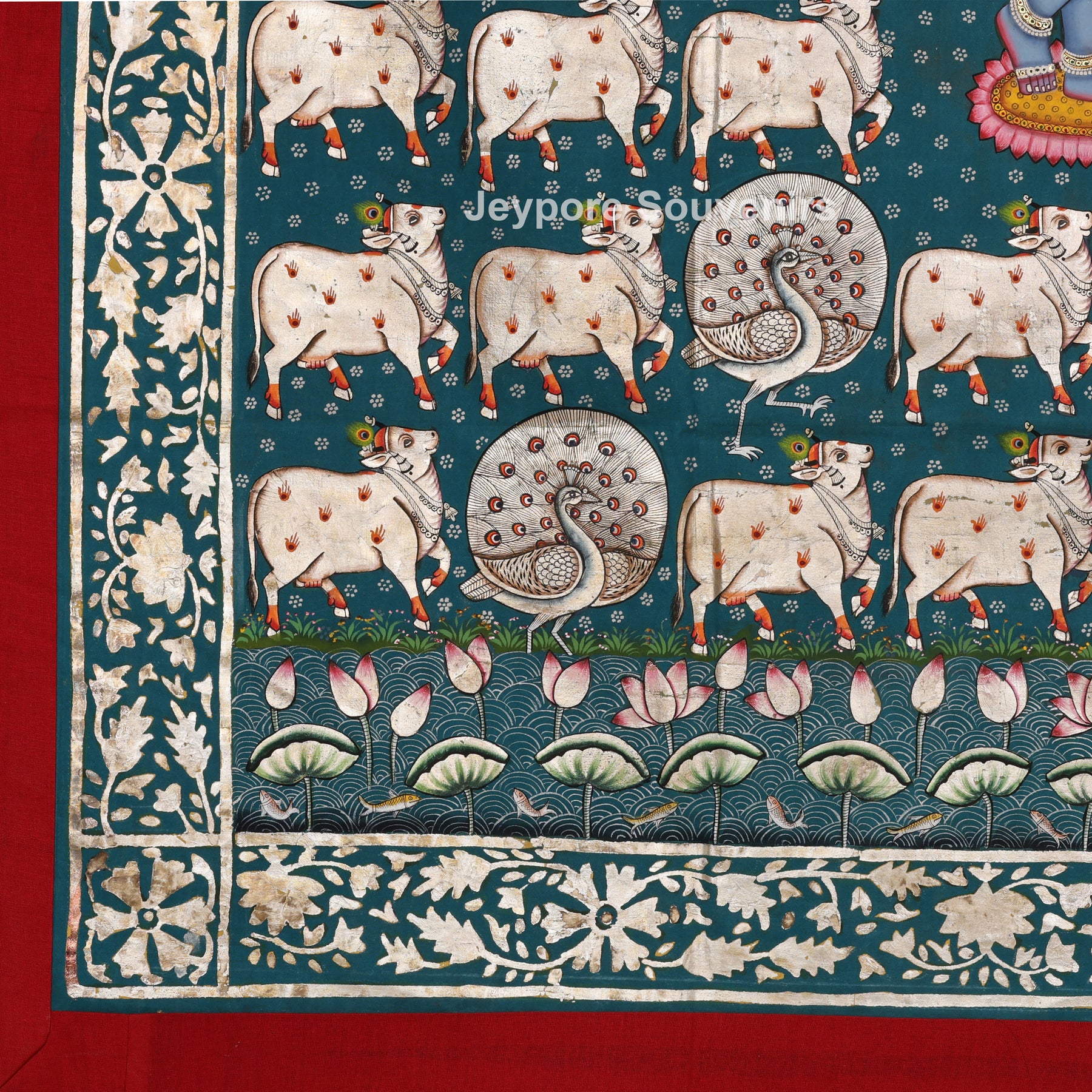 Handcrafted Pichwai Shrinathji with Divine Cows Artwork on Cotton Fabric