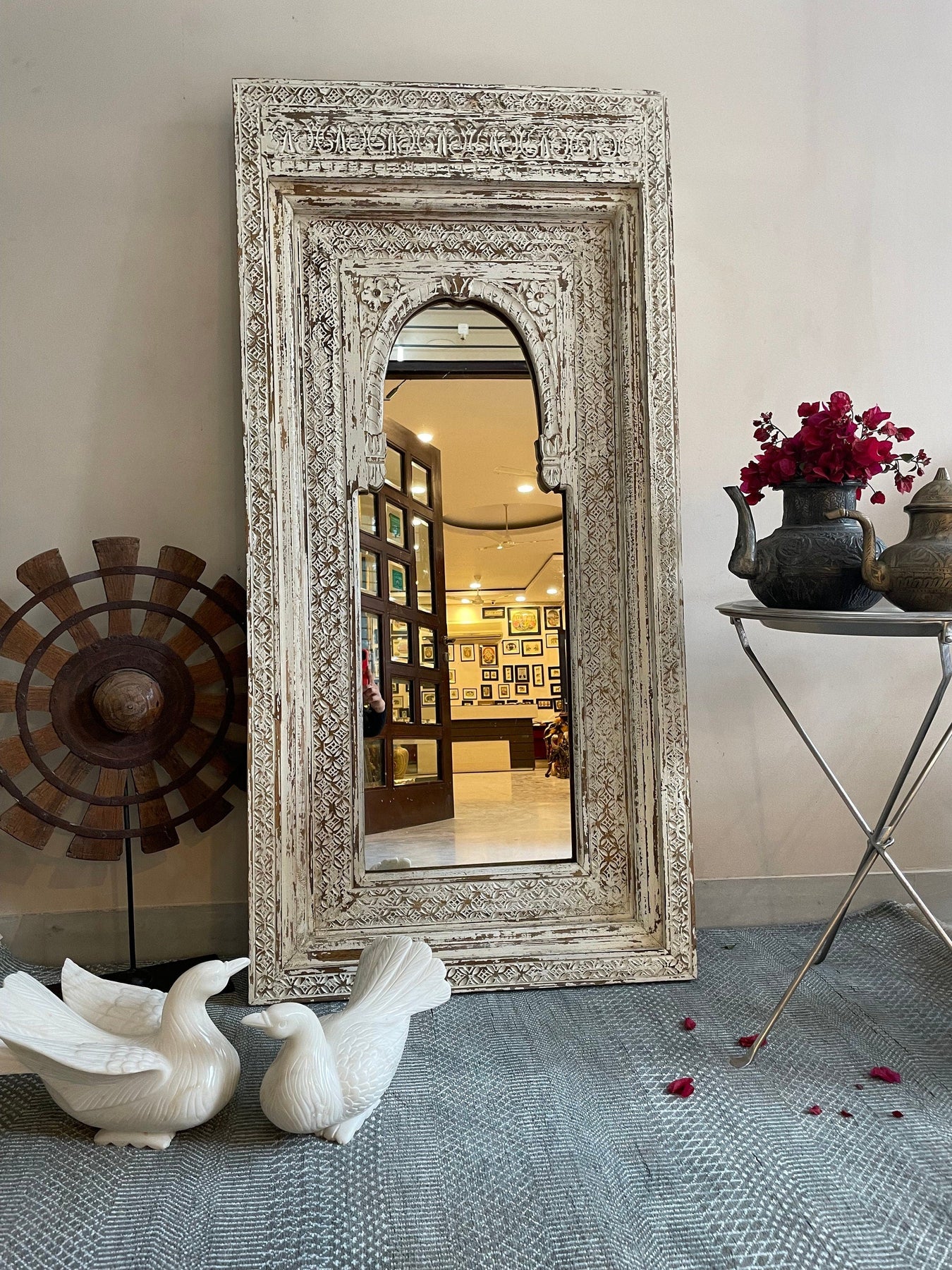 This hand-carved long-standing vanity mirror frame is a perfect blend of elegance and functionality. Crafted with exquisite detailing, it features a distressed natural finish that highlights the beauty of the wood and adds a rustic charm to your space. Designed to stand tall, this mirror frame is ideal for bedrooms, dressing areas, or walk-in closets, offering both practicality and style. Its timeless design and natural texture make it a versatile piece that complements a variety of interior dΓ©cor themes, from classic to contemporary.